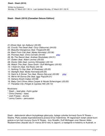 Slash - Slash (2010) Written by bluesever Monday, 07 March 2011 09:14 - Last Updated Monday, 07 March 2011 09:19 Slash - Slash (2010) [Canadian Deluxe Edition] 01.Ghost (feat. Ian Astbury) (03:35) 02. Crucify The Dead (feat. Ozzy Osbourne) (04:03) 03. Beautiful Dangerous (feat. Fergie)(04:38) 04. Back From Cali (feat. Myles Kennedy) (03:36) 05. Promise (feat. Chris Cornell) (04:40) play 06. By The Sword (feat. Andrew Stockdale) (04:51) 07. Gotten (feat. Adam Levine) (05:03) 08. Doctor Alibi (feat. Lemmy Kilmeister) (03:10) 09. Watch This (feat. Dave Grohl / Duff McKagan) (03:52) 10. I Hold On (feat. Kid Rock) (04:18) 11. Nothing To Say (feat. M Shadows) (05:25) 12. Starlight (feat. Myles Kennedy)(05:25) 13. Saint Is A Sinner Too (feat. Rocco DeLuca) (03:28) play 14. We're All Gonna Die (feat. Iggy Pop)(04:31) 15. Sahara (Koshi Inaba) (03:58) 16. Baby Can't Drive (Alice Cooper & Nicole Scherzinger) (03:20) 17. Paradise City (Fergie & Cypress Hill) (05:14) Musicians: * Slash – lead gitar, rhytm guitar * Chris Chaney – bass * Josh Freese – drums * Lenny Castro – percussion Slash - debiutancki album brytyjskiego gitarzysty, byłego członka formacji Guns N' Roses – Slasha. Płyta została wyprodukowana przeza Erica Valentinea. W nagraniach wzięli udział liczni goście w tym byli muzycy Guns N' Roses - Izzy Stradlin, Duff McKagan oraz Steven Adler. Wydawnictwo ukazało się 31 marca 2010 roku w Japonii, a następnie w kwietniu w Australii, w 1/2 Slash - Slash (2010) Written by bluesever Monday, 07 March 2011 09:14 - Last Updated Monday, 07 March 2011 09:19 Europie oraz w Stanach Zjednoczonych. Album zadebiutował na 3. miejscu listy Billboard 200 w Stanach Zjednoczonych sprzedając się w przeciągu tygodnia w nakładzie 60 000 egzemplarzy. Z kolei w Nowej Zelandii i Szwecji album zadebiutował na pierwszym miejscu krajowych list sprzedaży. Zarejestrowana w Barefoot Recording w Hollywood w stanie Kalifornia płyta, była promowana singlami "Sahara" i "By the Sword". Slash is the eponymous debut solo album by former Guns N' Roses and current Velvet Revolver guitarist Slash. The album was produced by Eric Valentine and features multiple musicians including four of the five members of the Appetite for Destruction era Guns N' Roses lineup: Slash, Izzy Stradlin, Duff McKagan and Steven Adler. Vocalist Axl Rose is the only member of that lineup who does not perform on Slash. Upon release, Slash entered the Billboard 200 charts at number 3 (also at number one on the Rock, Hard Rock, Digital and the Independent Albums Chart) with 61,000 copies sold during the first week. The album also debuted at number one in Canada, Austria, New Zealand and Sweden while it also broke into the top 20 in Germany, Finland, Australia, France, Norway, Poland and Switzerland. The album's first single, "By the Sword" (feat. Andrew Stockdale) peaked at number 41 on the Rock Songs Chart and number 78 on the Canadian Hot 100. "Beautiful Dangerous" (feat. Fergie) charted at number 11 and number 58 on the Heatseekers Songs and Canadian Hot 100. The cover of "Paradise City" (feat. Fergie & Cypress Hill) also charted on the Canadian Hot 100 at number 75. download back 2/2
