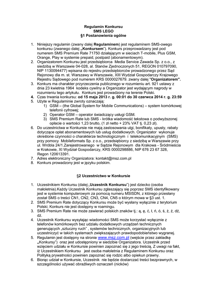 Regulamin Konkursu SMS LEGO §1 Postanowienia ogólne 1. Niniejszy regulamin (zwany dalej Regulaminem) jest regulaminem SMS-owego konkursu (zwanego dalej „Konkursem”). Konkurs przeprowadzany jest pod numerem SMS Premium Rate 71750 działającym w sieciach T-mobile, Plus GSM, Orange, Play w systemie prepaid, postpaid (abonamentowym). 2. Organizatorem Konkursu jest przedsiębiorca Media Service Zawada Sp. z o.o., z siedzibą w Warszawie 04-028, al. Stanów Zjednoczonych 51, REGON 010797090, NIP 1130094477) wpisana do rejestru przedsiębiorców prowadzonego przez Sąd Rejonowy dla m. st. Warszawy w Warszawie, XIII Wydział Gospodarczy Krajowego Rejestru Sądowego pod numerem KRS 0000027679. zwany dalej "Organizatorem". 3. Konkurs ma charakter przyrzeczenia publicznego w rozumieniu art. 921 ustawy z dnia 23 kwietnia 1964 kodeks cywilny a Organizator jest wydającym nagrody w rozumieniu tego artykułu. Konkurs jest prowadzony na terenie Polski. 4. Czas trwania konkursu: od 15 maja 2013 r. g. 00:01 do 30 czerwca 2014 r. g. 23:59 5. Użyte w Regulaminie zwroty oznaczają: 1) GSM – (the Global System for Mobile Communications) – system komórkowej telefonii cyfrowej; 2) Operator GSM – operator świadczący usługi GSM. 3) SMS Premium Rate lub SMS - krótka wiadomość tekstowa o podwyższonej opłacie o wartości 1,23 brutto, (1 zł netto + 23% VAT tj. 0,23 zł). 6. Do uczestnictwa w Konkursie nie mają zastosowania ulgi, bonifikaty, upusty, rabaty dotyczące opłat abonamentowych lub usług dodatkowych. Organizator wykonuje określone czynności o charakterze technologicznym i telekomunikacyjnym (SMS) przy pomocy Mobileformats Sp. z o.o., przedsiębiorcy z siedzibą w Warszawie przy ul. Wróbla 24/1.Zarejestrowanego w Sądzie Rejonowym dla Krakowa - Śródmieścia w Krakowie, XI Wydział Gospodarczy, KRS 0000298886, NIP 676 23 67 328, Regon 120613391. 7. Adres elektroniczny Organizatora: [email protected] 8. Konkurs prowadzony jest w języku polskim. §2 Uczestnictwo w Konkursie 1. Uczestnikiem Konkursu (dalej:„Uczestnik Konkursu”) jest dziecko (osoba małoletnia).Każdy Uczestnik Konkursu zgłaszający się poprzez SMS identyfikowany jest w systemie komputerowym za pomocą numeru MSISDN, z którego przesłany został SMS o treści CN1, CN2, CN3, CN4, CN5 o którym mowa w §3 ust. 1. 2. SMS Premium Rate dotyczący Konkursu może być wysłany wyłącznie z terytorium Polski; Konkurs nie jest dostępny w roamingu. 3. SMS Premium Rate nie może zawierać polskich znaków tj.: ą, ę, ć, ł, ń, ó, ś, ż, ź, dź, dż. 4. Uczestnik Konkursu wysyłając wiadomości SMS może korzystać wyłącznie z telefonów komórkowych bez udziału dodatkowych urządzeń technicznych generujących „sztuczny ruch” , systemów technicznych, organizacyjnych lub uczestniczyć w takich systemach zwiększających prawdopodobieństwo wygranej. 5. Regulamin jest dostępny na stronie www.msz.com.pl (wejście przez zakładkę „Konkursy”) oraz jest udostępniony w siedzibie Organizatora. Uczestnik przed wzięciem udziału w Konkursie powinien zapoznać się z jego treścią, Z uwagi na fakt, iż Uczestnikiem Konkursu jest osoba małoletnia z Regulaminem Konkursu oraz Polityką prywatności powinien zapoznać się rodzic albo opiekun prawny. 6. Biorąc udział w Konkursie, Uczestnik nie będzie dostarczać treści bezprawnych, w szczególności używać obraźliwych oznaczeń (nicków) §3 Przystąpienie do Konkursu 1. Aby wziąć udział w Konkursie należy: a) wysłać w okresie trwania Konkursu SMS na numer Premium Rate 71750 z odpowiedzią na zadanie konkursowe: Napisz krótką rymowankę na cześć wakacji. 2. Przykładowa treść wiadomości SMS, powinna wyglądać następująco: „CN1.ODPOWIEDŹ”. Uznaje się również małe litery w treści wiadomości. 3. Całkowity koszt jednego SMS, wysłanego na numer Premium Rate 71750, to 1,23 brutto, (1 zł netto + 23% VAT tj. 0,23 zł) za 160 znaków, we wszystkich sieciach Operatorów GSM. Uczestnik nie ponosi żadnych innych kosztów. 4. Uczestnik aby brać udział w Konkursie powinien posiadać telefon komórkowy, z którego można wysłać SMS w sieciach T-mobile, Plus GSM, Orange, Play w systemie prepaid, postpaid (abonamentowym). §4 Zasady Konkursu 1. Każdy Uczestnik może wysłać w Konkursie dowolną liczbę SMS-ów aby zwiększyć swoje szanse w Konkursie. Jeden Uczestnik może uzyskać tylko jedną nagrodę w danej edycji Konkursu. 2. Konkurs polega na wysłaniu odpowiedzi na zadanie konkursowe podane w Regulaminie i nośnikach reklamowych. 3. Jeden numer telefonu MSISDN może być wykorzystany do udziału w Konkursie tylko przez jednego Uczestnika. 4. Po wysłaniu przez Uczestnika wiadomości SMS o treści zgodnej z treścią zawartą w § 3 ust. 1, Uczestnik otrzyma od potwierdzenie udziału w Konkursie w formie zwrotnej wiadomości SMS o treści: „Dziękujemy za udział w Konkursie. Organizator skontaktuje się z Tobą w przypadku wygrania nagrody w terminie 14 dni od zakończenia Konkursu”. §5 Nagrody 1. Nagrodami są a) 3 książki Kacper Niewypał ufundowane przez Społeczny Instytut Wydawniczy „Znak” o wartości jednostkowej 50 zł brutto; Kod: CN1, b) 5 filmów na DVD Turbo ufundowanych przez firmę Imperial Cinepix Sp. z o.o. o wartości jednostkowej 30 zł brutto; Kod: CN2 c) 3 zestawy LEGO Star Wars 75040 ufundowane przez firmę LEGO Polska Sp. z o.o. o wartości jednostkowej 130 zł brutto; Kod: CN3, d) 8 zestawów Fly Wheels ufundowanych przez firmę Epee Polska Sp. z o.o. o wartości jednostkowej 55 zł brutto; Kod: CN4, e) 2 zestawy LEGO Technic 42022 ufundowane przez firmę LEGO Polska Sp. z o.o. o wartości jednostkowej 130 zł brutto; Kod: CN5. 2. Łączna wartość nagród wynosi 1390 zł brutto. §6 Zasady przyznawania nagród 1.Spośród nadesłanych przez Uczestników zadań konkursowych zostanie wybranych 21 osób, które przesłały najciekawsze odpowiedzi. Zostaną one Laureatami Konkursu. Liczba Laur