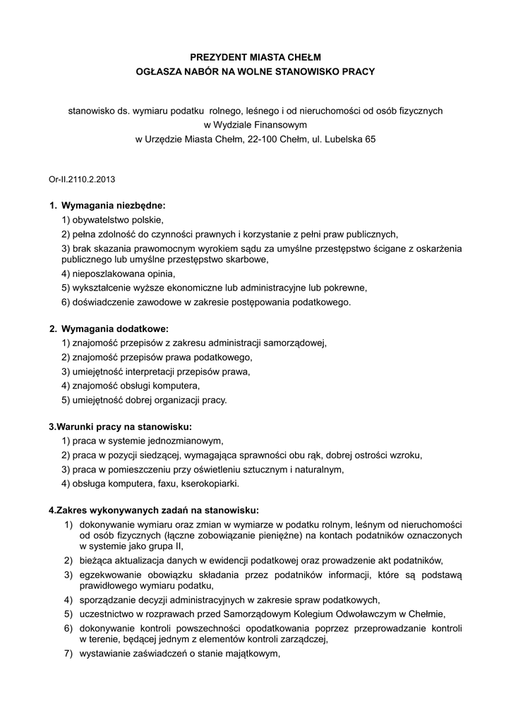 PREZYDENT MIASTA CHEŁM OGŁASZA NABÓR NA WOLNE STANOWISKO PRACY stanowisko ds. wymiaru podatku rolnego, leśnego i od nieruchomości od osób fizycznych w Wydziale Finansowym w Urzędzie Miasta Chełm, 22-100 Chełm, ul. Lubelska 65 Or-II.2110.2.2013 1. Wymagania niezbędne: 1) obywatelstwo polskie, 2) pełna zdolność do czynności prawnych i korzystanie z pełni praw publicznych, 3) brak skazania prawomocnym wyrokiem sądu za umyślne przestępstwo ścigane z oskarżenia publicznego lub umyślne przestępstwo skarbowe, 4) nieposzlakowana opinia, 5) wykształcenie wyższe ekonomiczne lub administracyjne lub pokrewne, 6) doświadczenie zawodowe w zakresie postępowania podatkowego. 2. Wymagania dodatkowe: 1) znajomość przepisów z zakresu administracji samorządowej, 2) znajomość przepisów prawa podatkowego, 3) umiejętność interpretacji przepisów prawa, 4) znajomość obsługi komputera, 5) umiejętność dobrej organizacji pracy. 3.Warunki pracy na stanowisku: 1) praca w systemie jednozmianowym, 2) praca w pozycji siedzącej, wymagająca sprawności obu rąk, dobrej ostrości wzroku, 3) praca w pomieszczeniu przy oświetleniu sztucznym i naturalnym, 4) obsługa komputera, faxu, kserokopiarki. 4.Zakres wykonywanych zadań na stanowisku: 1) dokonywanie wymiaru oraz zmian w wymiarze w podatku rolnym, leśnym od nieruchomości od osób fizycznych (łączne zobowiązanie pieniężne) na kontach podatników oznaczonych w systemie jako grupa II, 2) bieżąca aktualizacja danych w ewidencji podatkowej oraz prowadzenie akt podatników, 3) egzekwowanie obowiązku składania przez podatników informacji, które są podstawą prawidłowego wymiaru podatku, 4) sporządzanie decyzji administracyjnych w zakresie spraw podatkowych, 5) uczestnictwo w rozprawach przed Samorządowym Kolegium Odwoławczym w Chełmie, 6) dokonywanie kontroli powszechności opodatkowania poprzez przeprowadzanie kontroli w terenie, będącej jednym z elementów kontroli zarządczej, 7) wystawianie zaświadczeń o stanie majątkowym, 8) weryfikacja sald analitycznych na koncie 221 z syntetyką w zakresie spraw powierzonych, 9) sporządzanie danych do celów sprawozdawczości, 10) sprawdzanie dokumentów pod względem formalno – rachunkowym, 11) przestrzeganie przepisów ustawy Ordynacja podatkowa oraz ustawy o podatkach i opłatach lokalnych i innych przepisów prawa podatkowego, 12) przestrzeganie przepisów w sprawie zasad rachunkowości dla prowadzenia ewidencji podatków i opłat, 13) załatwianie interesantów, udzielanie im niezbędnych informacji i wyjaśnień zgodnie ze zgłoszonymi potrzebami w zakresie stanowiska pracy, 14) stosowanie i przestrzeganie przepisów w sprawach dotyczących pomocy publicznej, 15) dokonywanie samokontroli na stanowisku pracy, 16) ochrona bazy danych w ewidencji podatkowej. 5.Wskaźnik zatrudnienia osób niepełnosprawnych w Urzędzie w miesiącu poprzedzającym datę upublicznienia ogłoszenia wynosi: 7,43. 6.Wymagane dokumenty aplikacyjne: 1) życiorys (CV), 2) list motywacyjny, 3) kserokopia dokumentu poświadczającego wykształcenie (dyplom lub zaświadczenie o stanie odbytych studiów), 4) kwestionariusz osobowy, 5) inne dodatkowe dokumenty o posiadanych kwalifikacjach i umiejętnościach (kursy, szkolenia, studia podyplomowe), 6) referencje (kserokopia), 7) oświadczenie o braku skazania prawomocnym wyrokiem sądu za ścigane z oskarżenia publicznego i umyślnie popełnione przestępstwo lub przestępstwo skarbowe, a w przypadku wygrania konkursu przed zatrudnieniem dołączyć należy zapytanie o udzielenie informacji o osobie, 8) kserokopie świadectw pracy, 9) oświadczenie o posiadaniu pełnej zdolności do czynności prawnych oraz o korzystaniu z pełni praw publicznych, 10) kserokopia dowodu osobistego, 11) kserokopia dokumentu potwierdzającego niepełnosprawność. Brak podpisu na ww. oświadczeniach i innych dokumentach będzie uznany za brak wymagań formalnych. Wymagane dokumenty aplikacyjne należy składać osobiście (w zaklejonej kopercie) w Urzędzie Miasta Chełm, ul. Lubelska 65, pokój 27 lub pocztą na adres Urzędu z dopiskiem: Dotyczy naboru na stanowisko ds. wymiaru podatku rolnego, leśnego i od nieruchomości od osób fizycznych w Wydziale Finansowym w terminie do dnia 14 listopada 2013 r. Aplikacje, które wpłyną do Urzędu po wyżej określonym terminie nie będą rozpatrywane. W przypadku ofert wysłanych pocztą decyduje data stempla. Ogłoszenie naboru na stanowisko ds. wymiaru podatku Finansowym rolnego, leśnego i od nieruchomości od osób fizycznych w Wydziale 2z3 Informacja o wyniku naboru będzie umieszczana na stronie internetowej Biuletynu Informacji Publicznej www.umchelm.bip.lubelskie.pl oraz na tablicy informacyjnej przy ul. Lubelskiej 65. Wymagane dokumenty aplikacyjne: list motywacyjny, szczegółowe CV (z uwzględnieniem dokładnego przebiegu kariery zawodowej), powinny być opatrzone klauzulą: Wyrażam zgodę na przetwarzanie moich danych osobowych zawartych w ofercie pracy dla potrzeb niezbędnych do realizacji procesu rekrutacji zgodnie z ustawą z dnia 29 sierpnia 1997 roku o ochronie danych osobowych (Dz. U. z 2002r. Nr 101, poz. 926 z późn. zm.) oraz ustawą z dnia 21 listopada 2008 roku o pracownikach samorządowych (Dz. U. Nr 223, poz. 1458 z późn. zm.). PREZYDENT MIASTA Chełm, dnia 2013-11- 04 Ogłoszenie naboru na stanowisko ds. wymiaru podatku Finansowym mgr inż. Agata Fisz rolnego, leśnego i od nieruchomości od osób fizycznych w Wydziale 3z3