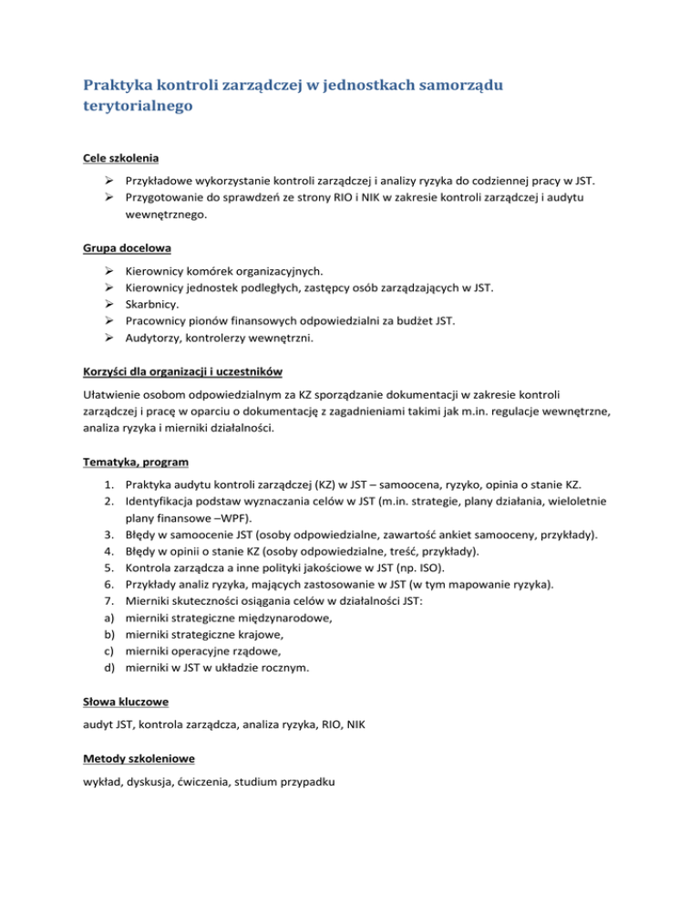 Praktyka kontroli zarządczej w jednostkach samorządu terytorialnego Cele szkolenia Przykładowe wykorzystanie kontroli zarządczej i analizy ryzyka do codziennej pracy w JST. Przygotowanie do sprawdzeń ze strony RIO i NIK w zakresie kontroli zarządczej i audytu wewnętrznego. Grupa docelowa Kierownicy komórek organizacyjnych. Kierownicy jednostek podległych, zastępcy osób zarządzających w JST. Skarbnicy. Pracownicy pionów finansowych odpowiedzialni za budżet JST. Audytorzy, kontrolerzy wewnętrzni. Korzyści dla organizacji i uczestników Ułatwienie osobom odpowiedzialnym za KZ sporządzanie dokumentacji w zakresie kontroli zarządczej i pracę w oparciu o dokumentację z zagadnieniami takimi jak m.in. regulacje wewnętrzne, analiza ryzyka i mierniki działalności. Tematyka, program 1. Praktyka audytu kontroli zarządczej (KZ) w JST – samoocena, ryzyko, opinia o stanie KZ. 2. Identyfikacja podstaw wyznaczania celów w JST (m.in. strategie, plany działania, wieloletnie plany finansowe –WPF). 3. Błędy w samoocenie JST (osoby odpowiedzialne, zawartość ankiet samooceny, przykłady). 4. Błędy w opinii o stanie KZ (osoby odpowiedzialne, treść, przykłady). 5. Kontrola zarządcza a inne polityki jakościowe w JST (np. ISO). 6. Przykłady analiz ryzyka, mających zastosowanie w JST (w tym mapowanie ryzyka). 7. Mierniki skuteczności osiągania celów w działalności JST: a) mierniki strategiczne międzynarodowe, b) mierniki strategiczne krajowe, c) mierniki operacyjne rządowe, d) mierniki w JST w układzie rocznym. Słowa kluczowe audyt JST, kontrola zarządcza, analiza ryzyka, RIO, NIK Metody szkoleniowe wykład, dyskusja, ćwiczenia, studium przypadku Prowadzący Janusz Kobeszko – czynnie pracuje w JST, był m.in. wiceburmistrzem, doświadczony audytor sektora publicznego, wykładowca uniwersytecki, przeprowadził wiele szkoleń na terenie województw wielkopolskiego i lubuskiego, audytuje JST oraz projekty z dotacji unijnych, autor wielu artykułów w prasie z zagadnień prawa i administracji oraz strategii rozwoju. Czas trwania szkolenia 1 dzień, 4 godziny lekcyjne + 1 przerwa na kawę (15 minut) i 1 przerwa na lunch (30 minut) Termin 22 kwietnia 2014 r. (wtorek) Cena 399 zł + 23% VAT. W przypadku finansowania szkolenia w całości ze środków publicznych, jest ono zwolnione z podatku VAT Cena szkolenia obejmuje również materiały szkoleniowe, poczęstunek podczas przerwy kawowej i posiłek w czasie przerwy obiadowej (w formie lunchboxa). W przypadku zgłoszenia przez Zamawiającego co najmniej 2 osób, rabat wynosi 10%.