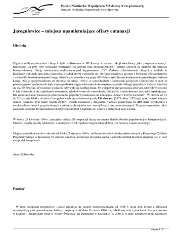 Polsko-Niemiecka Współpraca Młodzieży www.pnwm.org Deutsch-Polnisches Jugendwerk www.dpjw.org Jarogniewice – miejsca upamiętniające ofiary eutanazji Historia Zagłada osób nieuleczalnie chorych była realizowana w III Rzeszy w ramach akcji określanej jako program eutanazji. Kierowano się przy tym wyłącznie względami socjalnymi oraz ekonomicznymi i uznano chorych za element dla państwa bezwartościowy. Akcję uśmiercania realizowano pod kryptonimem „T4”. Zadanie zlikwidowania chorych z zakładu w Kościanie wykonała specjalna jednostka, w skład której wchodziło ok. 20 funkcjonariuszy gestapo z Poznania i 60 żandarmów – zwana SS-Sonderkommando Lange od nazwiska dowódcy tej grupy SS-Untersturmführera/ komisarza kryminalnego Herberta Lange. Akcję przeprowadzono od stycznia do lutego 1940 r. w samochodach – komorach gazowych. Uśmiercano w nich za pomocą gazów spalinowych bądź czystego tlenku węgla wtłaczanych do wnętrza szczelnie obitego pojazdu, w którym mieściło się ok. 50-70 ofiar. Wywożenie więźniów odbywało się według planu. Po wstępnym przygotowaniu chorych, których wywożono w ich własnych, a nie szpitalnych ubraniach, załadowywano do samochodu, niektórym z nich dawano zastrzyki uspakajające. Dla zamaskowania właściwego przeznaczenia pojazdu wymalowano na nim napis „Kaiser’s Caffee Geschäft”. W okresie od 15 do 22 stycznia 1940 r. do lasu w Jarogniewicach przywieziono łącznie 534 chorych [297 kobiet i 237 mężczyzn], wśród których oprócz Polaków było także trzech Żydów, dwóch Niemców i Rosjanka. Później pochowano tu 250 osób psychicznie i nieuleczalnie chorych przywiezionych z północnych rejonów tzw. starej Rzeszy i tu zamordowanych. Tu prawdopodobnie także zakopano szczątki 48 upośledzonych umysłowo kobiet z Zakładu św. Józefa z Osiecznej koło Leszna. W końcu 25 kwietnia 1944 r. specjalny oddział SS rozpoczął akcję zacierania śladów zbrodni popełnionej w Jarogniewicach. Masowe mogiły zostały odsłonięte, a następnie zwłoki spalono najprawdopodobniej za pomocą wapna gaszonego. Mogiły pomordowanych w okresie od 15 do 22 stycznia 1940 r. osób psychicznie i nieuleczalnie chorych z Krajowego Zakładu Psychiatrycznego w Kościanie [w okresie okupacji noszącego oficjalną nazwę Landesheilanstalt Kosten] znajdują się w lesie nieopodal Jarogniewic. Anna Ziółkowska Pamięć W lesie nieopodal Jarogniewic , gdzie znajdują się mogiły pomordowanych, od 1946 r. stoją dwa krzyże z tablicami upamiętniającymi pomordowane kobiety i mężczyzn. W dniu 31 marca 1946 r. symboliczną urnę z prochami ofiar pochowano w krypcie – Mauzoleum Ofiar II Wojny Światowej na cmentarzu w Kościanie. W 2004 r. w lesie jarogniewickim odsłonięto strona 1 / 2 Polsko-Niemiecka Współpraca Młodzieży www.pnwm.org Deutsch-Polnisches Jugendwerk www.dpjw.org granitowy głaz narzutowy z wyrytą inskrypcją „Pamięci spoczywających w lesie pod Jarogniewicami Polaków, Żydów i Niemców zamordowanych przez hitlerowców w 1940 r.”. I napis poniżej: „«Mówienie jest wysiłkiem: nie zdoła człowiek wyrazić wszystkiego słowami» ks. Koholeta 1:8. Anna Ziółkowska Informacje praktyczne Jarogniewice – miejsca upamiętniające ofiary eutanazji Dojazd: Jarogniewice leżą przy drodze międzynarodowej E261, ok. 8 km na północ od Kościana; pomnik (głaz) w lesie koło wsi. Jarogniewice, Polska strona 2 / 2 Powered by TCPDF (www.tcpdf.org)