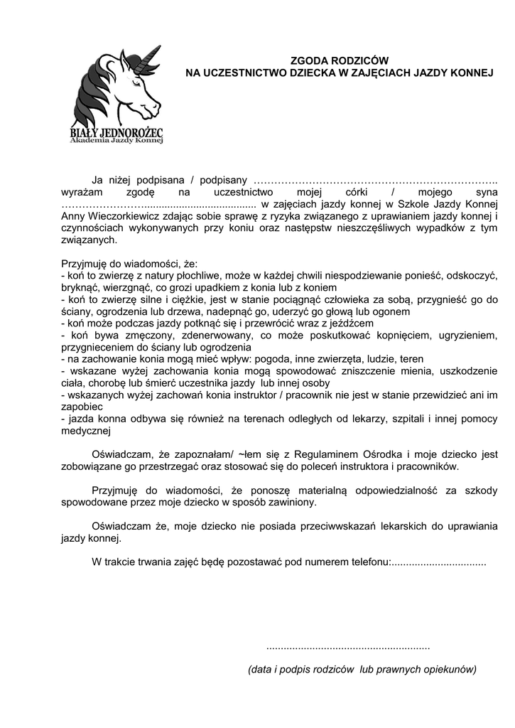 ZGODA RODZICÓW NA UCZESTNICTWO DZIECKA W ZAJĘCIACH JAZDY KONNEJ Ja niżej podpisana / podpisany …………………………………………………………….. wyrażam zgodę na uczestnictwo mojej córki / mojego syna ……………………....................................... w zajęciach jazdy konnej w Szkole Jazdy Konnej Anny Wieczorkiewicz zdając sobie sprawę z ryzyka związanego z uprawianiem jazdy konnej i czynnościach wykonywanych przy koniu oraz następstw nieszczęśliwych wypadków z tym związanych. Przyjmuję do wiadomości, że: - koń to zwierzę z natury płochliwe, może w każdej chwili niespodziewanie ponieść, odskoczyć, bryknąć, wierzgnąć, co grozi upadkiem z konia lub z koniem - koń to zwierzę silne i ciężkie, jest w stanie pociągnąć człowieka za sobą, przygnieść go do ściany, ogrodzenia lub drzewa, nadepnąć go, uderzyć go głową lub ogonem - koń może podczas jazdy potknąć się i przewrócić wraz z jeźdźcem - koń bywa zmęczony, zdenerwowany, co może poskutkować kopnięciem, ugryzieniem, przygnieceniem do ściany lub ogrodzenia - na zachowanie konia mogą mieć wpływ: pogoda, inne zwierzęta, ludzie, teren - wskazane wyżej zachowania konia mogą spowodować zniszczenie mienia, uszkodzenie ciała, chorobę lub śmierć uczestnika jazdy lub innej osoby - wskazanych wyżej zachowań konia instruktor / pracownik nie jest w stanie przewidzieć ani im zapobiec - jazda konna odbywa się również na terenach odległych od lekarzy, szpitali i innej pomocy medycznej Oświadczam, że zapoznałam/ ~łem się z Regulaminem Ośrodka i moje dziecko jest zobowiązane go przestrzegać oraz stosować się do poleceń instruktora i pracowników. Przyjmuję do wiadomości, że ponoszę materialną odpowiedzialność za szkody spowodowane przez moje dziecko w sposób zawiniony. Oświadczam że, moje dziecko nie posiada przeciwwskazań lekarskich do uprawiania jazdy konnej. W trakcie trwania zajęć będę pozostawać pod numerem telefonu:................................. ......................................................... (data i podpis rodziców lub prawnych opiekunów)