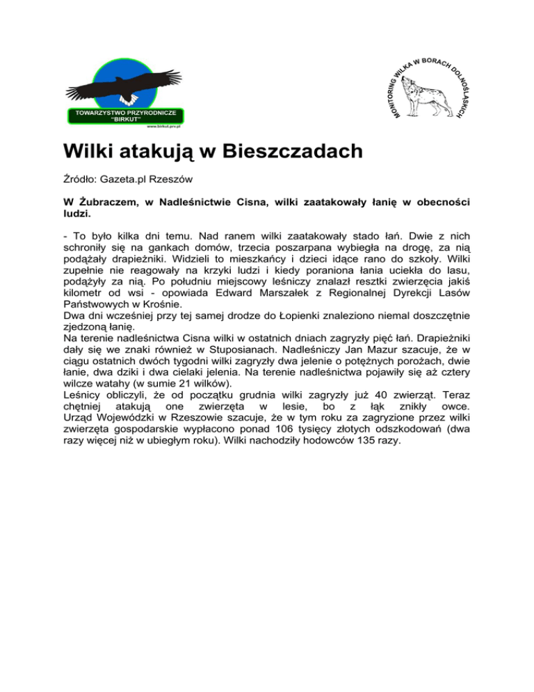 Wilki atakują w Bieszczadach Źródło: Gazeta.pl Rzeszów W Żubraczem, w Nadleśnictwie Cisna, wilki zaatakowały łanię w obecności ludzi. - To było kilka dni temu. Nad ranem wilki zaatakowały stado łań. Dwie z nich schroniły się na gankach domów, trzecia poszarpana wybiegła na drogę, za nią podążały drapieżniki. Widzieli to mieszkańcy i dzieci idące rano do szkoły. Wilki zupełnie nie reagowały na krzyki ludzi i kiedy poraniona łania uciekła do lasu, podążyły za nią. Po południu miejscowy leśniczy znalazł resztki zwierzęcia jakiś kilometr od wsi - opowiada Edward Marszałek z Regionalnej Dyrekcji Lasów Państwowych w Krośnie. Dwa dni wcześniej przy tej samej drodze do Łopienki znaleziono niemal doszczętnie zjedzoną łanię. Na terenie nadleśnictwa Cisna wilki w ostatnich dniach zagryzły pięć łań. Drapieżniki dały się we znaki również w Stuposianach. Nadleśniczy Jan Mazur szacuje, że w ciągu ostatnich dwóch tygodni wilki zagryzły dwa jelenie o potężnych porożach, dwie łanie, dwa dziki i dwa cielaki jelenia. Na terenie nadleśnictwa pojawiły się aż cztery wilcze watahy (w sumie 21 wilków). Leśnicy obliczyli, że od początku grudnia wilki zagryzły już 40 zwierząt. Teraz chętniej atakują one zwierzęta w lesie, bo z łąk znikły owce. Urząd Wojewódzki w Rzeszowie szacuje, że w tym roku za zagryzione przez wilki zwierzęta gospodarskie wypłacono ponad 106 tysięcy złotych odszkodowań (dwa razy więcej niż w ubiegłym roku). Wilki nachodziły hodowców 135 razy.
