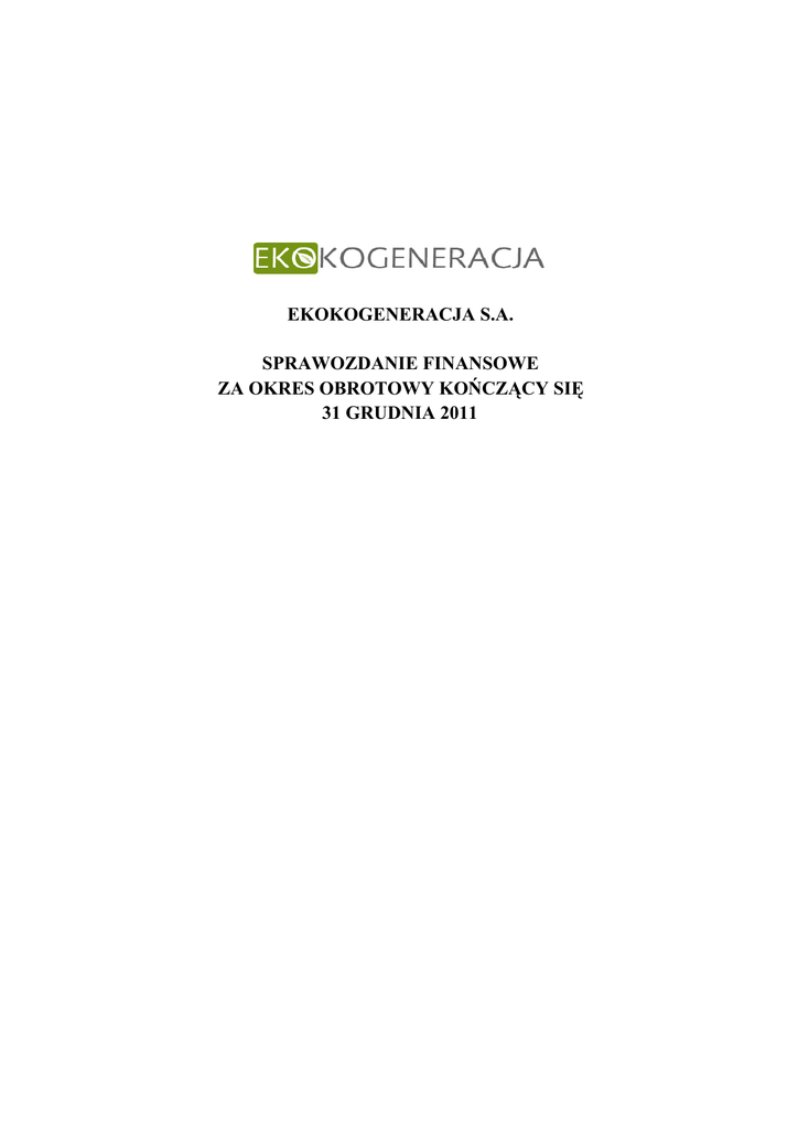 EKOKOGENERACJA S.A. SPRAWOZDANIE FINANSOWE ZA OKRES OBROTOWY KOŃCZĄCY SIĘ 31 GRUDNIA 2011 Ekokogeneracja S.A. Sprawozdanie finansowe za okres obrotowy kończący się 31 grudnia 2011 SPIS TREŚCI OŚWIADCZENIE ZARZĄDU 3 WPROWADZENIE DO SPRAWOZDANIA FINANSOWEGO 4 BILANS 8 RACHUNEK ZYSKÓW I STRAT 12 ZESTAWIENIE ZMIAN W KAPITALE WŁASNYM 14 RACHUNEK AC PRZEPŁYWÓW Ó PIENIĘŻNYCH Ż C 16 DODATKOWE INFORMACJE I OBJAŚNIENIA 18 2 Ekokogeneracja S.A. Sprawozdanie finansowe za okres obrotowy kończący się 31 grudnia 2011 OŚWIADCZENIE ZARZĄDU 2002 r. nr 76, poz. 694) Zarząd Ekokogeneracja S.A. przedstawia sprawozdanie finansowe, na które składa się: 1) wprowadzenie do sprawozdania finansowego; 2) bilans sporządzony na dzień 31 grudnia 2011 r., który po stronie aktywów i pasywów 2.065.110,20 złotych; 3) rachunek zysków i strat za okres od 1 stycznia do 31 grudnia 2011 r. wykazujący stratę netto 680.481,75 złotych; 4) zestawienie zmian w kapitale własnym za okres od 1 stycznia do 31 grudnia 2011 r. 5) rachunek przepływów pieniężnych za okres od 1 stycznia do 31 grudnia 2011 r. wykazujący zwiększenie stanu środków pieniężnych netto na sumę 853.270,98 złotych; W imieniu Spółki: Wojciech Rychlicki - Prezes Zarządu Anna Solarska - Wiceprezes Zarządu Paula Piotrowska - Główny Księgowy Warszawa, dnia 21 lutego 2012 r. 3 Ekokogeneracja S.A. Wprowadzenie do sprawozdania finansowego (wszystkie dane liczbowe przedstawiono w złotych) 1. Dane identyfikujące Spółkę Nazwa Spółki Ekokogeneracja S.A. Siedziba Spółki Al. Jerozolimskie 91, 02-001 Warszawa Rejestracja w Krajowym Rejestrze Sądowym Spółka została wpisana do Krajowego Rejestru Sądowego prowadzonego przez Sąd Rejonowy dla M.St. Warszawy, XII Wydział Gospodarczy Krajowego Rejestru Sądowego, pod numerem KRS 0000364229 w dniu 02.09.2010 i powstała w wyniku przekształcenia spółki Ekokogeneracja Sp. z o.o. w spółkę akcyjną zgodnie z Uchwałą nr 1 Nadzwyczajnego Zgromadzenia Wspólników Ekokogeneracja Sp. z o.o. (KRS 0000321977) z dnia 09.08.2010 r. Spółka Ekokogeneracja Sp. z o.o. będąca poprzednikiem prawnym Ekokogeneracja S.A. w okresie: od 01.01.2010 do 20.01.2010 była zarejestrowna pod nazwą AKW Capital Sp. z o.o., od 21.01.2010 do 19.04.2010 była zarejestrowana pod nazwą Ekokogeneracja I Sp. z o.o. oraz w okresie od 20.04.2010 do 01.09.2010 była zarejestrowana pod nazwą Ekokogeneracja Sp. z o.o. 2. Podstawowy przedmiot i czas działalności Spółki Spółka została utworzona na czas nieokreślony. Według statutu Spółki głównym przedmiotem działania Spółki jest działalność holdingów finansowych, wytwarzanie i zaopatrywanie w pare wodną, gorącą wodę i powietrze do układów klimatyzacyjnych oraz wytwarzanie, przesyłanie, dystrybucja i handel energią elektryczną. 3. Okres objęty sprawozdaniem Sprawozdanie finansowe zostało przygotowane za okres od 1 stycznia do 31 grudnia 2011 r. Dane porównawcze zostały przygotowane za okres od 1 stycznia do 31 grudnia 2010 r. 4. Założenie kontynuacji działalności gospodarczej Sprawozdanie finansowe zostało sporządzone przy założeniu kontynuowania działalności gospodarczej przez Spółkę w okresie 12 miesięcy po dniu bilansowym, czyli 31 grudnia 2012 roku. Zarząd Spółki nie stwierdza na dzień podpisania niniejszego sprawozdania istnienia faktów i okoliczności, które wskazywałyby na zagrożenia dla możliwości kontynuacji działalności przez Spółkę w okresie 12 miesięcy po dniu bilansowym na skutek zamierzonego lub przymusowego zaniechania przez nią dotychczasowej działalności. 4 Ekokogeneracja S.A. Wprowadzenie do sprawozdania finansowego (wszystkie dane liczbowe przedstawiono w złotych) 5. Przyjęte zasady rachunkowości, w tym metody wyceny aktywów i pasywów, pomiary wyniku finansowego oraz sposobu sporządzenia sprawozdania finansowego 5. 1 Format i podstawa sporządzenia sprawozdania finansowego Sprawozdanie finansowe sporządzone zostało w zgodzie z przepisami ustawy o rachunkowości z dnia 29 września 1994 r. (tekst jednolity, Dz. U. z 2002 r. nr 76 poz. 694 z późniejszymi zmianami). Przyjęte przez Spółkę zasady rachunkowości stosowane były w sposób ciągły i są one zgodne z zasadami rachunkowości stosowanymi w poprzednim roku obrotowym. Sprawozdanie finansowe zostało przygotowane zgodnie z konwencją kosztu historycznego. 5. 2 Przychody i koszty Przychody i koszty są rozpoznawane według zasady memoriałowej, tj. w okresach których dotyczą. Spółka prowadzi ewidencję kosztów w układzie rodzajowym oraz sporządza porównawczy wariant rachunku zysków i strat. Przychody uznawane są w takiej wysokości, w jakiej jest prawdopodobne, że Spółka uzyska korzyści ekonomiczne, które można wiarygodnie wycenić. h d ze sprzedaży d Przychody Przychody ze sprzedaży produktów, towarów i materiałów ujmuje się w rachunku zysków i strat, gdy znaczące ryzyko i korzyści wynikające z praw własności do produktów, towarów i materiałów przekazano nabywcy. Przychody obejmują należne lub uzyskane kwoty ze sprzedaży, pomniejszone o podatek od towarów i usług (VAT). Odsetki Przychody z tytułu odsetek są rozpoznawane w momencie ich naliczenia (przy zastosowaniu efektywnej stopy procentowej), jesli ich otrzymanie nie jest wątpliwe. 5. 3 Wartości niematerialne i prawne Wartości niematerialne i prawne są rozpoznawane, jeżeli jest prawdopodobne, że w przyszłości spowodują one wpływ do Spółki korzyści ekonomicznych, które mogą być bezpośrednio powiązane z tymi aktywami. Początkowe ujęcie wartości niematerialnych i prawnych następuje według cen nabycia lub kosztu wytworzenia. Po ujęciu początkowym wartości niematerialne i prawne są wyceniane według cen nabycia lub kosztu wytworzenia pomniejszonych o umorzenie i odpisy z tytułu trwałej utraty wartości. Wartości niematerialne i prawne są amortyzowane liniowo w okresie odpowiadają