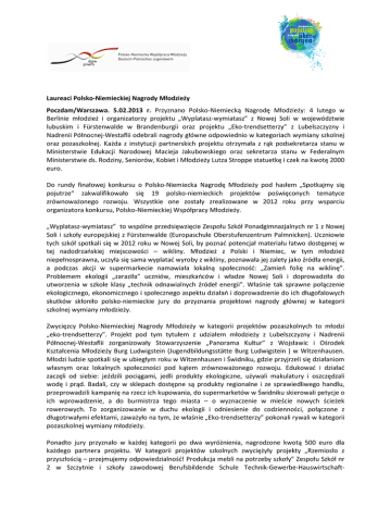 Nagrod Młodzieży Laureaci Polsko-Niemieckiej Nagrody Poczdam/Warszawa. 5.02.2013 .02.2013 r. Przyznano Polsko-Niemiecką Nagrodę Młodzieży: 4 lutego w Berlinie młodzież i organizatorzy projektu „Wyplatasz-wymiatasz” z Nowej Soli S w województwie lubuskim i Fürstenwalde w Brandenburgii oraz projektu „Eko-trendsetterzy” trendsetterzy” z Lubelszczyzny i Nadrenii Północnej-Westaflii odebrali nagrody główne odpowiednio w kategoriach wymiany szkolnej oraz pozaszkolnej. Każda z instytucji partnerskich p projektu otrzymała z rąk podsekretarza stanu w Ministerstwie Edukacji Narodowej Macieja Jakubowskiego oraz sekretarza stanu w Federalnym Ministerstwie ds. Rodziny, Seniorów, Kobiet i Młodzieży Lutza Stroppe statuetkę i czek na kwotę 2000 euro. Do rundy finałowej konkursu o Polsko-Niemiecka Nagrodę Młodzieży pod hasłem „Spotkajmy się pojutrze“ zakwalifikowało się 19 polsko-niemieckich polsko niemieckich projektów poświęconych tematyce zrównoważonego rozwoju. Wszystkie one zostały zrealizowane w 2012 roku przy wsparciu organizatora konkursu, Polsko-Niemieckiej Niemieckiej Współpracy Młodzieży. „Wyplatasz-wymiatasz” sz” to wspólne przedsięwzięcie Zespołu Szkół Ponadgimnazjalnych nr 1 z Nowej Soli i szkoły europejskiej z Fürstenwalde (Europaschule Oberstufenzentrum Palmnicken). Palmnicken) Uczniowie tych szkół spotkali się w 2012 roku w Nowej Soli, by poznać potencjał materiału łatwo dostępnej w tej nadodrzańskiej miejscowości – wikliny.. Młodzież z Polski i Niemiec, w tym młodzież niepełnosprawna, uczyła się sama wyplatać wyroby z wikliny, poznawała jej zalety jako źródła energii, a podczas akcji w supermarkecie namawiała lokalną społeczność: „Zamień folię na wiklinę”. Problemem ekologii „zaraziła” uczniów, mieszkańców i władze Nowej Soli i doprowadziła do utworzenia w szkole klasy „technik odnawialnych źródeł energii”. Właśnie tak sprawne połączenie ekologicznego, ekonomicznego i społecznego aspektu działań i doprowadzenie do ich długofalowych skutków skłoniło polsko-niemieckie niemieckie jury do przyznania projektowi nagrodyy głównej w kategorii szkolnej wymiany młodzieży. Zwycięzcy Polsko-Niemieckiej Niemieckiej Nagrody Młodzieży w kategorii projektów pozaszkolnych to młodzi „eko-trendsetterzy”. Projekt pod tym tytułem z udziałem młodzieży z Lubelszczyzny i Nadrenii Północnej-Westaflii zorganizowały Stowarzyszeniee „Panorama Kultur” z Wojsławic i Ośrodek Kształcenia Młodzieży Burg Ludwigstein (Jugendbildungsstätte Jugendbildungsstätte Burg Ludwigstein ) w Witzenhausen. Młodzi ludzie spotkali się w ubiegłym roku w Witzenhausen Witzenha i Świdniku, gdzie przyjrzeli się działaniom własnym oraz lokalnych społeczności pod kątem zrównoważonego rozwoju.. Edukować i działać zaczęli od siebie: jeździli pociągami, jedli produkty ekologiczne, używali makulatury i oszczędzali wodę i prąd. Badali, czy w sklepach dostępne są produkty regionalne i ze sprawiedliwego sprawi handlu, przeprowadzili kampanię na rzecz ich kupowania, do supermarketów w Świdniku skierowali petycje o ich wprowadzenie, a do burmistrz urmistrza tego miasta – o wyznaczenie w mieście nowych ścieżek rowerowych. To zorganizowanie w duchu ekologii i odniesienie do codzienności, połączone z długotrwałymi efektami, zaważyło zaważył na tym, że właśnie „Eko-trendsetterzy” trendsetterzy” pokonali rywali w kategorii pozaszkolnej wymiany młodzieży. Ponadto jury przyznało w każdej kategorii po dwa wyróżnienia, nagrodzone kwotą 500 euro dla każdego partnera projektu. W kategorii projektów szkolnych zwyciężyły projekty „Rzemiosło „ z przyszłością – przejmujemy odpowiedzialność! Produkcja mebli na potrzeby szkoły” Zespołu Szkół nr 2 w Szczytnie i szkoły zawodowej Berufsbildende Schule Technik-Gewerbe T Gewerbe-Hauswirtschaft- Sozialwesen z Bad Kreuznach oraz „Świeży powiew wiatru w Europie – Czy energia wiatrowa w Polsce i Niemczech może być alternatywą dla energii atomowej?” Gimnazjum im. Jana Pawła II w Kluczach i stowarzyszenia Ferienpark Feuerkuppe e.V. z Sondershausen. Wyróżnienia w kategorii pozaszkolnej wymiany młodzieży otrzymały polsko-niemiecko-francuski projekt „Nie tylko jedna kropla w oceanie – rola jednostki w zrównoważonym rozwoju” Centrum Inicjatyw Młodzieżowych Horyzonty z Poznania, stowarzyszenia Europa Direkt e.V. z Drezna i liceum Lycée Ker Anna z Kervignac oraz projekt „Sąsiedztwo dla globalnego zrównoważonego rozwoju” Polskiej Akcji Humanitarnej i stowarzyszenia arche noVa e. V. z Drezna. Kontakt dla mediów: Polsko-Niemiecka Współpraca Młodzieży, Aleksandra Milewska-Czachur, [email protected], tel. +48-22-518-89-16, +48-792-77-04-26