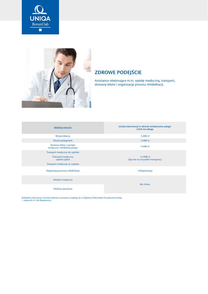ZDROWE PODEJŚCIE Assistance obejmujące m.in. opiekę medyczną, transport, dostawę leków i organizację procesu rehabilitacji. RODZAJ USŁUGI Liczba interwencji w okresie świadczenia usługi/ Limit na usługę Wizyta lekarza 1x300 zł Wizyta pielęgniarki 1x300 zł Dostawa leków i sprzętu medyczno- rehabilitacyjnego 1x300 zł Transport medyczny do szpitala Transport medyczny szpital-szpital 1x1500 zł (łącznie na wszystkie transporty) Transport medyczny ze szpitala Organizacja procesu rehabilitacji 1xOrganizacja Infolinia medyczna Bez limitu Infolinia sportowa Dokładna informacja na temat zakresów assistance znajdują się w Ogólnych Warunkach Świadczenia Usług – załącznik nr 2 do Regulaminu