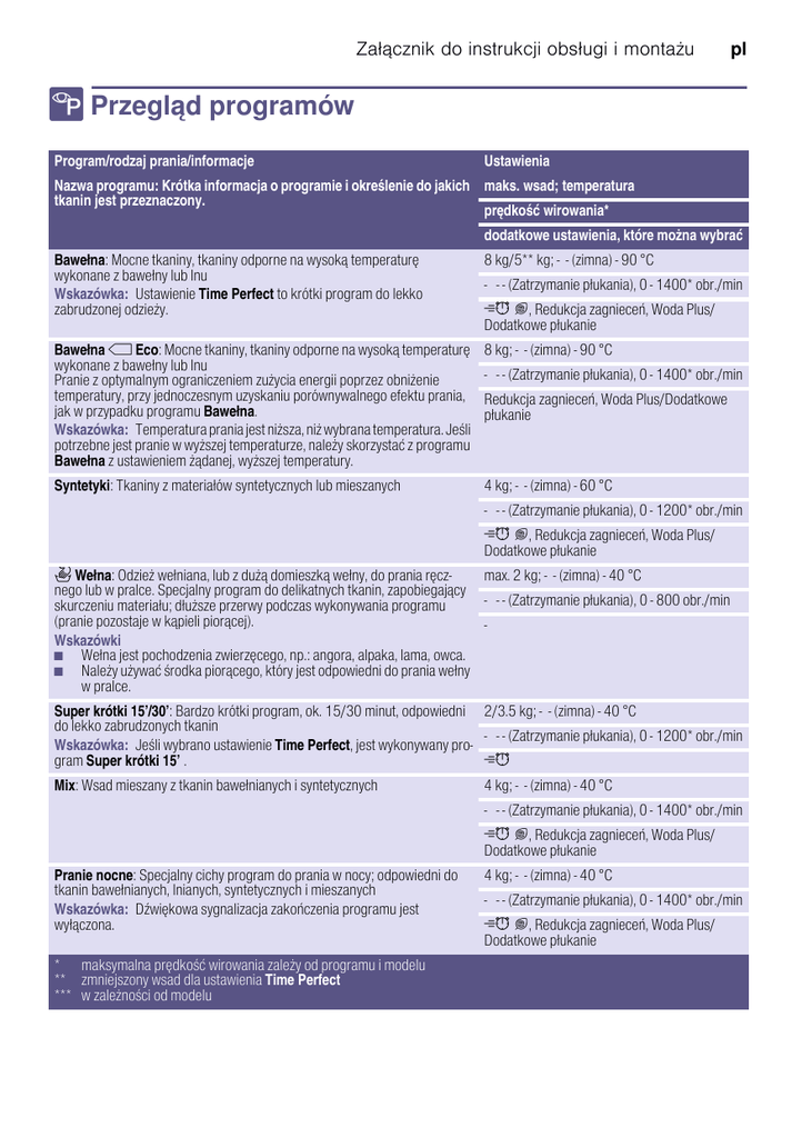 Załącznik do instrukcji obsługi i montażu pl / Przegląd programów użamtnoi gułsboijckurtsniodkinzcąłZa Program/rodzaj prania/informacje Ustawienia Nazwa programu: Krótka informacja o programie i określenie do jakich maks. wsad; temperatura tkanin jest przeznaczony. prędkość wirowania* dodatkowe ustawienia, które można wybrać Bawełna: Mocne tkaniny, tkaniny odporne na wysoką temperaturę wykonane z bawełny lub lnu Wskazówka: Ustawienie Time Perfect to krótki program do lekko zabrudzonej odzieży. 8 kg/5** kg; - - (zimna) - 90 °C - - - (Zatrzymanie płukania), 0 - 1400* obr./min G F, Redukcja zagnieceń, Woda Plus/ Dodatkowe płukanie Bawełna ü Eco: Mocne tkaniny, tkaniny odporne na wysoką temperaturę wykonane z bawełny lub lnu Pranie z optymalnym ograniczeniem zużycia energii poprzez obniżenie temperatury, przy jednoczesnym uzyskaniu porównywalnego efektu prania, jak w przypadku programu Bawełna. Wskazówka: Temperatura prania jest niższa, niż wybrana temperatura. Jeśli potrzebne jest pranie w wyższej temperaturze, należy skorzystać z programu Bawełna z ustawieniem żądanej, wyższej temperatury. 8 kg; - - (zimna) - 90 °C Syntetyki: Tkaniny z materiałów syntetycznych lub mieszanych 4 kg; - - (zimna) - 60 °C - - - (Zatrzymanie płukania), 0 - 1400* obr./min Redukcja zagnieceń, Woda Plus/Dodatkowe płukanie - - - (Zatrzymanie płukania), 0 - 1200* obr./min G F, Redukcja zagnieceń, Woda Plus/ Dodatkowe płukanie W Wełna: Odzież wełniana, lub z dużą domieszką wełny, do prania ręczmax. 2 kg; - - (zimna) - 40 °C nego lub w pralce. Specjalny program do delikatnych tkanin, zapobiegający - - - (Zatrzymanie płukania), 0 - 800 obr./min skurczeniu materiału; dłuższe przerwy podczas wykonywania programu (pranie pozostaje w kąpieli piorącej). Wskazówki ■ Wełna jest pochodzenia zwierzęcego, np.: angora, alpaka, lama, owca. ■ Należy używać środka piorącego, który jest odpowiedni do prania wełny w pralce. Super krótki 15’/30’: Bardzo krótki program, ok. 15/30 minut, odpowiedni 2/3.5 kg; - - (zimna) - 40 °C do lekko zabrudzonych tkanin - - - (Zatrzymanie płukania), 0 - 1200* obr./min Wskazówka: Jeśli wybrano ustawienie Time Perfect, jest wykonywany program Super krótki 15’ . G Mix: Wsad mieszany z tkanin bawełnianych i syntetycznych 4 kg; - - (zimna) - 40 °C - - - (Zatrzymanie płukania), 0 - 1400* obr./min G F, Redukcja zagnieceń, Woda Plus/ Dodatkowe płukanie Pranie nocne: Specjalny cichy program do prania w nocy; odpowiedni do tkanin bawełnianych, lnianych, syntetycznych i mieszanych Wskazówka: Dźwiękowa sygnalizacja zakończenia programu jest wyłączona. * maksymalna prędkość wirowania zależy od programu i modelu ** zmniejszony wsad dla ustawienia Time Perfect *** w zależności od modelu 4 kg; - - (zimna) - 40 °C - - - (Zatrzymanie płukania), 0 - 1400* obr./min G F, Redukcja zagnieceń, Woda Plus/ Dodatkowe płukanie pl Załącznik do instrukcji obsługi i montażu Program/rodzaj prania/informacje Ustawienia Nazwa programu: Krótka informacja o programie i określenie do jakich maks. wsad; temperatura tkanin jest przeznaczony. prędkość wirowania* dodatkowe ustawienia, które można wybrać Płuk./Wirow./Odpomp.: Kombinacja dodatkowych programów płukania i odwirowania prania oraz odpompowania wody po płukaniu Wskazówki ■ Ustawienie Woda Plus/Dodatk. płukanie jest wprowadzone wstępnie, jako domyślne. ■ Aby tylko wypłukać pranie, ustawić Wirowanie na 0. ■ Aby tylko odwirować pranie, wyłączyć Woda Plus/Dodatk. płukanie i, w razie potrzeby, ustawić prędkość wirowania. ■ Aby tylko odpompować wodę, ustawić Wirowanie na 0 i wyłączyć Woda Plus/Dodatk. płukanie. -; - - - (Zatrzymanie płukania), 0 - 1400* obr./min Redukcja zagnieceń, Woda Plus/Dodatkowe płukanie Czyszczenie bębna: Program służący do czyszczenia i pielęgnacji bębna i 0 kg; 90 °C komory pralki, np. przed uruchomieniem pierwszego cyklu prania, jeśli czę1200* obr./min sto wykonywane było pranie w niskich temperaturach (40 °C lub niższa), lub jeśli pojawił się nieprzyjemny zapach po dłuższej prze- rwie w użytkowaniu pralki. Miga kontrolka Czyszczenie bębna Û, jeśli przez dłuższy czas nie był używany program prania w temp. 60 °C lub wyższej. Wskazówki ■ Uruchomić program czyszczenia bębna, bez wsadu. ■ Zastosować proszek do prania lub środek piorący z wybielaczem. Aby zapobiec nadmiernemu tworzeniu się piany, użyć tylko połowę zalecanej przez producenta ilości środka piorącego. Nie używać środków piorących przeznaczonych do tkanin wełnianych lub delikatnych. Delikatne/Jedwab: Do delikatnych tkanin, które można prać w pralce np. do jedwabiu, satyny, włókien sztucznych lub mieszanych (np. jedwabne bluzki, jedwabne szale) Wskazówka: Stosować środek piorący przeznaczony do do prania jedwabiu i tkanin delikatnych w pralce. 2 kg; - - (zimna) - 40 °C - - - (Zatrzymanie płukania), 0 - 800 obr./min G F, Redukcja zagnieceń, Woda Plus/ Dodatkowe płukanie Kołdry: Nadające się do prania w pralce rzeczy z wypełnieniem z włókien sztucznych, takie jak poduszki, kołdry i koce; program odpowiedni również do rzeczy wypełnionych pierzem Wskazówka: Rzeczy o dużych rozmiarach należy prać oddzielnie. Używać środków piorących przeznaczonych do tkanin delikatnych i stosować się do instrukcji podanych na metkach pranych rzeczy. Środki piorące należy dozować oszczędnie. 2 kg (wypełnione pierzem 1.5 kg); - - (zimna) 60 °C Sport/Fitness: Odzież sportowa i rekreacyjna wykonana z mikrofibry Wskazówki ■ Nie należy stosować zmiękczacza tkanin. ■ Przed praniem, należy dokładnie oczyścić wszystkie dozowniki środków piorących (przegródki) celem usunięcia pozostałości zmiękczacza tkanin. 2 kg; - - (zimna) - 40 °C Jeans: Odzież w ciemnych kolorach, wykonana z bawełny lub delikatnych tkanin. Wskazówka: Prać rzeczy wywrócone na lew