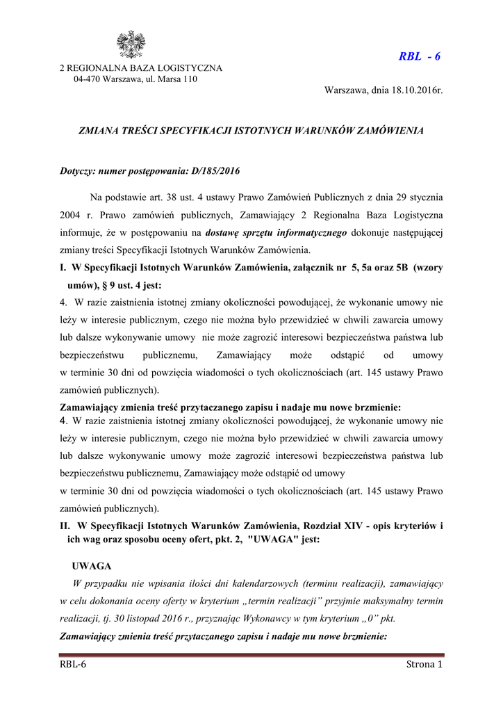 RBL - 6 2 REGIONALNA BAZA LOGISTYCZNA 04-470 Warszawa, ul. Marsa 110 Warszawa, dnia 18.10.2016r. ZMIANA TREŚCI SPECYFIKACJI ISTOTNYCH WARUNKÓW ZAMÓWIENIA Dotyczy: numer postępowania: D/185/2016 Na podstawie art. 38 ust. 4 ustawy Prawo Zamówień Publicznych z dnia 29 stycznia 2004 r. Prawo zamówień publicznych, Zamawiający 2 Regionalna Baza Logistyczna informuje, że w postępowaniu na dostawę sprzętu informatycznego dokonuje następującej zmiany treści Specyfikacji Istotnych Warunków Zamówienia. I. W Specyfikacji Istotnych Warunków Zamówienia, załącznik nr 5, 5a oraz 5B (wzory umów), § 9 ust. 4 jest: 4. W razie zaistnienia istotnej zmiany okoliczności powodującej, że wykonanie umowy nie leży w interesie publicznym, czego nie można było przewidzieć w chwili zawarcia umowy lub dalsze wykonywanie umowy nie może zagrozić interesowi bezpieczeństwa państwa lub bezpieczeństwu publicznemu, Zamawiający może odstąpić od umowy w terminie 30 dni od powzięcia wiadomości o tych okolicznościach (art. 145 ustawy Prawo zamówień publicznych). Zamawiający zmienia treść przytaczanego zapisu i nadaje mu nowe brzmienie: 4. W razie zaistnienia istotnej zmiany okoliczności powodującej, że wykonanie umowy nie leży w interesie publicznym, czego nie można było przewidzieć w chwili zawarcia umowy lub dalsze wykonywanie umowy może zagrozić interesowi bezpieczeństwa państwa lub bezpieczeństwu publicznemu, Zamawiający może odstąpić od umowy w terminie 30 dni od powzięcia wiadomości o tych okolicznościach (art. 145 ustawy Prawo zamówień publicznych). II. W Specyfikacji Istotnych Warunków Zamówienia, Rozdział XIV - opis kryteriów i ich wag oraz sposobu oceny ofert, pkt. 2, "UWAGA" jest: UWAGA W przypadku nie wpisania ilości dni kalendarzowych (terminu realizacji), zamawiający w celu dokonania oceny oferty w kryterium „termin realizacji” przyjmie maksymalny termin realizacji, tj. 30 listopad 2016 r., przyznając Wykonawcy w tym kryterium „0” pkt. Zamawiający zmienia treść przytaczanego zapisu i nadaje mu nowe brzmienie: RBL-6 Strona 1 UWAGA Wykonawca może zaoferować termin realizacji zamówienia podając go w pełnych dniach kalendarzowych np. 1 dzień. W przypadku gdy Wykonawca zaoferuje termin realizacji zamówienia w "ułamku" oferta będzie podlegała odrzuceniu na podstawie art. 89 ust. 1 pkt. 2. W przypadku nie wpisania ilości dni kalendarzowych (terminu realizacji), zamawiający w celu dokonania oceny oferty w kryterium „termin realizacji” przyjmie maksymalny termin realizacji, tj. 30 listopad 2016 r., przyznając Wykonawcy w tym kryterium „0” pkt. III. W Specyfikacji Istotnych Warunków Zamówienia, załącznik nr 1 (opis przedmiotu zamówienia), zadanie nr 6 jest: ZADANIE NR 6 LP. 1. 2. 3. 4. 5. 6. 7. 8. 9. Nazwa oprogramowania VMware vSphere Enterprise Plus VMware vSphere Enterprise Plus 3 Year Support & Subscription Production (24h/7d) VMware vCenter Server Standard VMware vCenter Server Standard 3 Year Support & Subscription Production (24h/7d) VMware Horizon 7 Enterprise Edition Concurrent User (CCU) +1 Year Support & Subscription Production (24h/7d) Windows Server Datacenter 2012R2 z downgrade do Windows Datacenter 2008 R2 Windows Datacenter 2012R2 user CAL Microsoft System Center 2012 R2 13. 14. MS SQL Server 2014 Enterprise z downgrade do SQL Server 2012 (1 licencja na 4 core) MS Exchange Server Enterprise 2013 MS Exchange Enterprise 2013 user CAL MS Sharepoint Server Enterprise 2016 z możliwością downgrade do MS Sharepoint Server 2013 MS Sharepoint 2016 Enterprise user CAL MacAfee ePO Server + licencje dostępowe EPA (3 lata) 15. Veeam Backup & Replication Enterprise v9 16. 17. 18. Blancco 5 + Management Console Blancco 5 + Support Service Plan Blancco 5 + dyski HDD 10. 11. 12. RBL-6 Nazwa licencji / Opis / Sposób licencjonowania Per 1 CPU Per 1 CPU Per 1 App instance Per 1 App instance Per 10-user packages 1 licencja na 2 procesory. Nieograniczone VM Per user 1 licencja na 2 procesory Nieograniczone VM Enterprise /per core/ 1lic=4 core Enterprise /Na serwer/ Enterprise /Per user/ Enterprise /Na serwer/ Per user /ePO + Ilość licencji dostępowych EPA/ /Procesorowe/ 1lic=1CPU Licencja Wsparcie 2 lata Na liczbę HDD (do Strona 2 19. Splunk Enterprise ver. 6.4.3 20. 21. Splunk Enterprise Security Splunk Enterprise Security Support wyczerpania puli) Dzienna ilość danych 10GB/dzień Na instancję 1 rok Windows Server Data Centre 2012 R2 odpowiednio: - zadanie 6: • 3 serwery cztero-procesorowe (8 rdzeni każdy procesor); • 4 serwery dwu-procesorowe (12 rdzeni każdy procesor); • 14 serwerów dwu-procesorowych (8 rdzeni każdy procesor). Microsoft System Center 2012 R2 edycja Datacenter odpowiednio: - zadanie 6: 2 serwery dwu-procesorowe (12 rdzeni każdy procesor). Zamawiający zmienia treść przytaczanego zapisu i nadaje mu nowe brzmienie: LP. 1. 2. 3. 4. 5. 6. 7. 8. 9. Nazwa oprogramowania VMware vSphere Enterprise Plus VMware vSphere Enterprise Plus 3 Year Support & Subscription Production (24h/7d) VMware vCenter Server Standard VMware vCenter Server Standard 3 Year Support & Subscription Production (24h/7d) VMware Horizon 7 Enterprise Edition Concurrent User (CCU) +1 Year Support & Subscription Production (24h/7d) Windows Server Datacenter 2012R2 z downgrade do Windows Datacenter 2008 R2 Windows Datacenter 2012R2 user CAL Microsoft System Center 2012 R2 13. 14. MS SQL Server 2014 Enterprise z downgrade do SQL Server 2012 (1 licencja na 4 core) MS Exchange Server Enterprise 2013 MS Exchange Enterprise 2013 user CAL MS Sharepoint Server Enterprise 2016 z możliwością downgrade do MS Sharepoint Server 2013 MS Sharepoint 2016 Enterprise user CAL MacAfee ePO Server + licencje dostępowe EPA (3 lata) 15. Veeam Backup & Replication Enterprise v9 16. 17. 18. Blancco 5 + Management Console Blancco 5 + Support Service Plan Blancco 5 + dyski HDD 19. Splunk Enterprise ver. 6.4.3 10. 11. 12. RBL-6 Nazwa licencj