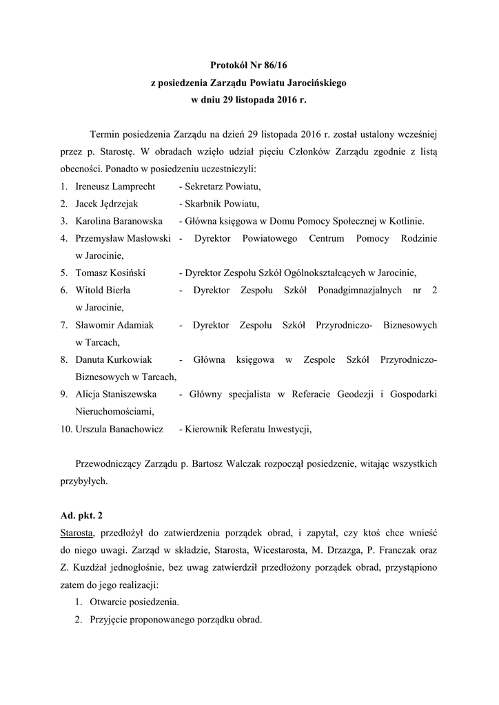 Protokół Nr 86/16 z posiedzenia Zarządu Powiatu Jarocińskiego w dniu 29 listopada 2016 r. Termin posiedzenia Zarządu na dzień 29 listopada 2016 r. został ustalony wcześniej przez p. Starostę. W obradach wzięło udział pięciu Członków Zarządu zgodnie z listą obecności. Ponadto w posiedzeniu uczestniczyli: 1. Ireneusz Lamprecht - Sekretarz Powiatu, 2. Jacek Jędrzejak - Skarbnik Powiatu, 3. Karolina Baranowska - Główna księgowa w Domu Pomocy Społecznej w Kotlinie. 4. Przemysław Masłowski - Dyrektor Powiatowego Centrum Pomocy Rodzinie w Jarocinie, 5. Tomasz Kosiński - Dyrektor Zespołu Szkół Ogólnokształcących w Jarocinie, 6. Witold Bierła - Dyrektor Zespołu Szkół Ponadgimnazjalnych - Dyrektor Zespołu Szkół Przyrodniczo- - Główna księgowa nr 2 w Jarocinie, 7. Sławomir Adamiak Biznesowych w Tarcach, 8. Danuta Kurkowiak w Zespole Szkół Przyrodniczo- Biznesowych w Tarcach, 9. Alicja Staniszewska - Główny specjalista w Referacie Geodezji i Gospodarki Nieruchomościami, 10. Urszula Banachowicz - Kierownik Referatu Inwestycji, Przewodniczący Zarządu p. Bartosz Walczak rozpoczął posiedzenie, witając wszystkich przybyłych. Ad. pkt. 2 Starosta, przedłożył do zatwierdzenia porządek obrad, i zapytał, czy ktoś chce wnieść do niego uwagi. Zarząd w składzie, Starosta, Wicestarosta, M. Drzazga, P. Franczak oraz Z. Kuzdżał jednogłośnie, bez uwag zatwierdził przedłożony porządek obrad, przystąpiono zatem do jego realizacji: 1. Otwarcie posiedzenia. 2. Przyjęcie proponowanego porządku obrad. 3. Przyjęcie protokołu nr 83/16 z posiedzenia w dniu 02 listopada 2016 r. oraz nr 84/16 z posiedzenia w dniu 07 listopada 2016 r. 4. Rozpatrzenie pism Dyrektora Domu Pomocy Społecznej w Kotlinie nr DPSIII/0303/50/16, nr DPS-III/0303/51/16 i nr DPS-III/0303/57/16 w sprawie zmian w planie finansowym na 2016 r. 5. Rozpatrzenie pisma Dyrektora Domu Pomocy Społecznej w Kotlinie nr DPSIII/0303/58/16 w sprawie zmian w planie finansowym na 2016 r. 6. Rozpatrzenie pisma Dyrektora Domu Pomocy Społecznej w Kotlinie nr DPSIII/0303/59/16 w sprawie zmian w planie finansowym na 2016 r. 7. Rozpatrzenie wniosku Komisji Rewizyjnej nr A-OB-BR.0014.41.2016.WE w sprawie zrewidowania umowy z Przedsiębiorstwem Handlowo- Usługowym SAWPOL Aleksandra Sawarzyńska w Jarocinie oraz w sprawie podjęcia działań w celu zagospodarowania niewykorzystanej części placówki. 8. Rozpatrzenie interpelacji radnych klubu "Porozumienie Obywatelskie" nr A-OBBR.0003.22.2016 w sprawie wyjaśnienia kwestii podpisania przez DPS w Kotlinie umowy z Przedsiębiorstwem Handlowo Usługowym SAWPOL Aleksandra Sawarzyńska. 9. Przyjęcie do budżetu powiatu dotacji od Wojewody Wielkopolskiego znak FBI.3111.360.2016.4 w związku z korektą planu pod kątem wykorzystania miejsc finansowanych wg starych zasad za okres od stycznia do października 2016 r. 10. Rozpatrzenie projektu uchwały Zarządu Powiatu Jarocińskiego w sprawie wyrażenia zgody na nieodpłatne przekazanie pozostałych środków trwałych i wyposażenia stanowiącego własność Powiatowego Centrum Pomocy Rodzinie w Jarocinie. 11. Rozpatrzenie pisma Dyrektora Powiatowego Centrum Pomocy Rodzinie w Jarocinie nr FN.3011.31.2016 w sprawie zmian w planie finansowym na 2016 r. 12. Rozpatrzenie pisma Dyrektora Powiatowego Centrum Pomocy Rodzinie w Jarocinie nr FN.3011.33.2016 w sprawie zmian w planie finansowym na 2016 r. 13. Rozpatrzenie pisma Dyrektora Zespołu Szkół Ogólnokształcących w Jarocinie nr ZSO.3110.8.2016 w sprawie zmian w planie finansowym na 2016 r. 14. Rozpatrzenie pisma Dyrektora Zespołu Szkół Ponadgimnazjalnych nr 2 w Jarocinie nr ZSP/0312/11/2016 w sprawie zmian w planie finansowym na 2016 r. 15. Rozpatrzenie pisma Dyrektora Zespołu Szkół Ponadgimnazjalnych nr 2 w Jarocinie nr ZSP/0312/12/2016 w sprawie zmian w planie finansowym na 2016 r. 16. Rozpatrzenie pisma Dyrektora Zespołu Szkół Ponadgimnazjalnych nr 2 w Jarocinie nr ZSP-3111/18/2016 w sprawie wyrażenia zgody na nauczanie indywidualne ucznia. 17. Rozpatrzenie pisma Dyrektora Zespołu Szkół Przyrodniczo- Biznesowych w Tarcach nr ZSP-B 302.18.2016.KD w sprawie zmian w planie finansowym na 2016 r. 18. Rozpatrzenie pisma Dyrektora Zespołu Szkół Przyrodniczo- Biznesowych w Tarcach nr ZSP-B.071.1.105.2016 w sprawie zmian w planie finansowym na 2016 r. 19. Rozpatrzenie wniosku Pani Joanny Szymkowiak i Pana Mariusza Werbińskiego, najemcy lokalu nr 4 w Porębie 32, w sprawie wyrażenia zgody na wymianę drzwi wejściowych do mieszkania. 20. Rozpatrzenie pisma Referatu Geodezji i Gospodarki Nieruchomościami nr R-GNNG.6845.24.2016.ZM w sprawie wymiany kotła c.o. w budynku Zakrzew 52. 21. Rozpatrzenie pisma Referatu Geodezji i Gospodarki Nieruchomościami nr RGN.NG.6845.24.2016.ZM w sprawie zajęcia stanowiska w sprawie ewentualnego przeznaczenia do oddania w dzierżawę gruntu rolnego położonego w Zakrzewie dz.nr 57/4. 22. Rozpatrzenie pisma Referatu Geodezji i Gospodarki Nieruchomościami nr R-GNNG.6845.25.2016.PD w sprawie zajęcia stanowiska w sprawie wynajęcia jednego budynku po byłym DPS w Zakrzewie przedsiębiorstwu P.H.U. "AUTO-NOWAK" Jacek Nowak. 23. Rozpatrzenie pisma Referatu Geodezji i Gospodarki Nieruchomościami nr R-GNNG.683.1.24.2016.PD w sprawie nieruchomości przeznaczonych pod przebudowę drogi powiatowej Jarocin- Wola Książęca. 24. Przyjęcie do wiadomości informacji Referatu Geodezji i Gospodarki Nieruchomościami nr R-GN-NG.683.1.24.2016.PD w sprawie ustalonych wysokości odszkodowań za nieruchomości przejęte na rzecz Powiatu Jarocińskiego, przeznaczone pod przebudowę drogi powiatowej Jarocin- Wola Książęca. 25. Rozpatrzenie pisma Referatu Geodezji i Gospodarki Nieruchomościami nr R-GNNG.3026.14.2016.ZM w sprawie zmian w planie finansowym na 2016 r. 26. Rozpatrzenie pisma Referatu Geodezji i Gospodarki Nieruchomościami nr R-GNNG.3026.15.2016.ZM w sprawie zmian w planie finansowym na 2016 r. 27. Zmniejszenie w 