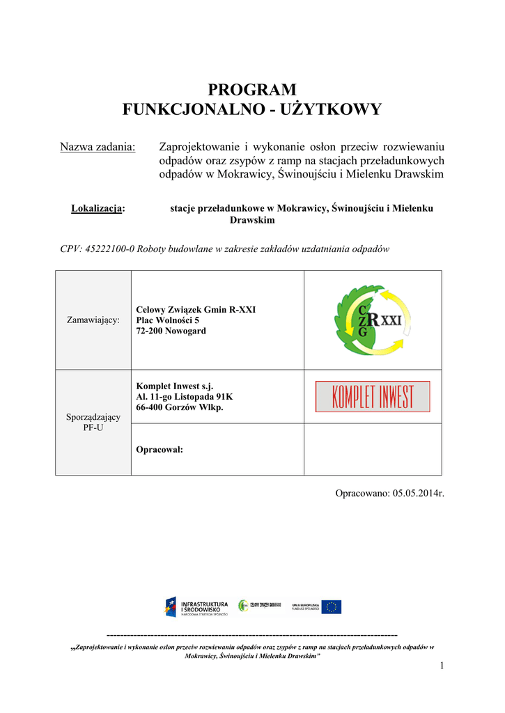 PROGRAM FUNKCJONALNO - UŻYTKOWY Nazwa zadania: Zaprojektowanie i wykonanie osłon przeciw rozwiewaniu odpadów oraz zsypów z ramp na stacjach przeładunkowych odpadów w Mokrawicy, Świnoujściu i Mielenku Drawskim Lokalizacja: stacje przeładunkowe w Mokrawicy, Świnoujściu i Mielenku Drawskim CPV: 45222100-0 Roboty budowlane w zakresie zakładów uzdatniania odpadów Zamawiający: Sporządzający PF-U Celowy Związek Gmin R-XXI Plac Wolności 5 72-200 Nowogard Komplet Inwest s.j. Al. 11-go Listopada 91K 66-400 Gorzów Wlkp. Opracował: Opracowano: 05.05.2014r. -------------------------------------------------------------------------------------„Zaprojektowanie i wykonanie osłon przeciw rozwiewaniu odpadów oraz zsypów z ramp na stacjach przeładunkowych odpadów w Mokrawicy, Świnoujściu i Mielenku Drawskim” 1 SPIS TREŚCI Opis ogólny przedmiotu zamówienia.............................................................................. 3 Parametry charakterystyczne zamierzenia inwestycyjnego. ................................................. 3 Uwarunkowania wykonania przedmiotu zamówienia. .......................................................... 3 Ogólne właściwości funkcjonalno – użytkowe. .................................................................... 4 Szczegółowe właściwości funkcjonalno – użytkowe. ........................................................... 5 2. Opis wymagań zamawiającego w stosunku do przedmiotu zamówienia. ................... 6 2.1 Wymagania ogólne dotyczące przygotowania terenu budowy. .................................. 6 2.2 Wymagania ogólne dotyczące rozwiązań. ................................................................... 7 2.3 Wymagania zamawiającego w stosunku do przedmiotu zamówienia. ........................ 7 3. Oświadczenie o prawie dysponowania nieruchomością. .............................................. 8 4. Przepisy prawne związane z przedmiotem zamówienia. .............................................. 8 5. Informacje i dokumenty będące w posiadaniu Zamawiającego. ............................... 11 1. -------------------------------------------------------------------------------------„Zaprojektowanie i wykonanie osłon przeciw rozwiewaniu odpadów oraz zsypów z ramp na stacjach przeładunkowych odpadów w Mokrawicy, Świnoujściu i Mielenku Drawskim” 2 1. Opis ogólny przedmiotu zamówienia. Przedmiotem zamówienia jest zaprojektowanie i realizacja robót budowlanych na stacjach przeładunkowych w, Mokrawicy, Świnoujściu i Mielenku Drawskim”, w tym: • rozwiązać problem załadunku odpadów z naczepy, • wykonać osłony zapobiegające rozwiewaniu odpadów, Parametry charakterystyczne zamierzenia inwestycyjnego. Stacje przeładunkowe w Mokrawicy, Świnoujściu. i Mielenku Drawskim istniejące rampy należy wyposażyć w elementy zwiększające sprawność i bezpieczeństwo: • zaprojektowanie i wykonanie płaszczyzny zsypowej dla przeładunku odpadów z samochodów (dowożących odpady komunalne zmieszane na stacje przeładunkowe) na naczepy typu „walking floor”. Orientacyjne wymiary modułu to: długość modułu=2m; szerokość = ok. 0,93m. • Dotyczy wyłącznie Mokrawicy i Mielenka Drawskiego: zaprojektowanie i wykonanie wzmocnienia pod stopy naczep typu „walking floor” o wymiarach 600x3000x10 mm. (Blachy będące nawierzchnią dostarcza Zamawiający). • Dotyczy wyłącznie Mokrawicy: zaprojektowanie i wykonanie powiększenia placu manewrowego o pow. ok. 50m2 . • wykonać osłony zapobiegające rozwiewaniu odpadów. Orientacyjne wymiary: - pojedynczej osłony: szerokość: ok. 2,5 m; długość: ok. 14 m; wysokość: ok. 3-4 m, - prostej osłony: długość ok. 10,0 m; wysokość ok. 3-4 m. Uwarunkowania wykonania przedmiotu zamówienia. Wykonawca przed rozpoczęciem procesu projektowania zobowiązany jest do dokonania dodatkowych pomiarów inwentaryzacyjnych. Dokumentacja projektowa musi być uzgodniona i zaakceptowana przez Zamawiającego, dotyczy to każdej z faz wykonania projektów; Zamawiający w szczególności musi zaakceptować projekt budowlany przed rozpoczęciem robót oraz wszystkie rysunki i inne składniki dokumentacji projektu wykonawczego; żaden element realizowanego zadania inwestycyjnego nie może być wykonywany na podstawie niezatwierdzonego przez Zamawiającego rysunku bądź innego dokumentu projektowego; Projekty muszą być wykonane zgodnie z: Rozporządzenie Ministra Infrastruktury z dnia 18 lutego 2011 r. zmieniające rozporządzenie w sprawie szczegółowego zakresu i formy dokumentacji projektowej, specyfikacji technicznych wykonania i odbioru robót budowlanych oraz programu funkcjonalno-użytkowego (Dz. U. Nr 42, poz. 217). -------------------------------------------------------------------------------------„Zaprojektowanie i wykonanie osłon przeciw rozwiewaniu odpadów oraz zsypów z ramp na stacjach przeładunkowych odpadów w Mokrawicy, Świnoujściu i Mielenku Drawskim” 3 Rozporządzenie Ministra Infrastruktury z dnia 23 kwietnia 2010 r. zmieniające rozporządzenie w sprawie szczegółowego zakresu i formy dokumentacji projektowej, specyfikacji technicznych wykonania i odbioru robót budowlanych oraz programu funkcjonalno-użytkowego (Dz. U. Nr 72, poz. 464). Rozporządzenie Ministra Infrastruktury z dnia 22 kwietnia 2005 r. zmieniające rozporządzenie w sprawie szczegółowego zakresu i formy dokumentacji projektowej , specyfikacji technicznych wykonania i odbioru robót budowlanych oraz programu funkcjonalno-użytkowego (Dz. U. Nr 75, poz. 2075). Rozporządzenie Ministra Infrastruktury z dnia 2 września 2004 r. w sprawie szczegółowego zakresu i formy dokumentacji projektowej, specyfikacji technicznych wykonania i odbioru robót budowlanych oraz programu funkcjonalno-użytkowego (Dz. U. Nr 202, poz. 2072). Rozporządzenie Ministra Infrastruktury z dnia 18 maja 2004 r. w sprawie określania metod i podstaw sporządz