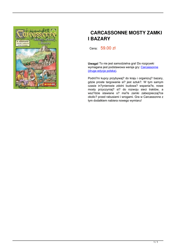 CARCASSONNE MOSTY ZAMKI I BAZARY Cena: 59.00 zł Uwaga! To nie jest samodzielna gra! Do rozgrywki wymagana jest podstawowa wersja gry: Carcassonne (druga edycja polska). Podró?ni kupcy przybywaj? do kraju i organizuj? bazary, gdzie proste targowanie si? jest sztuk?. W tym samym czasie in?ynierowie zdolni budowa? wspania?e, nowe mosty przyczyniaj? si? do rozwoju sieci traktów, a wsz?dzie stawiane s? ma?e zamki zabezpieczaj?ce okolic? przed rabusiami i wrogami. Gra w Carcassonne z tym dodatkiem nabiera nowego wymiaru! 1/1 Powered by TCPDF (www.tcpdf.org)