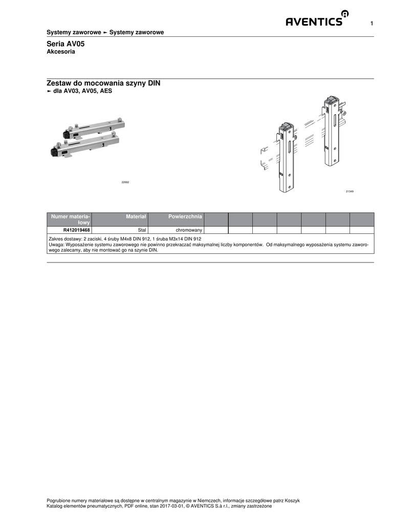 1 Systemy zaworowe ► Systemy zaworowe Seria AV05 Akcesoria Zestaw do mocowania szyny DIN ► dla AV03, AV05, AES 22692 21349 Numer materiałowy R412019468 Materiał Powierzchnia Stal chromowany Zakres dostawy: 2 zaciski, 4 śruby M4x8 DIN 912, 1 śruba M3x14 DIN 912 Uwaga: Wyposażenie systemu zaworowego nie powinno przekraczać maksymalnej liczby komponentów. Od maksymalnego wyposażenia systemu zaworowego zalecamy, aby nie montować go na szynie DIN. Pogrubione numery materiałowe są dostępne w centralnym magazynie w Niemczech, informacje szczegółowe patrz Koszyk Katalog elementów pneumatycznych, PDF online, stan 2017-03-01, © AVENTICS S.à r.l., zmiany zastrzeżone