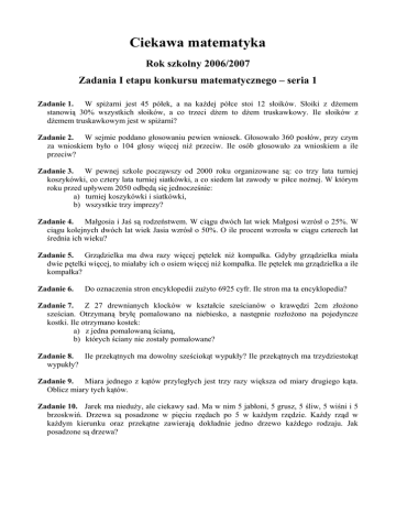 Ciekawa matematyka Rok szkolny 2006/2007 Zadania I etapu konkursu matematycznego – seria 1 Zadanie 1. W spiżarni jest 45 półek, a na każdej półce stoi 12 słoików. Słoiki z dżemem stanowią 30% wszystkich słoików, a co trzeci dżem to dżem truskawkowy. Ile słoików z dżemem truskawkowym jest w spiżarni? Zadanie 2. W sejmie poddano głosowaniu pewien wniosek. Głosowało 360 posłów, przy czym za wnioskiem było o 104 głosy więcej niż przeciw. Ile osób głosowało za wnioskiem a ile przeciw? Zadanie 3. W pewnej szkole począwszy od 2000 roku organizowane są: co trzy lata turniej koszykówki, co cztery lata turniej siatkówki, a co siedem lat zawody w piłce nożnej. W którym roku przed upływem 2050 odbędą się jednocześnie: a) turniej koszykówki i siatkówki, b) wszystkie trzy imprezy? Zadanie 4. Małgosia i Jaś są rodzeństwem. W ciągu dwóch lat wiek Małgosi wzrósł o 25%. W ciągu kolejnych dwóch lat wiek Jasia wzrósł o 50%. O ile procent wzrosła w ciągu czterech lat średnia ich wieku? Zadanie 5. Grządzielka ma dwa razy więcej pętelek niż kompałka. Gdyby grządzielka miała dwie pętelki więcej, to miałaby ich o osiem więcej niż kompałka. Ile pętelek ma grządzielka a ile kompałka? Zadanie 6. Do oznaczenia stron encyklopedii zużyto 6925 cyfr. Ile stron ma ta encyklopedia? Zadanie 7. Z 27 drewnianych klocków w kształcie sześcianów o krawędzi 2cm złożono sześcian. Otrzymaną bryłę pomalowano na niebiesko, a następnie rozłożono na pojedyncze kostki. Ile otrzymano kostek: a) z jedna pomalowaną ścianą, b) których ściany nie zostały pomalowane? Zadanie 8. Ile przekątnych ma dowolny sześciokąt wypukły? Ile przekątnych ma trzydziestokąt wypukły? Zadanie 9. Miara jednego z kątów przyległych jest trzy razy większa od miary drugiego kąta. Oblicz miary tych kątów. Zadanie 10. Jarek ma nieduży, ale ciekawy sad. Ma w nim 5 jabłoni, 5 grusz, 5 śliw, 5 wiśni i 5 brzoskwiń. Drzewa są posadzone w pięciu rzędach po 5 w każdym rzędzie. Każdy rząd w każdym kierunku oraz przekątne zawierają dokładnie jedno drzewo każdego rodzaju. Jak posadzone są drzewa?