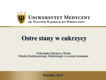 Ostre stany w cukrzycy Aleksandra Zdrojowy-Wełna Klinika Endokrynologii, Diabetologii i Leczenia Izotopami Wrocław, 2014 Stany zagrożenia życia w przebiegu cukrzycy - wskazanie do hospitalizacji Powikłania hiperglikemii śmiertelność Cukrzycowa kwasica ketonowa 5% Zespół hiperglikemiczno-hiperosmolalny 15% Kwasica mleczanowa 50% Powikłanie hipoglikemii Śpiączka hipoglikemiczna w przebiegu neuroglikopenii Kwasica ketonowa (DKA) • Przyczyna: nagły i znaczny niedobór insuliny • Zwiększenie stężeń hormonów antagonistycznych w stosunku do insuliny • Zaburzenia metaboliczne przemiany węglowodanów, tłuszczów, białek gospodarki wodno-elektrolitowej równowagi kwasowo-zasadowej • Występuje w przebiegu DM t.1 (częściej) i DM t.2 Wzrost częstości występowania DKA dane z USA www.endotext.com Czynniki wywołujące DKA • Infekcje (ok. 40% DM t.2, 20% DM t.1) • Ominięcie/przerwanie stosowania insuliny(50%DMt.1), leków hipoglikemizujących (ok. 10% DM t.2) • Opóźnione rozpoznanie cukrzycy (10-20%) • Nadużywanie alkoholu • Ciąża • Zapalenie trzustki • Ostre incydenty sercowo-naczyniowe (ostry zespół wieńcowy, udar mózgu) • Leki (np. GKS, przeciwpsychotyczne), kokaina • Wszystkie stany zwiększające nagle zapotrzebowanie na insulinę • W ok. 20% nie udaje się ustalić przyczyny Maletkovic J, Drexler A: Acute and Chronic Complications of Diabetes Diabetic Ketoacidosis and Hyperglycemic Hyperosmolar State Endocrinology and Metabolism Clinics, 2013-12-01, Volume 42, Issue 4, Pages 677-695 • Major medical or surgical stress • Inadequate insulin dose • First diagnosis • Other Przyczyny DKA w zależności od metody leczenia DM t.1 na podstawie: Kapłon M i wsp. Analiza czynników sprawczych cukrzycowej kwasicy ketonowej u osób dorosłych z cukrzycą typu 1 Diabet Klin 2013; 2, 6:200-207. Osobista pompa insulinowa Intensywna czynnościowa insulinoterapia Wielokrotne wstrzyknięcia Mieszanki insuliny (niezalecane!) Niepodawanie insuliny 27% 70% 75% 56% Infekcja 55% 43% 60% 69% Alkohol 9% 0,2% 10% 12% Okluzja pompy 81% 33% 40% 37% 54% Niedobór insuliny ↑lipoliza, WKT ↓zużycia glukozy ketogeneza w wątrobie kwasica met. ketonuria hiperglikemia ↑proteoliza ↑aminokwasów w surowicy diureza osmotyczna ↑ glukoneogeneza utrata wody i elektrolitów odwodnienie insulinooporność zaburzenie czynności nerek Objawy kliniczne – zmienny obraz • • • • • • • • • • Poliuria Polidypsja Ubytek masy ciała Osłabienie Odwodnienie Zaburzenia świadomości, śpiączka Ból brzucha (objawy „ostrego brzucha”) Wymioty Hiperwentylacja, oddech Kussmaula, zapach acetonu z ust Hipotonia http://nandahealth.blogspot.com/ Rozpoznanie wg PTD 2013 kryteria laboratoryjne • glikemia zazwyczaj > 250 mg/dl (>13,9 mmol/l) • pH krwi <7,3 • stężenie wodorowęglanów w surowicy <18mmol/l • ciała ketonowe obecne w moczu lub w surowicy • luka anionowa > 10 Na+(mmol/l) – [Cl-(mmol/l) + HCO3-(mmol/l)] Diagnostyka różnicowa • alkoholowa kwasica ketonowa – zahamowanie glukoneogenezy (glikemia rzadko > 250 mg/dl, wodorowęglany zwykle >18 mmol/l, hipomagnezemia, hipokaliemia, hipofosfatemia) • ketoza głodowa (bez hiperglikemii, dwuwęglany <18 mmol/l) • inne kwasice metaboliczne z dużą luką anionową: zatrucie glikolem etylowym (wzrost osmolalności osocza, bez ketonemii), metanolem, salicylanami, paraldehydem • kwasica mleczanowa (stężenie kwasu mlekowego >7 mmol/l) • inne stany śpiączkowe prowadzące do hiperglikemii i ketozy lub sytuacja, gdy towarzyszą im np. udar mózgu, śpiączka mocznicowa www.endotext.com Monitorowanie wg PTD 2013 • • • • • RR, tętno, oddechy, świadomość co 1-2h bilans płynów co 1-2h temperatura ciała co 8h glikemia co 1h Na+, K+ w surowicy co 4h w przypadku hiperkaliemii >5,5 mmol/l, gdy nie uzupełnia się potasu: kontrola potasu po 2h, po normalizacji co 4h • gazometria co 4h, gdy konieczność podania bikarbonatów – kontrola po 1h • wyjściowe oznaczenie ketonów we krwi i/lub w moczu Leczenie kwasicy ketonowej 1. nawodnienie 2. zmniejszenie hiperglikemii 3. wyrównanie zaburzeń elektrolitowych 4. leczenie przyczyny wywołującej Nawodnienie wg PTD 2013 deficyt wody (średnio 100 ml/kg) powinien być uzupełniony dożylnie w ciągu 24-48 h pod kontrolą stanu układu krążenia • 1000 ml 0,9% NaCl w ciągu pierwszej godziny następnie • 500 ml/godz. 0,9% NaCl przez 4-6 h następnie • 250 ml/godz. 0,9% NaCl aż do przywrócenia równowagi gospodarki kwasowo-zasadowej Po obniżeniu glikemii <250 mg/dl należy dołączyć wlew 5% r-ru glukozy z prędkością 100 ml/godz, w przypadku dołączenia glukozy po 24 h płynoterapii należy zmniejszyć ilość podawanego r-ru 0,9% NaCl do 150 ml/godz. Zmniejszenie hiperglikemii wg PTD 2013 insulinoterapia dożylna • inicjująca dawka insuliny bolus 0,1 j./kg mc. • następnie wlew insuliny 0,1 j/kg mc/godz. • regulacja szybkości wlewu w zależności od stężenia glukozy we krwi – kontrola co godzinę Zmniejszenie hiperglikemii wg PTD 2013 • obniżanie wartości glikemii maksymalnie 100 mg/dl w ciągu godziny • jeśli w ciągu pierwszej godziny wartość glikemii nie obniży się o 50-70 mg/dl w stosunku do wartości wyjściowej – należy zwiększać (zwykle podwajać) co godzinę szybkość wlewu insuliny, aż do osiągnięcia zmniejszenia glikemii o 50-70 mg/dl na godzinę Wyrównywanie zaburzeń elektrolitowych - sód Rzeczywiste stężenie sodu w surowicy: na każde 100 mg/dl (5,6 mmol/l) glikemii >100mg/dl (5,6 mol/l), do aktualnego wyniku Na+ w surowicy należy dodać 1,6 mmol/l • W przypadku hipernatremii >150 mmol/l stosuje się przejściowo 0,45% NaCl (do czasu ustąpienia hipernatremii) Wyrównywanie zaburzeń elektrolitowych - potas Suplementacja potasu K+ > 5,5 mmol/l → nie podawać KCl K+ 5–5,5 mmol/l → 5–10 mmol/godz. KCl K+ 4–5 mmol/l → 10-15 mmol/godz. KCl K+ 3–