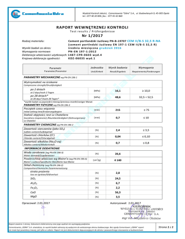 Wydział Kontroli Jakości, Cementownia ”Odra” S.A., ul. Budowlanych 9, 45-005 Opole tel.: 077 40 20 894, fax.: 077 45 42 860 RAPORT WEWNĘTRZNEJ KONTROLI T e st r e su lt s / P rü fe rg eb n i ss e Nr 1/2017 Cement portlandzki żużlowy PN-B-19707 CEM II/B-S 32,5 R-NA (cem en t p o r t ln d z k i żu ż l o wy EN 19 7 -1 C EM II/ B - S 3 2 ,5 R ) Wyniki badań za okres: śr ed n ia m i es ięc zn a gr u d zi eń 2 0 16 Wymagania normowe: PN - EN 19 7 -1 :2 01 2 Deklaracja właściwości użytkowych: 1 48 7 -C PR -0 6 03 w y d .4 Krajowa deklaracja zgodności: K DZ -0 6 03 S w yd .1 Rodzaj materiału: Parametr Jednostka Wynik badania Wymagania Parameter/Parameter Unit/Einheit Result/Ergebnis Requirements/Forderungen [MPa] 16,1 ≥ 10,0 [MPa] 48,6 32,5 ÷ 52,5 [min] 215 ≥ 75 [mm] 0,7 ≤ 10 [%] 2,4 ≤ 3,5 [%] 0,04 ≤ 0,10 [%] 0,7 ≤ 0,8 [%] 26,6 [cm2/g] 4 140 [%] 2,8 SiO2 [%] 24,5 Al2O3 [%] 6,7 Fe2O3 [%] 2,2 CaO MgO [%] 56,3 [%] 3,5 PARAMETRY MECHANICZNE wg PN-EN 196-1 Wytrzymałość na ściskanie Compressive strength/Druckfestigkeit po 2 dniach at 2 days/nach 2 Tagen po 28 dniach* at 28 days*/nach 28 Tagen* *wyniki badań za poprzedni miesiąc/previous month/voriger Monat PARAMETRY FIZYCZNE wg PN-EN 196-3 Początek czasu wiązania Initial setting time/Erstarrungsbeginn Stałość objętości; test Le Chateliera Soundness (expansion) /Raumbeständigkeit (Dehnungsmass) Le Chatelier PARAMETRY CHEMICZNE wg PN-EN 196-2 Zawartość siarczanów (jako SO3) Sulfate content/Sulfatgehalt - Zawartość chlorków (Cl ) Chloride content/Chloridgehalt Zawartość alkaliów (Na2O eq) Alkalies content/Alkalieninhalt INFORMACJE DODATKOWE Woda zarobowa (wg PN-EN 196-3) Water demand/Zugabewasser Powierzchnia właściwa wg Blaine’a (wg PN-EN 196-6) Blaine’s surface/spezifische Oberfläche laut Blaine Skład chemiczny (wg PN-EN 196-2) Composition/chemische Zusammensetzung strata prażenia loss on ignition/Glühverlust Opracował: 2.01.2017 Autoryzował: 2.01.2017 Raport zawiera 1 stronę. Dokument elektroniczny oraz jego wydruk nie wymagają podpisów. Cementownia „ODRA” S.A. oświadcza, że wyniki badań odnoszą się wyłącznie do wskazanego okresu badawczego. Bez zgody Cementowni „ODRA” raport nie może być powielany inaczej, jak tylko w całości. Raport nie jest dokumentem dopuszczającym do obrotu i powszechnego stosowania w budownictwie. Strona 1 z 1