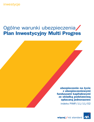 inwestycje Ogólne warunki ubezpieczenia Plan Inwestycyjny Multi Progres ubezpieczenie na życie z ubezpieczeniowymi funduszami kapitałowymi ze składką podstawową opłacaną jednorazowo indeks PIMP/11/11/02 Ogólne warunki ubezpieczenia na życie z ubezpieczeniowymi funduszami kapitałowymi ze składką podstawową opłacaną jednorazowo Plan Inwestycyjny Multi Progres Postanowienia ogólne §1 Niniejsze Ogólne warunki ubezpieczenia na życie z ubezpieczeniowymi funduszami kapitałowymi ze składką podstawową opłacaną jednorazowo Plan Inwestycyjny Multi Progres stosuje się do umów ubezpieczenia na życie z ubezpieczeniowymi funduszami kapitałowymi zawieranych przez AXA Życie Towarzystwo Ubezpieczeń S.A. z Ubezpieczającymi. Definicje §2 Określenia użyte w OWU oraz w innych dokumentach stanowiących integralną część umowy ubezpieczenia oznaczają: 1) alokacja – procentowy podział składki podstawowej lub odpowiednio składki dodatkowej pomiędzy wybrane ubezpieczeniowe fundusze kapitałowe ustalony przez Ubezpieczającego; 2) alokowanie – zapisanie jednostek uczestnictwa na odpowiednim rachunku Ubezpieczającego zgodnie z alokacją; 3) data rozpoczęcia ochrony – określony w polisie dzień zawarcia umowy ubezpieczenia lub odpowiednio następny dzień po upływie terminu do złożenia sprzeciwu w przypadku określonym w § 4 ust. 5 OWU, w którym rozpoczyna się odpowiedzialność Towarzystwa z tytułu udzielania ochrony ubezpieczeniowej; 4) dzień przeliczenia – termin zapisania jednostek uczestnictwa ubezpieczeniowego funduszu kapitałowego na odpowiednim rachunku Ubezpieczającego, przypadający nie później niż czwartego dnia roboczego od dnia zapłaty składki podstawowej lub odpowiednio składki dodatkowej; 5) dzień umorzenia – termin odpisania jednostek uczestnictwa ubezpieczeniowego funduszu kapitałowego z odpowiedniego rachunku Ubezpieczającego, przypadający nie później niż trzeciego dnia roboczego od dnia akceptacji przez Towarzystwo dyspozycji lub wniosku Ubezpieczającego lub Uposażonego lub odpowiednio od dnia pobrania przez Towarzystwo odpowiedniej opłaty; 6) jednostka uczestnictwa – część ubezpieczeniowego funduszu kapitałowego, stanowiąca proporcjonalny udział w aktywach netto tego funduszu; 7) konwersja – zapisanie jednostek uczestnictwa ubezpieczeniowego funduszu kapitałowego za środki pieniężne uzyskane z odpisania jednostek uczestnictwa innego ubezpieczeniowego funduszu kapitałowego; 8) miesiąc polisy – miesiąc rozpoczynający się w dniu początku ochrony ubezpieczeniowej, określonej w polisie lub dokumencie umowy ubezpieczenia, a następnie w takim samym dniu każdego kolejnego miesiąca, a jeżeli nie ma takiego dnia w danym miesiącu – w ostatnim dniu tego miesiąca; 9) OWU – niniejsze Ogólne warunki ubezpieczenia na życie z ubezpieczeniowymi funduszami kapitałowymi ze składką podstawową opłacaną jednorazowo Plan Inwestycyjny Multi Progres; 10) polisa – dokument wystawiany przez Towarzystwo, potwierdzający zawarcie umowy ubezpieczenia; 11) rachunek dodatkowy – wyodrębniony rachunek, na którym ewidencjonowane są jednostki uczestnictwa zapisane za środki pieniężne pochodzące ze składek dodatkowych; 12) rachunek podstawowy – wyodrębniony rachunek, na którym ewidencjonowane są jednostki uczestnictwa zapisane za środki pieniężne pochodzące ze składki podstawowej; 13) rocznica polisy – dzień w każdym roku kalendarzowym obowiązywania umowy ubezpieczenia, odpowiadający dacie rozpoczęcia ochrony, a jeżeli nie ma takiego dnia w danym roku – ostatni dzień miesiąca kalendarzowego, w którym przypada data rozpoczęcia ochrony; 14) rok polisy – 12-miesięczny okres rozpoczynający się od daty rozpoczęcia ochrony; 15) składka dodatkowa – składka nieobowiązkowa z tytułu umowy ubezpieczenia, opłacana przez Ubezpieczającego w dowolnym okresie obowiązywania umowy ubezpieczenia po upływie pierwszego roku polisy; 16) składka podstawowa – składka obowiązkowa z tytułu umowy ubezpieczenia opłacana przez Ubezpieczającego; 17) Strony – Towarzystwo i Ubezpieczający; 18) suma ubezpieczenia – kwota określona w polisie, którą Towarzystwo zobowiązuje się wypłacić w przypadku śmierci Ubezpieczonego w okresie odpowiedzialności Towarzystwa z tytułu ochrony ubezpieczeniowej; 19) świadczenie ubezpieczeniowe – kwota należna osobom uprawnionym w przypadku śmierci Ubezpieczonego w okresie odpowiedzialności Towarzystwa z tytułu udzielania ochrony ubezpieczeniowej; 20) Tabela opłat i limitów – tabela opłat i limitów finansowych do niniejszych OWU; 21) Towarzystwo – AXA Życie Towarzystwo Ubezpieczeń S.A. z siedzibą w Warszawie; 22) Ubezpieczający – osoba fizyczna, która w dniu podpisania wniosku Ubezpieczeniowego ukończyła 18. rok życia, osoba prawna lub jednostka organizacyjna nieposiadająca osobowości prawnej, która zawarła umowę ubezpieczenia i jest zobowiązana do opłacenia składki podstawowej; 23) ubezpieczeniowy fundusz kapitałowy lub fundusz – ubezpieczeniowy fundusz kapitałowy oferowany przez Towarzystwo w związku z umową ubezpieczenia, stanowiący wydzielony fundusz aktywów lokowanych zgodnie z postanowieniami regulaminu właściwego ubezpieczeniowego funduszu kapitałowego; 24) Ubezpieczony – osoba fizyczna, na rzecz której Ubezpieczający zawarł umowę ubezpieczenia; 25) umowa ubezpieczenia – umowa ubezpieczenia na życie z ubezpieczeniowymi funduszami kapitałowymi zawar ta na podstawie OWU; 26) Uposażony – osoba fizyczna, osoba prawna lub jednostka organizacyjna nieposiadająca osobowości prawnej, wskazana przez Ubezpieczonego, uprawniona do otrzymania świadczenia ubezpieczeniowego na wypadek śmierci Ubezpieczonego lub war tości polisy w przypadku określonym w § 8 OWU; 27) war tość dodatkowa polisy – część war tości polisy stanowiąca sumę iloczynów liczby jednostek uczestnictwa każdeg