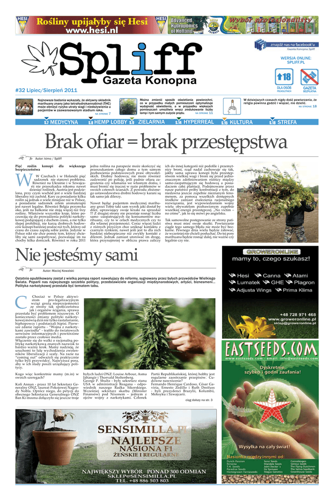 WERSJA ONLINE: spliff.pl Gazeta Konopna #32 Lipiec/Sierpień 2011 pełnoletnich S.8 HEMP MEDYCYNA LOBBY S.9 ZIELARNIA S.14 HYPERREAL S.15 KULTURA S.18 STREFA Brak ofiar = brak przestępstwa Autor: kimo / Spliff Pięć roślin konopi bezpieczeństwa W dla większego W Czechach i w Holandii pięć sadzonek nie stanowi problemu. Również na Ukrainie i w Szwajcarii nie przeszkadza nikomu nawet dziesięć roślinek. Austria jest podzielona, przy czym wschód jest o wiele bardziej liberalny niż zachód. Kary za posiadanie kilku roślin są jednak o wiele mniejsze niż w Polsce, a posiadanie sadzonek celem aromaterapii jest nawet legalne. Również Belgia przymyka oko, jeśli na balkonie nie stoją więcej niż trzy rośliny. Właściwie wszystkie kraje, które poczuwają się do prowadzenia polityki narkotykowej podążającej z duchem czasu, a nie tylko ślepej prohibicji, nie karzą drobnych hodowców konopi bardziej srodze niż tych, którzy od czasu do czasu zapalą sobie jointa. Jedynie w Polsce nikt nie chce pomóc tym, którzy chcieliby się sami zaopatrywać, pozwalając im na choćby kilka doniczek. Również w roku 2011 jedna roślina na parapecie może skończyć się przeszukaniem całego domu a tym samym pozbawienia podstawowych praw obywatelskich. Drobny hodowca, nie może również zadzwonić po policję, jeśli padnie ofiarą zagrożenia czy włamania we własnym domu, i musi bronić się inaczej w razie problemów w swoich czterech ścianach. Z powodu złożonego ustawodawstwa drobni hodowcy karani są tak samo jak dilerzy. Nawet będąc pacjentem medycznej marihuany grozi Tobie taki sam wyrok jaki dostał by diler, uprawiający swoje krzaki na sprzedaż !!! Z drugiej strony nie przestaje rosnąć liczba samo -zaopatrujących się konsumentów marihuany, czy to w celach medycznych czy to dla własnej przyjemności. Coraz więcej ludzi z różnych przyczyn chce uniknąć kontaktu z czarnym rynkiem, nawet jeśli jest to dla nich bardziej niebezpieczne niż zwykły kontakt z dilerem. Jednak zamiast utorować im drogę, która przynajmniej w obliczu prawa zaliczy Nie jesteśmy sami ich do innej kategorii niż pedofile i przemytnicy broni, rząd nadal zachowuje się tak, jakby sama uprawa konopi była przestępstwem wielkiej wagi i broni się przed jednoznacznym zdefiniowaniem różnicy między samo-zaopatrującym się hodowcą a posiadaczem całej plantacji. Podejmowane przez nasze państwo próby konfrontacji z tym, do niedawna jeszcze zupełnie nieznanym fenomenem, za pomocą wszelkich dostępnych środków zamiast znalezienia racjonalnego rozwiązania, jest wypowiedzeniem wojny wielu obywatelom pozbawionym zupełnie wszelkiej energii przestępczej. „No victim – no crime”, jak to się mówi po angielsku. Tak samowolne postępowanie ze strony państwa musi mieć swoje skutki. Powtarzanie ciągle tego samego błędu nie może być bezkarne. Pewnego dnia wielu będzie żałować, że wcześniej nie chcieli posłuchać. Do tej pory marihuana będzie rosnąć dalej, nie ważne czy legalnie czy nie. Autor: Maciej Kowalski Ostatnio opublikowany został z wielką pompą raport nawołujący do reformy, sygnowany przez byłych przywódców Wielkiego Świata. Poparli nas najwyższego szczebla politycy, przedstawiciele organizacji międzynarodowych, artyści, biznesmeni... Polityka narkotykowej przestała być tematem tabu. C Chociaż w Polsce aktywistom pro-legalizacyjnym wciąż grożą nieprzyjemności ze strony tak społeczeństwa jak i organów ścigania, sprawa przestała być problemem niszowym. O konieczności zmiany polityki narkotykowej mówią dziś nie tylko rastafarianie, hiphopowcy i podstarzali hipisi. Pierwsze zdanie raportu - “Wojna z narkotykami zawiodła” - trafiło do światowych serwisów informacyjnych i powtórzone zostało przez czołowe media. Włączenie się do walki o racjonalną politykę narkotykową znanych nazwisk to bardzo ważny krok. Mamy nadzieję, że uruchomi to falę wychodzenia zwolenników liberalizacji z szafy. Na razie na “coming out” odważyli się praktycznie tylko byli przywódcy. Najwyższa pora, aby w ich ślady poszli urzędujący politycy. Kogo więc konkretnie mamy (m.in) w swoich szeregach? Kofi Annan - przez 10 lat Sekretarz Generalny ONZ, laureat Pokojowej Nagrody Nobla. Oprócz niego, do petycji do obecnego Sekretarza Generalnego ONZ Ban Ki-moona dołączyło się jeszcze troje byłych ludzi ONZ: Louise Arbour, Asma Jahangir i Thorvald Stoltenberg. George P. Shultz - były sekretarz stanu USA w administracji Reagana - odpowiednik naszego Radka Sikorskiego. Wcześniej sekretarz skarbu (Minister Finansów) pod Nixonem – jednym z ojców wojny z narkotykami. Członek Partii Republikańskiej, której hobby jest regularne zaostrzanie przepisów. Cudowne nawrócenie? Fernando Henrique Cardoso, César Gaviria, Ernesto Zedillo i Ruth Dreifuss - byli prezydenci Brazylii, Kolumbii, Meksyku i Szwajcarii. ciąg dalszy na str. 3 GAZETA BEZPŁATNA W dzisiejszych czasach nigdy dość powtarzania, że religia powinna godzić i wiązać, nie dzielić. na stronie 18 Można zmienić sposób oświetlania powierzchni, co w przypadku małych pomieszczeń optymalizuje wydajność oświetlenia, a w przypadku większych pomieszczeń umożliwia wręcz zredukowanie liczby na stronie 11 lamp i tym samym zużycie prądu. Najnowsze badania wykazały, że aktywny składnik marihuany znany jako tetrahydrokannabinol (THC) może obniżyć ryzyko utraty wagi i niedożywienia u pacjentów w zaawansowanym stadium raka. na stronie 7 S.7 Dla osób 2 Spliff Gazeta Konopna Newsy Spliff Gazeta Konopna Newsy 3 Autor: BBR Nie jesteśmy sami Chilijscy górnicy uwięzieni w ubiegłym roku przez 69 dni 700 m pod ziemią palili marihuanę, którą przemycali członkowie ich rodzin, wrzucając ją listach przez szyb komunikacyjny. Ostatnio opublikowany został z wielką pompą raport nawołujący do reformy, sygnowany przez byłych przywódców Wielkiego Świata. Popa