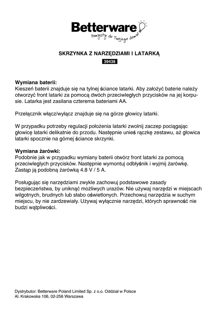 Skrzynka z narzędziami i latarką 39438 Wymiana baterii: Kieszeń baterii znajduje się na tylnej ściance latarki. Aby założyć baterie należy otworzyć front latarki za pomocą dwóch przeciwległych przycisków na jej korpusie. Latarka jest zasilana czterema bateriami AA. Przełącznik włącz/wyłącz znajduje się na górze głowicy latarki. W przypadku potrzeby regulacji położenia latarki zwolnij zaczep pociągając głowicę latarki delikatnie do przodu. Następnie unieś rączkę zestawu, aż głowica latarki spocznie na górnej ściance skrzynki. Wymiana żarówki: Podobnie jak w przypadku wymiany baterii otwórz front latarki za pomocą przeciwleglych przycisków. Następnie wymontuj odbłyśnik i wyjmij żarówkę. Zastąp ją podobną żarówką 4.8 V / 5 A. Posługując się narzędziami zwykle zachowuj podstawowe zasady bezpieczeństwa, by uniknąć możliwych urazów. Nie używaj narzędzi w miejscach wilgotnych, brudnych lub słabo oświetlonych. Przechowuj narzędzia w suchym miejscu, by nie zardzewiały. Używaj wyłącznie narzędzi, których sprawność nie budzi wątpliwości. Dystrybutor: Betterware Poland Limited Sp. z o.o. Oddział w Polsce Al. Krakowska 106, 02-256 Warszawa
