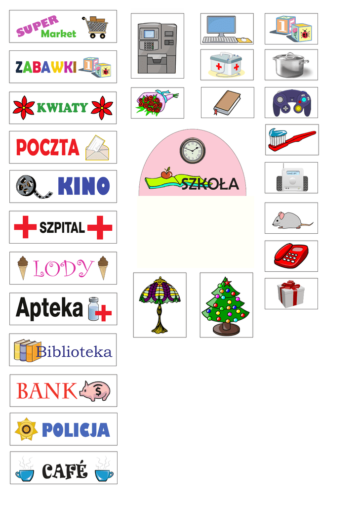 ER P SU Market ZABAWKI KWIATY POCZTA KINO SZPITAL LODY Apteka Biblioteka BANK POLICJA CAFÉ SZKOŁA