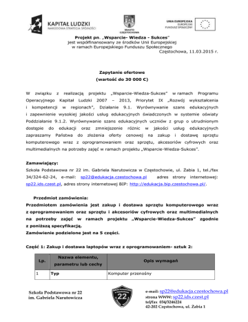 Projekt pn. „Wsparcie- Wiedza - Sukces” jest współfinansowany ze środków Unii Europejskiej w ramach Europejskiego Funduszu Społecznego Częstochowa, 11.03.2015 r. Zapytanie ofertowe (wartość do 30 000 €) W związku z realizacją Operacyjnego i Kapitał kompetencji w projektu Ludzki 2007 regionach”, „Wsparcie-Wiedza-Sukces” – 2013, Działanie Priorytet 9.1. IX w ramach „Rozwój Wyrównywanie szans Programu wykształcenia edukacyjnych i zapewnienie wysokiej jakości usług edukacyjnych świadczonych w systemie oświaty Poddziałanie 9.1.2. Wyrównywanie szans edukacyjnych uczniów z grup o utrudnionym dostępie do zapraszamy edukacji Państwa oraz do zmniejszenie złożenia oferty różnic w cenowej na jakości zakup usług i edukacyjnych dostawę sprzętu komputerowego wraz z oprogramowaniem oraz sprzętu, akcesoriów cyfrowych oraz multimedialnych na potrzeby zajęć w ramach projektu „Wsparcie-Wiedza-Sukces”. Zamawiający: Szkoła Podstawowa nr 22 im. Gabriela Narutowicza w Częstochowie, ul. Żabia 1, tel./fax 34/324-62-24, e-mail: [email protected] adres strony internetowej: sp22.ids.czest.pl, adres strony internetowej BIP: http://edukacja.bip.czestochowa.pl/. Przedmiot zamówienia: Przedmiotem zamówienia jest zakup i dostawa sprzętu komputerowego wraz z oprogramowaniem oraz sprzętu i akcesoriów cyfrowych oraz multimedialnych na potrzeby zajęć w ramach projektu „Wsparcie-Wiedza-Sukces” zgodnie z poniższą specyfikacją. Zamówienie podzielone jest na 5 części. Część 1: Zakup i dostawa laptopów wraz z oprogramowaniem- sztuk 2: Lp. 1 Nazwa elementu, parametru lub cechy Typ Szkoła Podstawowa nr 22 im. Gabriela Narutowicza Opis wymagań Komputer przenośny e-mail: [email protected] strona WWW: sp22.ids.czest.pl tel/fax 034/3246224 42-202 Częstochowa, ul. Żabia 1 Projekt pn. „Wsparcie- Wiedza - Sukces” jest współfinansowany ze środków Unii Europejskiej w ramach Europejskiego Funduszu Społecznego 2 Zastosowanie Komputer będzie stosowany dla potrzeb aplikacji biurowych 3. Płyta główna Płyta główna umożliwiająca obsługę urządzeń określonych specyfikacją 4. Procesor Dedykowany do pracy w komputerach przenośnych, osiągający wynik co najmniej 3805 pkt. w teście Single CPU Systems w kategorii Passmark CPU Mark, opublikowanych według wyników na http://www.cpubenchmark.net stronie - wydruk ze strony załączyć do oferty 5. Zainstalowana pamięć Min. 8 GB RAM 6. Dysk twardy min. 1TB HDD 7. Karta graficzna Zintegrowana 8. Matryca przekątna min. 15.6”, rozdzielczość min. 1366x768 9. Karta dźwiękowa Zgodna z High Definition 10. Napęd optyczny Nagrywarka DVD 11. Karta sieciowa min. 10/100/1000 Mbps 12. Karta sieciowa min. Wi-Fi 802.11 b/g/n bezprzewodowa 13. Złącza USB min. 2 14. Złącza zewnętrzne min. 1x HDMI, 1x VGA (D-sub), 1x wejście mikrofonowe, 1x wyjście słuchawkowe - głośnikowe 15. Zasilanie (bateria) 16. Czytnik kart Szkoła Podstawowa nr 22 im. Gabriela Narutowicza Normatywny czas pracy na akumulatorze pamięci tak e-mail: [email protected] strona WWW: sp22.ids.czest.pl tel/fax 034/3246224 42-202 Częstochowa, ul. Żabia 1 Projekt pn. „Wsparcie- Wiedza - Sukces” jest współfinansowany ze środków Unii Europejskiej w ramach Europejskiego Funduszu Społecznego 17. Klawiatura typu QWERTY z wydzieloną częścią numeryczną 18. Urządzenia wskazujące Zintegrowany TouchPad + mysz optyczna bezprzewodowa 19. Komunikacja Wbudowane urządzenie Bluetooth 20. Dodatkowe informacje Torba odpowiadająca wymiarom laptopa z możliwością zabezpieczenia jego przesuwania się, wykonana z materiału zabezpieczającego przed zbyt niską i zbyt wysoką temperaturą, oraz wilgocią, z kieszenią przednią, wewnętrzną przegrodą na dokumenty, usztywnionymi bokami oraz paskiem na ramię, kolor czarny 21. Zainstalowany operacyjny system Licencja dla Windows7 PRO 64bit Professional, (przeinstalowany na dysku twardym) wraz z nośnikiem pozwalającym na ponowna instalację systemu niewymagającą wpisywania klucza rejestracyjnego lub rejestracji poprzez Internet czy telefon lub oprogramowanie równoważne. Oprogramowanie równoważne musi posiadać następujące cechy: zgodność z interfejsem API systemu minimum Windows XP Pro, możliwość uruchamiania oprogramowania przeznaczonego do pracy na platformie Windows 32 bitowego bez dodatkowego oprogramowania pośredniczącego, możliwość centralnego zarządzania systemem operacyjnym bez dodatkowego oprogramowania za pomocą protokole usług LDAP zarządzania katalogowych kompatybilnych opartą na serwerze opartych ze na strukturą domenowym Windows 2003. 22. Pakiet biurowy Szkoła Podstawowa nr 22 im. Gabriela Narutowicza Pakiet oprogramowania biurowego w wersji dla e-mail: [email protected] strona WWW: sp22.ids.czest.pl tel/fax 034/3246224 42-202 Częstochowa, ul. Żabia 1 Projekt pn. „Wsparcie- Wiedza - Sukces” jest współfinansowany ze środków Unii Europejskiej w ramach Europejskiego Funduszu Społecznego użytkowników instytucjonalnych, zawierający edytor tekstu, arkusz kalkulacyjny, program do tworzenia prezentacji multimedialnych, program do obsługi baz danych oraz klient poczty e-mail. Pakiet musi umożliwiać otwieranie oraz edycję między innymi plików w formacie xls, xslx, doc, docx, pełne wsparcie dla makr w arkuszach kalkulacyjny, dokumentach obsługę danych baz rozwiązania tekstowych Access. równoważne oraz Dopuszcza oferujące się pełną kompatybilność z MS Office 2010 PL. Pełna kompatybilność oznacza, iż dokumenty utworzone w programach z pakietu MS Office 2010 PL wykorzystywane przez zamawiającego (m.in. baza danych PEFS, aplikacja internetowa Sigma) a wyświetlane, drukowane w równoważnym dodatkowej pierwotny uruchamiane, zapisywane oferowanym nie będą ingerencji, format, tj. układ i rozwiązaniu wymagały żadnej zachowany będzie tekstu, tabel, oraz zapewnią pełną obsługę makr i baz danych. Licencja na dostarcz
