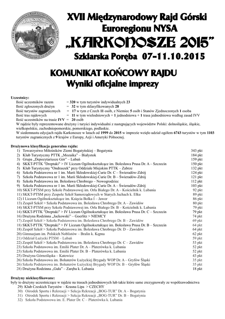 XVII Międzynarodowy Rajd Górski Euroregionu NYSA „KARKONOSZE 2015” Szklarska Poręba 07-11.10.2015 KOMUNIKAT KOŃCOWY RAJDU Wyniki oficjalne imprezy Uczestnicy: Ilość uczestników razem = 320 w tym turystów indywidualnych 23 Ilość zgłoszonych drużyn = 32 w tym sklasyfikowanych 28 Ilość turystów zagranicznych = 17 w tym z Czech 11 osób, z Niemiec 5 osób i Stanów Zjednoczonych 1 osoba Ilość tras rajdowych = 11 w tym wielodniowych + 1 jednodniowa + 1 trasa jednodniowa według zasad IVV Ilość uczestników na trasie IVV = 20 osób W rajdzie były reprezentowane drużyny i turyści indywidualni z następujących województw Polski: dolnośląskie, śląskie, wielkopolskie, zachodniopomorskie, pomorskiego, podlaskie. W siedemnastu edycjach rajdu Karkonosze w latach od 1999 do 2015 w imprezie wzięło udział ogółem 6743 turystów w tym 1103 turystów zagranicznych z 9 krajów z Europy, Azji i Ameryki Północnej. Drużynowa klasyfikacja generalna rajdu: 1) Towarzystwo Miłośników Ziemi Bogatyńskiej – Bogatynia 2) Klub Turystyczny PTTK „Mozaika” – Białystok 3) Grupa „Depozytariusze Gór” – Lubań 4) SKKT-PTTK "Dreptaki" > IV Liceum Ogólnokształcące im. Bolesława Prusa Dr. A – Szczecin 5) Klub Turystyczny "Ondraszek" przy Oddziale Miejskim PTTK – Zabrze 6) Szkoła Podstawowa nr 1 im. Marii Skłodowskiej-Curie Dr. C – Świeradów-Zdrój 7) Szkoła Podstawowa nr 1 im. Marii Skłodowskiej-Curie Dr. B – Świeradów-Zdrój 8) Szkoła Podstawowa im. Bolesława Chrobrego – Nowogrodziec 9) Szkoła Podstawowa nr 1 im. Marii Skłodowskiej-Curie Dr. A – Świeradów-Zdrój 10) SKKT-PTSM przy Szkole Podstawowej im. Orła Białego Dr. A – Kościelnik k. Lubania 11) SKKT-PTSM przy Zespole Szkół Samorządowych w Starych Juchach k. Ełku 12) I Liceum Ogólnokształcące im. Księcia Bolka I – Jawor 13) Zespół Szkół > Szkoła Podstawowa im. Bolesława Chrobrego Dr. A – Zawidów 14) SKKT-PTSM przy Szkole Podstawowej im. Orła Białego Dr. B – Kościelnik k. Lubania 14) SKKT-PTTK "Dreptaki" > IV Liceum Ogólnokształcące im. Bolesława Prusa Dr. C – Szczecin 16) Drużyna Rodzinna „Jackowski” – Goerlitz > NIEMCY 17) Zespół Szkół > Szkoła Podstawowa im. Bolesława Chrobrego Dr. B – Zawidów 18) SKKT-PTTK "Dreptaki" > IV Liceum Ogólnokształcące im. Bolesława Prusa Dr. B – Szczecin 18) Zespół Szkół > Szkoła Podstawowa im. Bolesława Chrobrego Dr. D – Zawidów 20) Gimnazjum im. Polskich Noblistów – Bralin k. Kępna 21) Oddział Łużycki PTSM – Lubań 22) Zespół Szkół > Szkoła Podstawowa im. Bolesława Chrobrego Dr. C – Zawidów 23) Szkoła Podstawowa im. Emilii Plater Dr. A – Platerówka k. Lubania 23) Szkoła Podstawowa im. Emilii Plater Dr. B – Platerówka k. Lubania 25) Drużyna Górnośląska – Katowice 26) Szkoła Podstawowa im. Bohaterów Łużyckiej Brygady WOP Dr. A – Gryfów Śląski 26) Szkoła Podstawowa im. Bohaterów Łużyckiej Brygady WOP Dr. B – Gryfów Śląski 28) Drużyna Rodzinna „Guła” – Zaręba k. Lubania 343 pkt 184 pkt 159 pkt 150 pkt 132 pkt 124 pkt 121 pkt 112 pkt 103 pkt 92 pkt 89 pkt 86 pkt 80 pkt 79 pkt 79 pkt 74 pkt 69 pkt 64 pkt 64 pkt 62 pkt 59 pkt 53 pkt 52 pkt 52 pkt 43 pkt 35 pkt 35 pkt 18 pkt Drużyny nieklasyfikowane: były to drużyny uczestniczące w rajdzie na trasach jednodniowych lub takie które same zrezygnowały ze współzawodnictwa 29) Klub Czeskich Turystów – Krasna Lipa > CZECHY 30) Ośrodek Sportu i Rekreacji > Sekcja Rekreacji „BOG-TUR” Dr. A – Bogatynia 31) Ośrodek Sportu i Rekreacji > Sekcja Rekreacji „BOG-TUR” Dr. B – Bogatynia 32) Szkoła Podstawowa im. E. Plater Dr. C – Platerówka k. Lubania Klasyfikacja indywidualna rajdu: 1) Katarzyna Ziółkowska – Lubań 2) Jadwiga Bystrykowska – Bogatynia 3) Waldemar Hejza – Szczecin 4) Teresa Witek – Bogatynia 4) Teresa Grzybowska – Bogatynia 6) Wiesława Cenian – Bogatynia 7) Waldemar Malewicz – Białystok 7) Barbara Domaszko – Zabrze 9) Marzena Szkudlarek – Bogatynia 9) Kazimierz Woźniak – Wrocław 62 pkt 45 pkt 43 pkt 37 pkt 37 pkt 36 pkt 35 pkt 35 pkt 31 pkt 31 pkt Najlepszą turystką z Powiatu Lubańskiego była Katarzyna Ziółkowska. Najlepszym turystą z Powiatu Lubańskiego był Patryk Jarosz z Lubania. Najstarszą uczestniczką okazała się Ludwika Ledwoń z Katowic (76 lat). Najstarszym uczestnikiem okazał się Stefan Kuźmicki z Białegostoku (70 lat). Najmłodszą uczestniczką była Nadia Mularczyk z Mirska (lat 7). Najmłodszym uczestnikiem był Kacper Słabicki z Zawidowa (lat 6). Wyniki konkursu piosenki turystycznej i ekologicznej: 1) Klub Turystyczny PTTK „Mozaika” – Białystok 2) SKTT-PTSM przy Szkole Podstawowej im. Orła Białego w Kościelniku 3) SKKT-PTSM przy Zespole Szkół Samorządowych w Starych Juchach k. Ełku 4) SKKT-PTTK "Dreptaki" > IV Liceum Ogólnokształcące im. Bolesława Prusa Dr. B – Szczecin 5) Zespól Szkół > Szkoła Podstawowa im. Bolesława Chrobrego Dr. D – Zawidów 9 pkt 8 pkt 7 pkt 6 pkt 5 pkt Wyniki konkursu turystyczno-krajoznawczego drużyn młodszych: 1) Szkoła Podstawowa im. Bolesława Chrobrego – Nowogrodziec 2) Zespół Szkół > Szkoła Podstawowa im. Bolesława Chrobrego Dr. A – Zawidów 3) SKKT-PTSM przy Zespole Szkół Samorządowych w Starych Juchach k. Ełku 8 pkt 6 pkt 4 pkt Wyniki konkursu turystyczno-krajoznawczego drużyn starszych: 1) Towarzystwo Miłośników Ziemi Bogatyńskiej – Bogatynia 2) Grupa „Depozytariusze Gór” – Lubań 3) Klub Turystyczny PTTK „Mozaika” – Białystok Na poszczególnych trasach zwyciężyły drużyny: 1) Towarzystwo Miłośników Ziemi Bogatyńskiej – Bogatynia 2) Klub Turystyczny PTTK „Mozaika” – Białystok 3) Grupa „Depozytariusze Gór” – Lubań 4) Szkoła Podstawowa im. Bolesława Chrobrego – Nowogrodziec 5) Zespół Szkół > Szkoła Podstawowa im. Bolesława Chrobrego Dr. A – Zawidów 6) Szkoła Podstawowa nr 1