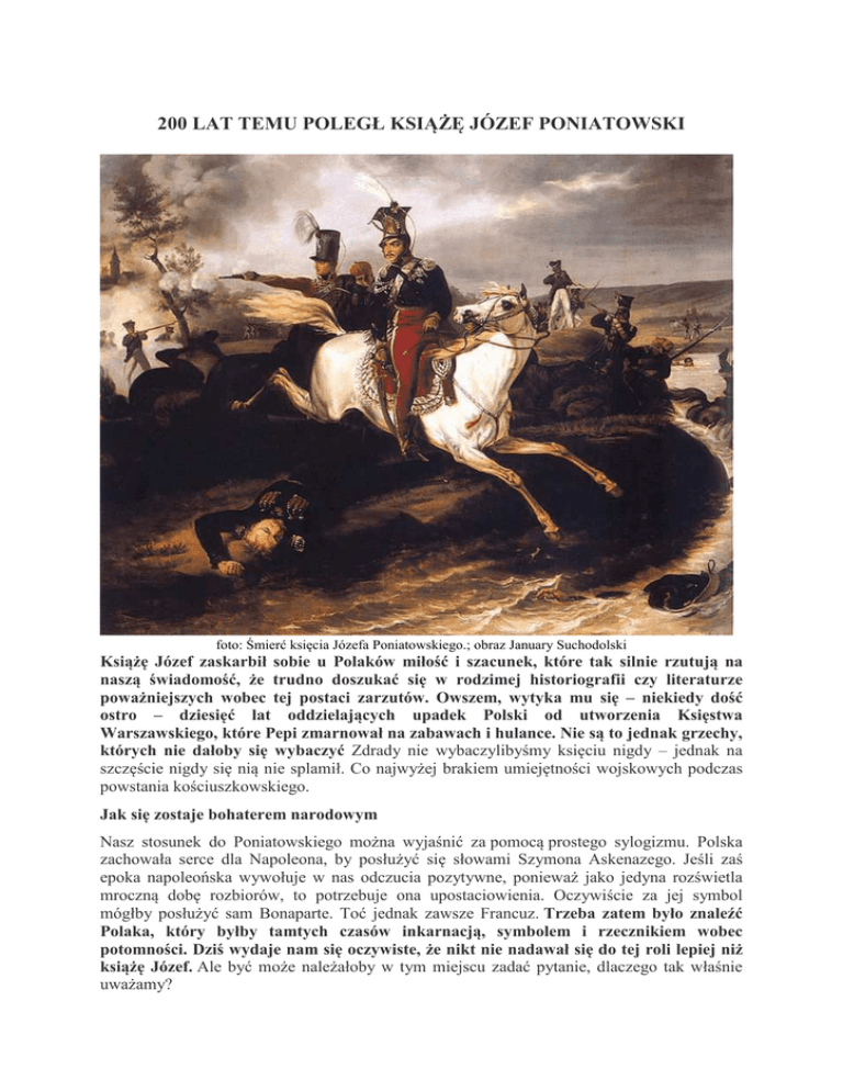 200 LAT TEMU POLEGŁ KSIĄŻĘ JÓZEF PONIATOWSKI foto: Śmierć księcia Józefa Poniatowskiego.; obraz January Suchodolski Książę Józef zaskarbił sobie u Polaków miłość i szacunek, które tak silnie rzutują na naszą świadomość, że trudno doszukać się w rodzimej historiografii czy literaturze poważniejszych wobec tej postaci zarzutów. Owszem, wytyka mu się – niekiedy dość ostro – dziesięć lat oddzielających upadek Polski od utworzenia Księstwa Warszawskiego, które Pepi zmarnował na zabawach i hulance. Nie są to jednak grzechy, których nie dałoby się wybaczyć Zdrady nie wybaczylibyśmy księciu nigdy – jednak na szczęście nigdy się nią nie splamił. Co najwyżej brakiem umiejętności wojskowych podczas powstania kościuszkowskiego. Jak się zostaje bohaterem narodowym Nasz stosunek do Poniatowskiego można wyjaśnić za pomocą prostego sylogizmu. Polska zachowała serce dla Napoleona, by posłużyć się słowami Szymona Askenazego. Jeśli zaś epoka napoleońska wywołuje w nas odczucia pozytywne, ponieważ jako jedyna rozświetla mroczną dobę rozbiorów, to potrzebuje ona upostaciowienia. Oczywiście za jej symbol mógłby posłużyć sam Bonaparte. Toć jednak zawsze Francuz. Trzeba zatem było znaleźć Polaka, który byłby tamtych czasów inkarnacją, symbolem i rzecznikiem wobec potomności. Dziś wydaje nam się oczywiste, że nikt nie nadawał się do tej roli lepiej niż książę Józef. Ale być może należałoby w tym miejscu zadać pytanie, dlaczego tak właśnie uważamy? W wymiarze symbolicznym Konsulat, a później Cesarstwo zbudowane zostały na bazie dwóch pojęć: honneur et patrie (honor i ojczyzna). Traktowano je ze śmiertelną powagą. Nimi też kierował się książę Józef, nie zapominając przy tym o Bogu. I o ile pierwszy zestaw jest typowo francuski, o tyle drugi nosi koloryt lokalny, polski. W tym sensie, będąc wiernym rodzimej tradycji, wpisał się książę Józef w tradycję napoleońską. By zrozumieć, jak do tego doszło, musimy prześledzić jego życiorys Upadek Polski Do roku 1789 książę Józef był w Polsce postacią kompletnie nieznaną. Urodzony w Wiedniu, tamże wychowany, wreszcie oficer austriacki – nie miał czym zapaść w pamięć rodaków. Tymczasem w Rzeczypospolitej rozgrywały się wydarzenia wielkiej wagi. Od 1788 r. obradował w Warszawie sejm, który przeszedł do historii pod nazwą „Wielkiego”. Stanisław August postanowił ściągnąć do kraju bratanka, licząc na to, że przyda się on w rozgrywce politycznej z wrogim mu stronnictwem hetmańskim. Niebawem po przyjeździe – jesienią 1789 r. – decyzją sejmu książę Józef został mianowany generałem-majorem wojsk polskich i jeszcze w tym samym roku oddelegowano go na Ukrainę, gdzie poza zwykłymi czynnościami wojskowymi tworzył stronnictwo sympatyków króla. To właśnie na Kresach południowowschodnich narodzi się sława wojskowa księcia Józefa. Oto wiosną 1792 r. zawiązała się konfederacja targowicka, której członkowie poprosili Katarzynę II o zbrojną pomoc w zniszczeniu ustawy majowej. Caryca „łaskawie” przychyliła się do prośby, wysyłając do Polski swoje wojska. Odpór interwencji ze wschodu miały dać dwie armie: koronna i litewska. Na czele tej pierwszej, operującej właśnie na Ukrainie, stanął książę Józef. Generał lejtnant książę Józef Poniatowski dowódca Korpusu Wojsk Koronnych w wojnie polsko – rosyjskiej 1792 roku 18 czerwca 1792 r. Polacy stoczyli zwycięską bitwę pod Zieleńcami. I chociaż sukces ten nie został wykorzystany, ponieważ przeciwnik zachował zdolność bojową, to miał on ogromne znaczenie psychologiczne. Pamiętać należy, że rozkładająca się od czasów saskich Rzeczpospolita została praktycznie pozbawiona wojska. Często mówi się, że Zieleńce są pierwszym od czasów wiktorii wiedeńskiej zwycięstwem oręża polskiego – i jest to prawda. Na pamiątkę tego wydarzenia Stanisław August ustanowił order Virtuti Militari, a jego pierwszym kawalerem został oczywiście zwycięski wódz – książę Józef. Potem jednak król przystąpił do Targowicy, co wywołało u księcia taki szok, że złożył dymisję. Być może powinien pozostać na stanowisku do końca. Ale czy można winić człowieka za to, że chciał odciąć się od zdradzieckiego postępku stryja? Mógł oczywiście wypowiedzieć posłuszeństwo, dokonać zamachu stanu i ogłosić się dyktatorem. Temu jednak stała na przeszkodzie zależność finansowa od stryja i poczucie wdzięczności za okazywane dotychczas względy. Przed upadkiem Polski zobaczymy księcia Józefa w służbie czynnej raz jeszcze – podczas insurekcji kościuszkowskiej. Wtedy to stając na czele północno-zachodniego odcinka obrony Warszawy obleganej przez Prusaków popełnił błąd, który kosztować go będzie upadek sławy wojskowej zdobytej pod Zieleńcami. Tymczasem nadciągał wieszczony przez Kościuszkę po bitwie pod Maciejowicami finis Poloniae. Minister wojny i wódz naczelny Po upadku Polski książę Józef oddaje się hulankom i rozmyślaniom. Okres ten, zakończony wkroczeniem Napoleona do Warszawy – jakkolwiek interesujący – w przeciwieństwie do poprzedniego, który pokazuje, jak wychowany w Wiedniu Poniatowski staje się polskim patriotą i zdolnym dowódcą, nie wnosi wiele dla zrozumienia, dlaczego Poniatowski stał się symbolem Polski napoleońskiej. W jaki sposób książę Józef został ministrem wojny Księstwa Warszawskiego i wodzem naczelnym? Kandydatów na te dwie funkcje znaleźć można było pod koniec 1806 r. wielu. Pepi miał jednak tę zaletę, że jako arystokrata walczący w obronie Konstytucji, a następnie w powstaniu kościuszkowskim, nie był ani zbyt konserwatywny dla radykałów, ani zbyt postępowy dla kół zachowawczych. Pamiętać zaś trzeba, że Napoleon to człowiek środka – ani jakobin, ani człowiek starego reżimu, i na tej