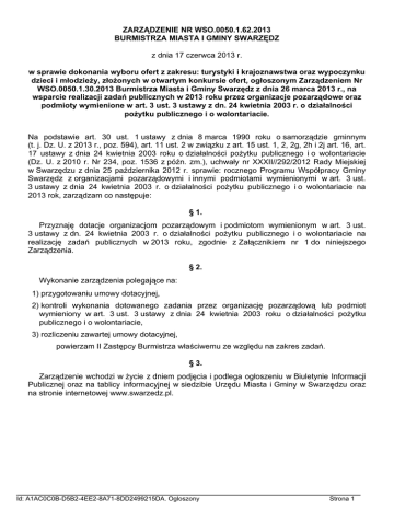 ZARZĄDZENIE NR WSO.0050.1.62.2013 BURMISTRZA MIASTA I GMINY SWARZĘDZ z dnia 17 czerwca 2013 r. w sprawie dokonania wyboru ofert z zakresu: turystyki i krajoznawstwa oraz wypoczynku dzieci i młodzieży, złożonych w otwartym konkursie ofert, ogłoszonym Zarządzeniem Nr WSO.0050.1.30.2013 Burmistrza Miasta i Gminy Swarzędz z dnia 26 marca 2013 r., na wsparcie realizacji zadań publicznych w 2013 roku przez organizacje pozarządowe oraz podmioty wymienione w art. 3 ust. 3 ustawy z dn. 24 kwietnia 2003 r. o działalności pożytku publicznego i o wolontariacie. Na podstawie art. 30 ust. 1 ustawy z dnia 8 marca 1990 roku o samorządzie gminnym (t. j. Dz. U. z 2013 r., poz. 594), art. 11 ust. 2 w związku z art. 15 ust. 1, 2, 2g, 2h i 2j art. 16, art. 17 ustawy z dnia 24 kwietnia 2003 roku o działalności pożytku publicznego i o wolontariacie (Dz. U. z 2010 r. Nr 234, poz. 1536 z późn. zm.), uchwały nr XXXII//292/2012 Rady Miejskiej w Swarzędzu z dnia 25 października 2012 r. sprawie: rocznego Programu Współpracy Gminy Swarzędz z organizacjami pozarządowymi i innymi podmiotami wymienionymi w art. 3 ust. 3 ustawy z dnia 24 kwietnia 2003 r. o działalności pożytku publicznego i o wolontariacie na 2013 rok, zarządzam co następuje: § 1. Przyznaję dotacje organizacjom pozarządowym i podmiotom wymienionym w art. 3 ust. 3 ustawy z dn. 24 kwietnia 2003 r. o działalności pożytku publicznego i o wolontariacie na realizację zadań publicznych w 2013 roku, zgodnie z Załącznikiem nr 1 do niniejszego Zarządzenia. § 2. Wykonanie zarządzenia polegające na: 1) przygotowaniu umowy dotacyjnej, 2) kontroli wykonania dotowanego zadania przez organizację pozarządową lub podmiot wymieniony w art. 3 ust. 3 ustawy z dnia 24 kwietnia 2003 roku o działalności pożytku publicznego i o wolontariacie, 3) rozliczeniu zawartej umowy dotacyjnej, powierzam II Zastępcy Burmistrza właściwemu ze względu na zakres zadań. § 3. Zarządzenie wchodzi w życie z dniem podjęcia i podlega ogłoszeniu w Biuletynie Informacji Publicznej oraz na tablicy informacyjnej w siedzibie Urzędu Miasta i Gminy w Swarzędzu oraz na stronie internetowej www.swarzedz.pl. Id: A1AC0C0B-D5B2-4EE2-8A71-8DD2499215DA. Ogloszony Strona 1 Załącznik nr 1 do Zarządzenia Nr WSO.0050.1.62.2013 Burmistrza Miasta i Gminy Swarzędz z dnia 17 czerwca 2013 r. 1. NAZWA ZADANIA: Wspomaganie działań z zakresu turystyki i krajoznawstwa dzieci i młodzieży. Wnioskodawca Tytuł zadania Przyznana dotacja Oddział PTTK "MEBLARZ" w Swarzędzu Wspomaganie działań z zakresu turystyki i krajoznawstwa dzieci i młodzieży. Organizacja imprez turystycznych. 4 000 Oddział PTTK Poznań- Nowe Miasto w Poznaniu im. Franciszka Jaśkowiaka Wspomaganie działań z zakresu turystyki i krajoznawstwa dzieci i młodzieży- cykl imprez turystyczno- krajoznawczych. 4 000 2. NAZWA ZADANIA: Wsparcie działań w zakresie organizacji wypoczynku wakacyjnego dla dzieci i młodzieży. Wnioskodawca Tytuł zadania Przyznana dotacja Stowarzyszenie Przyjaciół Dzieci Specjalnej Troski im. Leszka Grajka Wsparcie działań w zakresie organizacji wypoczynku wakacyjnego dla dzieci i młodzieży. Wyjazd profilaktyczno- zdrowotny z wypoczynkiem nad morzem dla dzieci i osób niepełnosprawnych z opiekunem. 8 000 Parafia Rzymskokatolicka pw. Św. Mikołaja w Wierzenicy Wsparcie działań w zakresie organizacji wypoczynku wakacyjnego dla dzieci i młodzieży. Organizacja kolonii w formie wycieczki turystycznowypoczynkowej do Władysławowa pt. Poszukiwacze morskich skarbów. 8 000 Stowarzyszenie Kulturalne Orkiestra Dęta w Swarzędzu Wsparcie działań w zakresie organizacji wypoczynku wakacyjnego dla dzieci i młodzieży poprzez współorganizację obozu kondycyjnego. 3 000 Klub Sportowy Victoria Judo Wsparcie działań w zakresie organizacji wypoczynku wakacyjnego dla dzieci i młodzieży. Wypoczynek poprzez sport w Mrzeżynie. DOTACJI NIE PRZYZNANO ZHP- Chorągiew Wielkopolska, Hufiec PoznańRejon ZHP, Ośrodek ZHP Kobylnica Wsparcie działań w zakresie organizacji wypoczynku wakacyjnego dla dzieci i młodzieży. Harcerska Akcja Letnia 2013. 8 000 Fundacja Rozwoju Edukacji i Sportu Wsparcie działań w zakresie organizacji wypoczynku wakacyjnego dla dzieci i młodzieży. Organizacja zajęć sportowych w ramach letniego wypoczynku dla młodzieży w wieku 7- 17 lat w ramach Campu Fundacji Realu Madryt w Gniewinie. DOTACJI NIE PRZYZNANO Id: A1AC0C0B-D5B2-4EE2-8A71-8DD2499215DA. Ogloszony Strona 2 Ludowy Zespół Sportowy PIAST Kobylnica Wsparcie działań w zakresie organizacji wypoczynku wakacyjnego dla dzieci i młodzieży- organizacja jesiennego obozu sportowego. DOTACJI NIE PRZYZNANO Towarzystwo Przyjaciół Dzieci Wielkopolski Oddział Regionalny, Oddział Miejski w Swarzędzu Wsparcie działań w zakresie organizacji wypoczynku wakacyjnego dla dzieci i młodzieży. Organizacja kolonii wypoczynkowych "Słoneczny Brzeg" w Kołobrzegu. 4 000 Diecezjalny Instytut Akcji Katolickiej Archidiecezji Poznańskiej- Parafialny Oddział Akcji Katolickiej Parafii pw. Św. Marcina Wsparcie działań w zakresie organizacji wypoczynku wakacyjnego dla dzieci i młodzieży. Kolonia letnia dla dzieci uczęszczających do Świetlicy Środowiskowo- Profilaktycznej. 5 000 Stowarzyszenie Na Rzecz Dzieci i Młodzieży Lider Wsparcie działań w zakresie organizacji wypoczynku wakacyjnego dla dzieci i młodzieży. Obóz profilaktyczno- integracyjny pt. "Cudze chwalicie, swego nie znacie- najpiękniejsze zakątki Wielkopolski". 5 000 Związek Harcerstwa Rzeczypospolitej- Okręg Wielkopolski, Swarzędzki Szczep Harcerski "Dukt" Wsparcie działań w zakresie organizacji wypoczynku wakacyjnego dla dzieci i młodzieży "Obóz harcerski Łysinin 2013". 8 000 Stowarzyszenie sportowe "Akademia Tenisa Point" Wsparcie działań w zakresie organizacji wypoczynku wakacyjnego dla dzieci i młodzieży. Półkolonie oraz Kolonie tenisowo- sportowe lato 2013. DOTACJI NIE PRZYZNANO ZHP- Chorągi