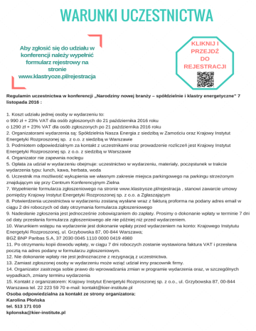 WARUNKI UCZESTNICTWA Aby zgłosić się do udziału w Aby zgłosić się do udziału w konferencji należy wypełnić konferencji należy wypełnić formularz rejestrowy na formularz rejestrowy na stronie stronie www.klastryoze.pl/rejestracja www.klastryoze.pl/rejestracja KLIKNIJ I PRZEJDŹ DO REJESTRACJI Regulamin uczestnictwa w konferencji „Narodziny nowej branży – spółdzielnie i klastry energetyczne” 7 listopada 2016 : 1. Koszt udziału jednej osoby w wydarzeniu to: o 990 zł + 23% VAT dla osób zgłoszonych do 21 października 2016 roku o 1290 zł + 23% VAT dla osób zgłoszonych po 21 października 2016 roku 2. Organizatorami wydarzenia są: Spółdzielnia Nasza Energia z siedzibą w Zamościu oraz Krajowy Instytut Energetyki Rozproszonej sp. z o.o. z siedzibą w Warszawie 3. Podmiotem odpowiedzialnym za kontakt z uczestnikami oraz prowadzenie rozliczeń jest Krajowy Instytut Energetyki Rozproszonej sp. z o.o. z siedzibą w Warszawie 4. Organizator nie zapewnia noclegu 5. Opłata za udział w wydarzeniu obejmuje: uczestnictwo w wydarzeniu, materiały, poczęstunek w trakcie wydarzenia typu: lunch, kawa, herbata, woda 6. Uczestnik ma możliwość wykupienia we własnym zakresie miejsca parkingowego na parkingu strzeżonym znajdującym się przy Centrum Konferencyjnym Zielna 7. Wypełnienie formularza zgłoszeniowego na stronie www.klastryoze.pl/rejestracja , stanowi zawarcie umowy pomiędzy Krajowy Instytut Energetyki Rozproszonej sp. z o.o. a Zgłaszającym 8. Potwierdzenia uczestnictwa w wydarzeniu zostaną wysłane wraz z fakturą proforma na podany adres email w ciągu 2 dni roboczych od daty otrzymania formularza zgłoszeniowego 9. Nadesłanie zgłoszenia jest jednocześnie zobowiązaniem do zapłaty. Prosimy o dokonanie wpłaty w terminie 7 dni od daty przesłania formularza zgłoszeniowego ale nie później niż przed wydarzeniem. 10. Warunkiem wstępu na wydarzenie jest dokonanie wpłaty przed wydarzeniem na konto: Krajowego Instytutu Energetyki Rozproszonej, ul. Grzybowska 87, 00844 Warszawa; BGŻ BNP Paribas S.A, 37 2030 0045 1110 0000 0419 4980 11. Po otrzymaniu kopii dowodu wpłaty, w ciągu 7 dni roboczych zostanie wystawiona faktura VAT i przesłana pocztą na adres podany w formularzu zgłoszeniowym. 12. Nie dokonanie wpłaty nie jest jednoznaczne z rezygnacją z uczestnictwa. 13. Zamiast zgłoszonej osoby w wydarzeniu może wziąć udział inny pracownik firmy. 14. Organizator zastrzega sobie prawo do wprowadzania zmian w programie wydarzenia oraz, w szczególnych wypadkach, zmiany terminu wydarzenia 15. Kontakt z organizatorem: Krajowy Instytut Energetyki Rozproszonej sp. z o.o., ul. Grzybowska 87, 00844 Warszawa tel. 22 223 59 70 email: kontakt@kierinstitute.pl Osoba odpowiedzialna za kontakt ze strony organizatora: Karolina Płońska tel. 513 171 010 kplonska@kierinstitute.pl