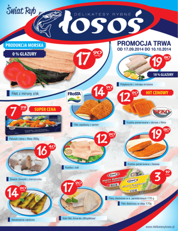 PROMOCJA TRWA PRODUKCJA MORSKA 17 0 % GLAZURY OD 17.09.2014 DO 10.10.2014 90 19 zł/kg 80 zł/kg 10 % GLAZURY 14 Filet z miruny z/sk 7 98 zł/szt. 90 zł/kg Polędwiczki z mintaja mrożone 12 90 zł/kg HIT CENOWY SUPER CENA Kostka panierowana z dorsza z fileta Filet zapiekany z serem 12 Paluszki rybne z fileta 450g 16 40 19 90 zł/kg 80 zł/kg zł/kg Kostka panierowana z łososia Kostka z soli Świeże dzwonki z morszczuka 14 90 zł/kg 17 3 90 zł/kg 19 zł/kg Filety śledziowe w s. pomidorowym 170 g Filet śledziowy w oleju 170g Notototenia wędzona Sola filet /limanda żółtopłetwa/ www.delikatesylosos.pl PROMOCJA TRWA OD 17.09.2014 DO 10.10.2014 4 2 98 zł/szt. 98 1 zł/szt. 98 4 98 SUPER CENA zł/szt. 10 26 90 zł/szt. zł/szt. 50 zł/szt. Śledź opiekany 1800g/1000g Anchovis Helskie w oleju 100 g 6 Sardynka marokańska w oleju liberator 125g Paprykarz szczeciński 250 DEGA 98 4 zł/szt. 98 16 zł/szt. 10 Tatar a’la łosoś 125g 50 zł/kg 4 98 zł/szt. Krewetka gotowana 400g 90 zł/szt. 2 Szprot podwędzany winter 160g HIT CENOWY Szproty wędzone w oleju 250g KSIĄŻĘCE Filety śledziowe w sosie grzybowym 280g Stek z łososia KETA 4 98 zł/szt. 29 8 Owoce morza 6 składników 450g Śledź w sosie pomidorowym 280g KSIĄŻĘCY 3 SUPER CENA 80 zł/kg 79 zł/szt. 98 zł/szt. 99 zł/szt. Tuńczyk w oliwie 160g Tuńczyk w oliwie 80g Tuńczyk w oleju - kawałki 170g 3 Tuńczyk z chilli 160g Tuńczyk w sosie własnym 80g Tuńczyk w sosie własnym - kawałki 170g Krewetki surimi maxi w oleju 29 6 zł/szt. 17 19 zł/kg 5 98 zł/szt. 98 10 90 zł/szt. zł/szt. Wiejskie filety śledziowe 800g Tuńczyk sałatkowy w sosie własnym 185g Filet z makreli smażony 0,8l Tuńczyk sałatkowy w oleju roślinnym 185g Sałatka krabowa z ananasem Filet śledziowy smażony 0,8l www.delikatesylosos.pl PROMOCJA TRWA OD 17.09.2014 DO 10.10.2014 16 50 21 zł/kg 20 % GLAZURY Filet z karmazyna 14 90 zł/kg 90 zł/kg BEZ KONSERWANTÓW 29 80 zł/kg 10 % GLAZURY Śledziki Babuni lekko solone w oleju 19 80 Dzwonki z halibuta mrożone zł/kg SUPER CENA 10 90 zł/kg Matias korzenny Dorsz po chojnicku 14 7 90 zł/kg Ryba po grecku 98 zł/szt. 1 98 HIT CENOWY zł/szt. HIT CENOWY Płaty śledziowe opiekane 900/450 g Szprot smażony w sosie pomidorowym 125g Sałatka śledziowa w sosie tatarskim Sałatka śledziowa w sosie Salsa ODWIEDŹ NASZE DELIKATESY: Knurów ul. Niepodległości 17 tel. + 32 270 36 72 Zabrze ul. Wolności 255a tel. + 32 271 83 92 Ruda Śl. (Wirek) ul. Sienkiewicza 13/1 tel. + 32 244 50 65 Bytom ul. Wrocławska 1a tel. + 32 387 80 55 Ruda Śl. (Godula) ul. Joanny 17/6 tel. + 32 242 02 79 Tychy ul. Żwakowska 15 tel. + 32 238 20 04 www.delikatesylosos.pl