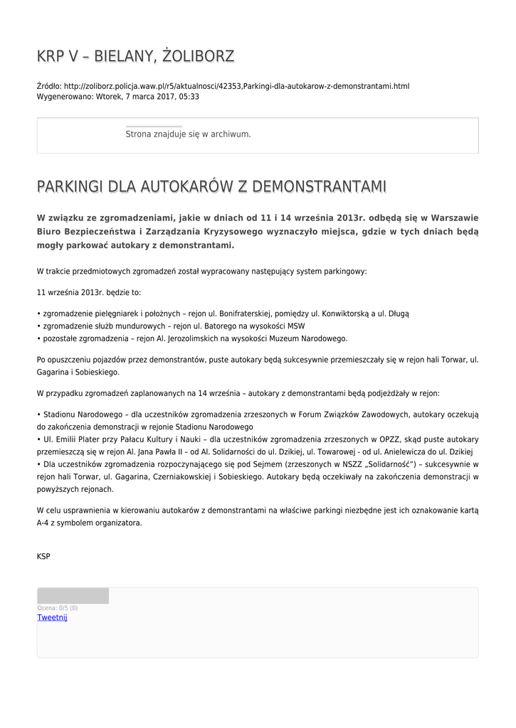 KRP V – BIELANY, ŻOLIBORZ Źródło: http://zoliborz.policja.waw.pl/r5/aktualnosci/42353,Parkingi-dla-autokarow-z-demonstrantami.html Wygenerowano: Wtorek, 7 marca 2017, 05:33 Strona znajduje się w archiwum. PARKINGI DLA AUTOKARÓW Z DEMONSTRANTAMI W związku ze zgromadzeniami, jakie w dniach od 11 i 14 września 2013r. odbędą się w Warszawie Biuro Bezpieczeństwa i Zarządzania Kryzysowego wyznaczyło miejsca, gdzie w tych dniach będą mogły parkować autokary z demonstrantami. W trakcie przedmiotowych zgromadzeń został wypracowany następujący system parkingowy: 11 września 2013r. będzie to: • zgromadzenie pielęgniarek i położnych – rejon ul. Bonifraterskiej, pomiędzy ul. Konwiktorską a ul. Długą • zgromadzenie służb mundurowych – rejon ul. Batorego na wysokości MSW • pozostałe zgromadzenia – rejon Al. Jerozolimskich na wysokości Muzeum Narodowego. Po opuszczeniu pojazdów przez demonstrantów, puste autokary będą sukcesywnie przemieszczały się w rejon hali Torwar, ul. Gagarina i Sobieskiego. W przypadku zgromadzeń zaplanowanych na 14 września – autokary z demonstrantami będą podjeżdżały w rejon: • Stadionu Narodowego – dla uczestników zgromadzenia zrzeszonych w Forum Związków Zawodowych, autokary oczekują do zakończenia demonstracji w rejonie Stadionu Narodowego • Ul. Emilii Plater przy Pałacu Kultury i Nauki – dla uczestników zgromadzenia zrzeszonych w OPZZ, skąd puste autokary przemieszczą się w rejon Al. Jana Pawła II – od Al. Solidarności do ul. Dzikiej, ul. Towarowej - od ul. Anielewicza do ul. Dzikiej • Dla uczestników zgromadzenia rozpoczynającego się pod Sejmem (zrzeszonych w NSZZ „Solidarność”) – sukcesywnie w rejon hali Torwar, ul. Gagarina, Czerniakowskiej i Sobieskiego. Autokary będą oczekiwały na zakończenia demonstracji w powyższych rejonach. W celu usprawnienia w kierowaniu autokarów z demonstrantami na właściwe parkingi niezbędne jest ich oznakowanie kartą A-4 z symbolem organizatora. KSP Ocena: 0/5 (0) Tweetnij