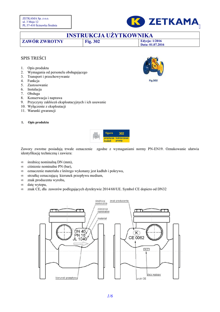 ZETKAMA Sp. z o.o. ul. 3 Maja 12 PL 57-410 Ścinawka Średnia INSTRUKCJA UŻYTKOWNIKA ZAWÓR ZWROTNY Edycja: 1/2016 Data: 01.07.2016 Fig. 302 SPIS TREŚCI 1. 2. 3. 4. 5. 6. 7. 8. 9. 10. 11. Opis produktu Wymagania od personelu obsługującego Transport i przechowywanie Funkcja Zastosowanie Instalacja Obsługa Konserwacja i naprawa Przyczyny zakłóceń eksploatacyjnych i ich usuwanie Wyłączenie z eksploatacji Warunki gwarancji 1. Opis produktu figura 302 przyłącze kołnierzowe prosty kształt Zawory zwrotne posiadają trwałe oznaczenie identyfikację techniczną i zawiera: • • • • • • • zgodne z wymaganiami normy PN-EN19. Oznakowanie ułatwia średnicę nominalną DN (mm), ciśnienie nominalne PN (bar), oznaczenie materiału z którego wykonany jest kadłub i pokrywa, strzałkę oznaczającą kierunek przepływu medium, znak producenta wyrobu, datę wytopu, znak CE, dla zaworów podlegających dyrektywie 2014/68/UE. Symbol CE dopiero od DN32 1/6 Dopuszczalny przeciek podczas próby szczelności zaworów z żeliwa określonej w EN 12266-1 może wynosić: a) w armaturze z miękkim uszczelnieniem - brak widocznego przecieku b) w armaturze z metalowymi siedliskami - 2mm3/s x DN 2. WYMAGANIA OD PERSONELU OBSŁUGUJĄCEGO Personel skierowany do prac montażowych, konserwacyjnych i eksploatacyjnych powinien posiadać kwalifikacje do wykonywania tych prac. Podczas pracy zaworów gorące części zaworu, np. części kadłuba lub pokrywy mogą spowodować oparzenie. Użytkownik w razie potrzeby powinien umieścić osłony izolacyjne i tabliczki ostrzegawcze. 3. TRANSPORT I PRZECHOWYWANIE Transport i przechowywanie powinien odbywać się w temperaturze –200 do 650C, a zawory należy zabezpieczyć przed działaniem sił zewnętrznych i zniszczeniem powłoki malarskiej. Powłoka malarska ma na celu ochronę zaworów przed korozją podczas transportu i składowania. Zawory należy przechowywać w pomieszczeniach wolnych od zanieczyszczeń i zabezpieczonych przed wpływami atmosferycznymi. W pomieszczeniach wilgotnych należy stosować środek wysuszający lub ogrzewanie aby zapobiec tworzeniu się skroplin. Niedopuszczalne jest mocowanie urządzeń dźwigowych za otwory przyłączeniowe. 4. FUNKCJA Zawory zwrotne służą do jednokierunkowego przepływu czynnika i zarazem zabezpieczenia przed wstecznym przepływem. 5. ZASTOSOWANIE Zakres zastosowania podano w karcie katalogowej. Czynnik roboczy powoduje nakaz lub zakaz stosowania określonych materiałów. Zawory zaprojektowano dla normalnych warunków użytkowania. W przypadku warunków pracy przekraczających te wymagania, jak np. w przypadku czynników agresywnych czy ściernych użytkownik powinien zwrócić się przed złożeniem zamówienia z zapytaniem do producenta. Przy doborze armatury do konkretnego czynnika pomocny może być „Wykaz odporności chemicznej” zamieszczony na stronie internetowej producenta obok kart katalogowych. Ciśnienie robocze należy dostosować do maksymalnej temperatury czynnika, zgodnie z poniższymi tabelami. Zawór zwrotny Fig. 302 Wg EN 1092-2 Materiał Temperatura [º C] PN -10 do 120 150 180 2/6 200 230 250 300 EN-GJL250 16 16 bar 14,4 bar 13,4 bar 12,8 bar 11,8 bar 11,2 bar 9,6 bar Zawór zwrotny Fig. 302 Wg EN 1092-2 Temperatura [º C] Materiał PN -10 do 120 150 180 200 230 250 300 EN-GJL250 10 10 bar 9 bar 8,4 bar 8 bar 7,4 bar 7 bar 6 bar Za prawidłowy dobór armatury do warunków pracy odpowiedzialność ponosi projektant instalacji. 6. INSTALACJA Przy montażu zaworów zwrotnych należy przestrzegać następujących zasad: - ocenić przed montażem czy armatura nie została uszkodzona w czasie transportu lub przechowywania, oraz upewnić się, że zastosowane zawory są właściwe dla eksploatacyjnych parametrów i mediów w danej instalacji, - zdjąć zaślepki jeżeli zawory zwrotne kołnierzowe są w nie wyposażone, zaślepka - wyjąć znajdujące się wewnątrz kadłuba zabezpieczenia klapy (przed jej przemieszczaniem na czas transportu) sprawdzić , czy wnętrze armatury jest wolne od ciał obcych, prowadzić przewody parowe w taki sposób by zapobiec gromadzeniu się wody zabezpieczyć armaturę przy pracach np. spawalniczych , przed odpryskami, a użyte tworzywa przed nadmierną temperaturą, Rurociąg do którego montuje się zawory należy tak ułożyć i zamontować, by kadłub zaworu nie przenosił momentów gnących oraz nie był rozciągany. Połączenia śrubowe na rurociągu nie mogą wprowadzać dodatkowych naprężeń wytrzymałościowych wynikających z nadmiernego ich dokręcenia, a rodzaj materiałów części złącznych musi być dostosowany do parametrów roboczych instalacji. - stosować kompensatory w celu zmniejszenia wpływu rozszerzalności termicznej rurociągów, Instalować zawór tak , aby kierunek przepływu czynnika był zgodny ze strzałką umieszczoną kadłubie. - na zawory zwrotne klapowe można montować na rurociągach poziomych ( pokrywą do góry ) i na pionowych (wtedy przepływ czynnika musi następować z dołu do góry ); należy zwracać uwagę na to aby oś obrotu klapy znajdowała się w płaszczyźnie poziomej; zawory z dźwignią i ciężarem montować tylko na rurociągach poziomych pokrywą do góry, 3/6 - przed uruchomieniem instalacji, a zwłaszcza po przeprowadzonych naprawach przepłukać system przewodów zamontowanie osadnika – filtra siatkowego przed zaworem zwiększa pewność jego poprawnego funkcjonowania 7. OBSŁUGA Podczas obsługi należy przestrzegać następujących zasad: - proces uruchomienia – włączenia do ruchu należy prowadzić w sposób eliminujący występowanie nagłych zmian temperatury i ciśnienia, - zawory działają automatycznie i nie wymagają obsługi podczas pracy - zawory Fig.302.11, 302.21, 302.16, 302.26 posiadają układ dźwigniowo-ciężarowy, który przyśpiesza ruch zamykający i zwiększa nacisk na powierzchnię uszczelniającą w stanie zamkniętym zaworu; położenie ciężarka
