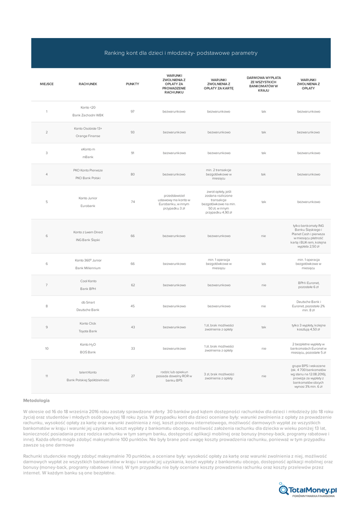 Ranking kont dla dzieci i młodzieży- podstawowe parametry MIEJSCE RACHUNEK PUNKTY WARUNKI ZWOLNIENIA Z OPŁATY ZA PROWADZENIE RACHUNKU WARUNKI ZWOLNIENIA Z OPŁATY ZA KARTĘ DARMOWA WYPŁATA ZE WSZYSTKICH BANKOMATÓW W KRAJU WARUNKI ZWOLNIENIA Z OPŁATY 97 bezwarunkowo bezwarunkowo tak bezwarunkowo 93 bezwarunkowo bezwarunkowo tak bezwarunkowo 91 bezwarunkowo bezwarunkowo tak bezwarunkowo 80 bezwarunkowo min. 2 transakcje bezgotówkowe w miesiącu tak bezwarunkowo 74 przedstawiciel ustawowy ma konto w Eurobanku, w innym przypadku 3 zł zwrot opłaty, jeśli zostana rozliczone transakcje bezgotówkowe na min. 50 zł, w innym przypadku 4,90 zł tak bezwarunkowo Konto <20 1 Bank Zachodni WBK Konto Osobiste 13+ 2 Orange Finanse eKonto m 3 mBank PKO Konto Pierwsze 4 PKO Bank Polski Konto Junior 5 Eurobank 66 bezwarunkowo bezwarunkowo nie tylko bankomaty ING Banku Śląskiego i Planet Cash i pierwsza w miesiącu płatność kartą i BLIK-iem, kolejna wypłata 2,50 zł 66 bezwarunkowo min. 1 operacja bezgotówkowa w miesiącu tak min. 1 operacja bezgotówkowa w miesiącu 62 bezwarunkowo bezwarunkowo nie BPH i Euronet, pozostałe 6 zł 45 bezwarunkowo bezwarunkowo nie Deutsche Bank i Euronet, pozostałe 2% min. 8 zł 43 bezwarunkowo 1 zł, brak możliwości zwolnienia z opłaty tak tylko 3 wypłaty, kolejne kosztują 4,50 zł 33 bezwarunkowo 1 zł, brak możliwości zwolnienia z opłaty nie 2 bezpłatne wypłaty w bankomatach Euronet w miesiącu, pozostałe 5 zł 27 rodzic lub opiekun posiada dowolny ROR w banku BPS 3 zł, brak możliwości zwolnienia z opłaty nie grupa BPS i wskazane (ok. 4 700 bankomatów wg stanu na 12.08.2016), prowizja za wypłaty z bankomatów obcych wynosi 3% min. 6 zł Konto z Lwem Direct 6 ING Bank Śląski 6 Konto 360o Junior Bank Millennium Cool Konto 7 Bank BPH db Smart 8 Deutsche Bank Konto Click 9 Toyota Bank 10 Konto H2O BOŚ Bank talent Konto 11 Bank Polskiej Spółdzielności Metodologia W okresie od 16 do 18 września 2016 roku zostały sprawdzone oferty 30 banków pod kątem dostępności rachunków dla dzieci i młodzieży (do 18 roku życia) oraz studentów i młodych osób powyżej 18 roku życia. W przypadku kont dla dzieci oceniane były: warunki zwolnienia z opłaty za prowadzenie rachunku, wysokość opłaty za kartę oraz warunki zwolnienia z niej, koszt przelewu internetowego, możliwość darmowych wypłat ze wszystkich bankomatów w kraju i warunki jej uzyskania, koszt wypłaty z bankomatu obcego, możliwość założenia rachunku dla dziecka w wieku poniżej 13 lat, konieczność posiadania przez rodzica rachunku w tym samym banku, dostępność aplikacji mobilnej oraz bonusy (money-back, programy rabatowe i inne). Każda oferta mogła zdobyć maksymalnie 100 punktów. Nie były brane pod uwagę koszty prowadzenia rachunku, ponieważ w tym przypadku zawsze są one darmowe Rachunki studenckie mogły zdobyć maksymalnie 70 punktów, a oceniane były: wysokość opłaty za kartę oraz warunki zwolnienia z niej, możliwość darmowych wypłat ze wszystkich bankomatów w kraju i warunki jej uzyskania, koszt wypłaty z bankomatu obcego, dostępność aplikacji mobilnej oraz bonusy (money-back, programy rabatowe i inne). W tym przypadku nie były oceniane koszty prowadzenia rachunku oraz koszty przelewów przez internet. W każdym banku są one bezpłatne.
