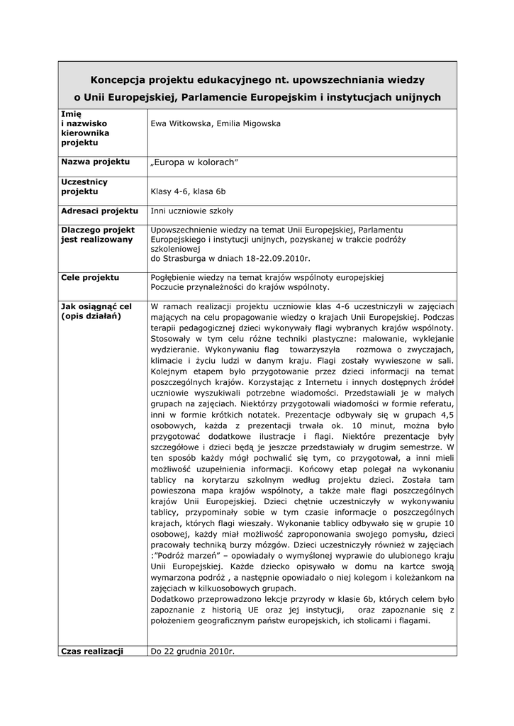Koncepcja projektu edukacyjnego nt. upowszechniania wiedzy o Unii Europejskiej, Parlamencie Europejskim i instytucjach unijnych Imię i nazwisko kierownika projektu Ewa Witkowska, Emilia Migowska Nazwa projektu „Europa w kolorach” Uczestnicy projektu Klasy 4-6, klasa 6b Adresaci projektu Inni uczniowie szkoły Dlaczego projekt jest realizowany Upowszechnienie wiedzy na temat Unii Europejskiej, Parlamentu Europejskiego i instytucji unijnych, pozyskanej w trakcie podróży szkoleniowej do Strasburga w dniach 18-22.09.2010r. Cele projektu Pogłębienie wiedzy na temat krajów wspólnoty europejskiej Poczucie przynależności do krajów wspólnoty. Jak osiągnąć cel (opis działań) W ramach realizacji projektu uczniowie klas 4-6 uczestniczyli w zajęciach mających na celu propagowanie wiedzy o krajach Unii Europejskiej. Podczas terapii pedagogicznej dzieci wykonywały flagi wybranych krajów wspólnoty. Stosowały w tym celu różne techniki plastyczne: malowanie, wyklejanie wydzieranie. Wykonywaniu flag towarzyszyła rozmowa o zwyczajach, klimacie i życiu ludzi w danym kraju. Flagi zostały wywieszone w sali. Kolejnym etapem było przygotowanie przez dzieci informacji na temat poszczególnych krajów. Korzystając z Internetu i innych dostępnych źródeł uczniowie wyszukiwali potrzebne wiadomości. Przedstawiali je w małych grupach na zajęciach. Niektórzy przygotowali wiadomości w formie referatu, inni w formie krótkich notatek. Prezentacje odbywały się w grupach 4,5 osobowych, każda z prezentacji trwała ok. 10 minut, można było przygotować dodatkowe ilustracje i flagi. Niektóre prezentacje były szczegółowe i dzieci będą je jeszcze przedstawiały w drugim semestrze. W ten sposób każdy mógł pochwalić się tym, co przygotował, a inni mieli możliwość uzupełnienia informacji. Końcowy etap polegał na wykonaniu tablicy na korytarzu szkolnym według projektu dzieci. Została tam powieszona mapa krajów wspólnoty, a także małe flagi poszczególnych krajów Unii Europejskiej. Dzieci chętnie uczestniczyły w wykonywaniu tablicy, przypominały sobie w tym czasie informacje o poszczególnych krajach, których flagi wieszały. Wykonanie tablicy odbywało się w grupie 10 osobowej, każdy miał możliwość zaproponowania swojego pomysłu, dzieci pracowały techniką burzy mózgów. Dzieci uczestniczyły również w zajęciach :”Podróż marzeń” – opowiadały o wymyślonej wyprawie do ulubionego kraju Unii Europejskiej. Każde dziecko opisywało w domu na kartce swoją wymarzona podróż , a następnie opowiadało o niej kolegom i koleżankom na zajęciach w kilkuosobowych grupach. Dodatkowo przeprowadzono lekcje przyrody w klasie 6b, których celem było zapoznanie z historią UE oraz jej instytucji, oraz zapoznanie się z położeniem geograficznym państw europejskich, ich stolicami i flagami. Czas realizacji Do 22 grudnia 2010r. projektu Przewidywany efekt (rezultat) Dekoracje, wystawka prac, przedstawienie, kolorowe mapki Europy Proponowana Formy plastyczne, pogadanki, przedstawienia forma rozpowszechnienia rezultatów Harmonogram zrealizowanego projektu Co zostało zrealizowane? Na zajęciach terapii pedagogicznej dzieci wykonywały flagi państw Unii Europejskiej. W jakim terminie? Październik 2010 Można je obejrzeć w sali terapeutycznej Przez kogo? Ewa Witkowska, Emilia Migowska Dzieci przygotowywały informacje na temat krajów Unii Listopad 2010 Europejskiej, następnie prezentowały je na zajęciach terapii pedagogicznej Ewa Witkowska, Emilia Migowska Podsumowaniem wyżej wymienionych działań było wykonanie przez dzieci tablicy na korytarzu szkolnym, znalazła się tam mapa Unii oraz małe flagi poszczególnych państw Listopad 2010 Ewa Witkowska, Emilia Migowska Przeprowadzenie lekcji przyrody z zakresu położenia geograficznego i stolic państw europejskich. Listopad 2010 Ewa Witkowska, Emilia Migowska Grudzień 2010 Ewa Witkowska, Emilia Migowska Wykonanie kolorowych mapek Europy. Dzieci uczestniczyły w zajęciach: „Podróż marzeń”opowiadały o wymyślonej podróży do ulubionego kraju Unii Informacja o ewaluacji Ewaluacja miała miejsce na zajęciach w formie rozmowy z dziećmi. Przeważały opinie pozytywne, zwłaszcza podobało się wykonywanie flag krajów Unii różnymi technikami plastycznymi. Szkoła podstawowa nr 162 w Łodzi