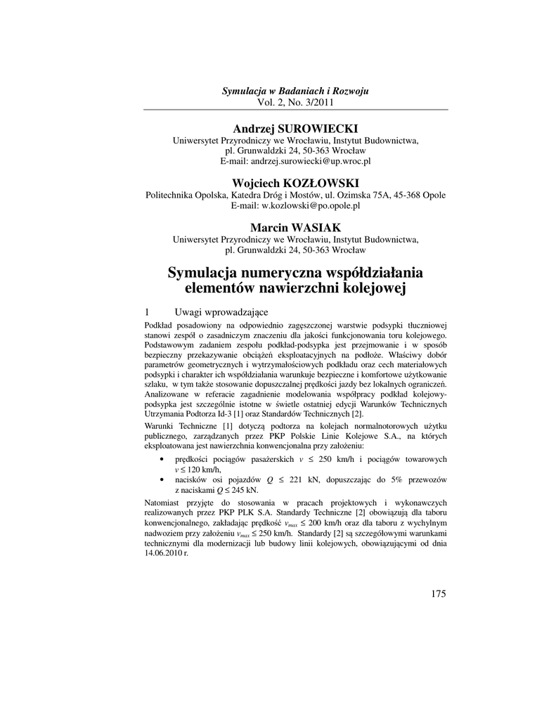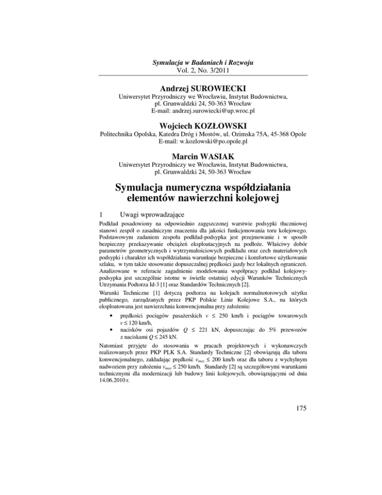 Symulacja w Badaniach i Rozwoju Vol. 2, No. 3/2011 Andrzej SUROWIECKI Uniwersytet Przyrodniczy we Wrocławiu, Instytut Budownictwa, pl. Grunwaldzki 24, 50-363 Wrocław E-mail: [email protected] Wojciech KOZŁOWSKI Politechnika Opolska, Katedra Dróg i Mostów, ul. Ozimska 75A, 45-368 Opole E-mail: [email protected] Marcin WASIAK Uniwersytet Przyrodniczy we Wrocławiu, Instytut Budownictwa, pl. Grunwaldzki 24, 50-363 Wrocław Symulacja numeryczna współdziałania elementów nawierzchni kolejowej 1 Uwagi wprowadzające Podkład posadowiony na odpowiednio zagęszczonej warstwie podsypki tłuczniowej stanowi zespół o zasadniczym znaczeniu dla jakości funkcjonowania toru kolejowego. Podstawowym zadaniem zespołu podkład-podsypka jest przejmowanie i w sposób bezpieczny przekazywanie obciążeń eksploatacyjnych na podłoże. Właściwy dobór parametrów geometrycznych i wytrzymałościowych podkładu oraz cech materiałowych podsypki i charakter ich współdziałania warunkuje bezpieczne i komfortowe użytkowanie szlaku, w tym także stosowanie dopuszczalnej prędkości jazdy bez lokalnych ograniczeń. Analizowane w referacie zagadnienie modelowania współpracy podkład kolejowypodsypka jest szczególnie istotne w świetle ostatniej edycji Warunków Technicznych Utrzymania Podtorza Id-3 [1] oraz Standardów Technicznych [2]. Warunki Techniczne [1] dotyczą podtorza na kolejach normalnotorowych użytku publicznego, zarządzanych przez PKP Polskie Linie Kolejowe S.A., na których eksploatowana jest nawierzchnia konwencjonalna przy założeniu: • prędkości pociągów pasażerskich v ≤ 250 km/h i pociągów towarowych v ≤ 120 km/h, • nacisków osi pojazdów Q ≤ 221 kN, dopuszczając do 5% przewozów z naciskami Q ≤ 245 kN. Natomiast przyjęte do stosowania w pracach projektowych i wykonawczych realizowanych przez PKP PLK S.A. Standardy Techniczne [2] obowiązują dla taboru konwencjonalnego, zakładając prędkość vmax ≤ 200 km/h oraz dla taboru z wychylnym nadwoziem przy założeniu vmax ≤ 250 km/h. Standardy [2] są szczegółowymi warunkami technicznymi dla modernizacji lub budowy linii kolejowych, obowiązującymi od dnia 14.06.2010 r. 175 Andrzej SUROWIECKI, Wojciech KOZŁOWSKI, Marcin WASIAK 2 Modele i zakres ich stosowania Analizowanym obiektem jest model numeryczny podkładu kolejowego, pogrążonego w warstwie podsypki tłuczniowej o ustalonej grubości i niezmiennych cechach wytrzymałościowych [4]. Celem badań jest określenie wartości i rozkładu naprężeń normalnych w podkładzie, przy założeniu zmiennych parametrów dotyczących: • materiału, z którego jest wykonany podkład (analizowane są dwa rodzaje podkładów drewnianych i dwa strunobetonowych), • podłoża tworzonego przez podsypkę tłuczniową (stopień zagęszczenia i rozkład stref zagęszczenia, moduł sprężystości kruszywa). Zasadniczym (analitycznym) elementem badań jest ocena stanu naprężeń normalnych (rozkład wartości naprężeń w profilu podłużnym podkładu), sporządzona na podstawie symulacji eksploatacyjnego obciążenia podkładów posadowionych na podsypce. Symulację wykonano w programie numerycznym Autodesk Robot Structural Analysis 2010 [4]. Wspomniana aplikacja umożliwia wygenerowanie modelu obliczeniowego konstrukcji o parametrach identycznych lub zbliżonych do rzeczywistych [3]. Modelem badawczym jest zespół podkład-podsypka, obciążony statycznym naciskiem osiowym Q = 221 kN (pojazd nieruchomy) [3, 4]. Przyjęto założenie o prostym odcinku toru, znajdującym się na szlaku. Podkład potraktowano jako belkę prostopadłościenną, którą następnie zamodelowano elementem tarczowym. Wysokość i długość podkładu odwzorowano w sposób rzeczywisty. Analizie poddano następujące rodzaje i typy podkładów: drewniany belkowy IB wykonany z drewna sosnowego C40, drewniany belkowy IB z drewna dębowego D70, strunobetonowy PS-83 i PS-94. 176 Symulacja numeryczna współdziałania elementów nawierzchni kolejowej Rys. 1. Modele badawcze - schematy posadowienia podkładu na podsypce [4] Fig. 1.Research models - schemes of foundation sleeper on ballasted [4] Modele badawcze, różniące się sposobem podparcia podkładu na podsypce pokazano na rysunku 1 [4]. Założono w modelu podsypkę wykonaną z tłucznia granitowego frakcji 31,5/63 mm, o grubości warstwy ht = 0,4 m. Sposób podparcia scharakteryzowano parametrami: konfiguracja stref zagęszczenia, wartość stopnia zagęszczenia w zakresie IS 177 Andrzej SUROWIECKI, Wojciech KOZŁOWSKI, Marcin WASIAK = 0,9-1,00. Podkład jest obciążany dwoma pionowymi naciskami skupionymi o wartości 0,5⋅ Q = 0,5⋅ 221 kN, które przetransformowano na obciążenie równomiernie rozłożone o intensywności q = 750 kN/m, działające na szerokości stopek szyn typu 60E1. Oszacowanie wartości naprężeń normalnych w podkładach wykonano w charakterystycznych punktach przekroju podłużnego, założonych: w osi poziomej, na krawędzi górnej i dolnej podkładu, w pionowej osi symetrii podkładu, w pionowych przekrojach podkładu pod osiami symetrii szyn, na skrajnych krawędziach podkładu. Schemat rozmieszczenia punktów pomiarowych w przekroju podłużnym podkładu znajduje się na rysunku 2 [4]. Rys. 2. Rozmieszczenie punktów pomiarowych w przekroju podłużnym podkładu [4] Fig. 2. Distribution of measurement points in the longitudinal sleeper [4] Problem modelowania wstępnego sprężenia podkładów strunobetonowych rozwiązano, wykonując uproszczenie, polegające na wprowadzeniu siły sprężającej (jako obciążenie skupione) w sposób centryczny, w linii wyznaczającej środek ciężkości strun sprężających element. W podkładzie typu PS-83 sprężającą siłę dobrano na podstawie dokumentacji technicznej dostarczonej przez producenta. Wartość tej siły po uwzględnieniu strat wynosi 300 kN. Konstruując model, wartość tę podzielono na trzynaście elementów cząstkowych i następnie za