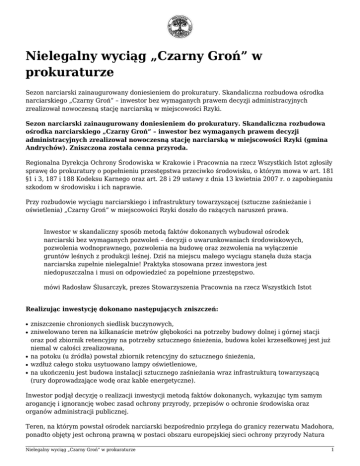 Nielegalny wyciąg „Czarny Groń” w prokuraturze Sezon narciarski zainaugurowany doniesieniem do prokuratury. Skandaliczna rozbudowa ośrodka narciarskiego „Czarny Groń” – inwestor bez wymaganych prawem decyzji administracyjnych zrealizował nowoczesną stację narciarską w miejscowości Rzyki. Sezon narciarski zainaugurowany doniesieniem do prokuratury. Skandaliczna rozbudowa ośrodka narciarskiego „Czarny Groń” – inwestor bez wymaganych prawem decyzji administracyjnych zrealizował nowoczesną stację narciarską w miejscowości Rzyki (gmina Andrychów). Zniszczona została cenna przyroda. Regionalna Dyrekcja Ochrony Środowiska w Krakowie i Pracownia na rzecz Wszystkich Istot zgłosiły sprawę do prokuratury o popełnieniu przestępstwa przeciwko środowisku, o którym mowa w art. 181 §1 i 3, 187 i 188 Kodeksu Karnego oraz art. 28 i 29 ustawy z dnia 13 kwietnia 2007 r. o zapobieganiu szkodom w środowisku i ich naprawie. Przy rozbudowie wyciągu narciarskiego i infrastruktury towarzyszącej (sztuczne zaśnieżanie i oświetlenia) „Czarny Groń” w miejscowości Rzyki doszło do rażących naruszeń prawa. Inwestor w skandaliczny sposób metodą faktów dokonanych wybudował ośrodek narciarski bez wymaganych pozwoleń – decyzji o uwarunkowaniach środowiskowych, pozwolenia wodnoprawnego, pozwolenia na budowę oraz zezwolenia na wyłączenie gruntów leśnych z produkcji leśnej. Dziś na miejscu małego wyciągu stanęła duża stacja narciarska zupełnie nielegalnie! Praktyka stosowana przez inwestora jest niedopuszczalna i musi on odpowiedzieć za popełnione przestępstwo. mówi Radosław Ślusarczyk, prezes Stowarzyszenia Pracownia na rzecz Wszystkich Istot Realizując inwestycję dokonano następujących zniszczeń: ● ● ● ● ● zniszczenie chronionych siedlisk buczynowych, zniwelowano teren na kilkanaście metrów głębokości na potrzeby budowy dolnej i górnej stacji oraz pod zbiornik retencyjny na potrzeby sztucznego śnieżenia, budowa kolei krzesełkowej jest już niemal w całości zrealizowana, na potoku (u źródła) powstał zbiornik retencyjny do sztucznego śnieżenia, wzdłuż całego stoku usytuowano lampy oświetleniowe, na ukończeniu jest budowa instalacji sztucznego zaśnieżania wraz infrastrukturą towarzyszącą (rury doprowadzające wodę oraz kable energetyczne). Inwestor podjął decyzję o realizacji inwestycji metodą faktów dokonanych, wykazując tym samym arogancję i ignorancję wobec zasad ochrony przyrody, przepisów o ochronie środowiska oraz organów administracji publicznej. Teren, na którym powstał ośrodek narciarski bezpośrednio przylega do granicy rezerwatu Madohora, ponadto objęty jest ochroną prawną w postaci obszaru europejskiej sieci ochrony przyrody Natura Nielegalny wyciąg „Czarny Groń” w prokuraturze 1 2000 „Beskid Mały”. Przez teren przebiega korytarz ekologiczny podlegający ochronie na mocy przepisów art. 10 Dyrektywy Rady 92/43/EWG z dnia 21 maja 1992 roku w sprawie ochrony siedlisk naturalnych oraz dzikiej fauny i flory. Lasy tego obszaru mają status ochronny. Wobec poczynań inwestora Pracownia domagać się będzie: 1. wyciągnięcia konsekwencji w stosunku do inwestora, który dopuścił się naruszenia prawa i zagrożenia środowiska, 2. zapewnienia przeprowadzenia działań mających na celu ochronę środowiska przyrodniczego w rejonie zrealizowanego przedsięwzięcia, 3. zapewnienia przeprowadzenia adekwatnych do zniszczeń kompensacji przyrodniczych, 4. natychmiastowe wstrzymanie realizacji inwestycji w trybie art. 37 ustawy o ochronie przyrody oraz nakazanie przeprowadzenia odpowiedniej kompensacji przez Regionalną Dyrekcję Ochrony Środowiska w Krakowie, 5. odmowę uzgodnienia uwarunkowań środowiskowych przez RDOŚ dla już powstałej inwestycji. Beskid Mały – pasmo stanowiące część Beskidów Zachodnich ciągnący się od Bramy Wilkowickiej i doliny Białej na zachodzie do doliny Skawy na wschodzie. Część wschodnia Beskidu Małego, na terenie którego znajduje się inwestycja, nazywa się Góry Zasolskie. Obszary leśne Beskidu Małego obejmują niemal wyłącznie siedliska lasu dolnoreglowego. Składają się głównie z buków, jodłów i świerków. Osobliwością jest szczyt Łamanej Skały, który jest porośnięty rodzimym 100-letnm lasem świerkowym przypominający płat regla górnego, pomimo wysokości, na której rośnie. Jest to spowodowane wpływami i warunkami podłoża – rośnie on bowiem na kamienistej glebie na podłożu zlepieńców istebiańskich. W krajobrazie Beskidu Małego osobliwą niespodzianką są formy skalne. Teren Beskidu Małego jest objęty siecią ochrony przyrody Natura 2000 „Beskid Mały” (PLH240023) głównie ze względu na kwaśne i żyzne buczyny, obszar ten jest również korytarzem ekologicznym. Na omawianym terenie znajduje sie kilkadziesiąt skałek, jaskiń i schronisk podskalnych. Żyją tu m.in. nietoperze wymienione w załączniku II sieci Natura takie jak nocek duży, nocek orzęsiony i podkowiec mały. Stwierdzono tu łącznie obecność 14 siedlisk przyrodniczych z Załącznika I Dyrektywy Rady 92/43/EWG. Ponadto, jest to miejsce występowania 2 gatunków mchów z załącznika II tej Dyrektywy. Rezerwat Madohora – rezerwat przyrody utworzony w 1960 r. o powierzchni ponad 70 ha chroniący naturalny, górnoreglowy bór świerkowy, a także bujne runo leśne znajdujące się na terenie Parku Krajobrazowego Beskidu Małego, obejmuje partie szczytowe oraz zbocza Łamanej Skały. Położony jest na wysokości 700-929 m n.p.m. Celem ochrony jest zachowanie naturalnych zespołów leśnych występujących na różnorodnych siedliskach oraz wychodni skalnych na szczycie Madohory. Wyodrębniono na tym terenie dziewięć zbiorowisk, w tym pięć leśnych i cztery ziołoroślowe. Do ciekawostek florystycznych rezerwatu należy między innymi rzeżucha trójlistkowa, ponieważ występuje ona tutaj na północnym