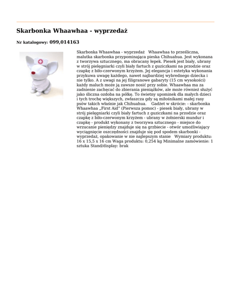 Skarbonka Whaawhaa - wyprzedaż Nr katalogowy: 099,014163 Skarbonka Whaawhaa - wyprzedaż Whaawhaa to prześliczna, malutka skarbonka przypominająca pieska Chihuahua. Jest wykonana z tworzywa sztucznego, ma obracany łepek. Piesek jest biały, ubrany w strój pielęgniarki czyli biały fartuch z guziczkami na przodzie oraz czapkę z biło-czerwonym krzyżem. Jej elegancja i estetyka wykonania przykuwa uwagę każdego, nawet najbardziej wybrednego dziecka i nie tylko. A z uwagi na jej filigranowe gabaryty (15 cm wysokości) każdy maluch może ją zawsze nosić przy sobie. Whaawhaa ma za zadnienie zachęcać do zbierania pieniążków, ale może również służyć jako śliczna ozdoba na półkę. To świetny upominek dla małych dzieci i tych trochę większych, zwłaszcza gdy są miłośnikami małej rasy psów takich właśnie jak Chihuahua. Gadżet w skrócie: - skarbonka Whaawhaa „First Aid” (Pierwsza pomoc) - piesek biały, ubrany w strój pielęgniarki czyli biały fartuch z guziczkami na przodzie oraz czapkę z biło-czerwonym krzyżem - ubrany w żołnierski mundur i czapkę - produkt wykonany z tworzywa sztucznego - miejsce do wrzucanie pieniędzy znajduje się na grzbiecie - otwór umożliwiający wyciągnięcie oszczędności znajduje się pod spodem skarbonki wyprzedaż, opakowanie w nie najlepszym stanie Wymiary produktu: 16 x 15,5 x 16 cm Waga produktu: 0,254 kg Minimalne zamówienie: 1 sztuka Stand/display: brak
