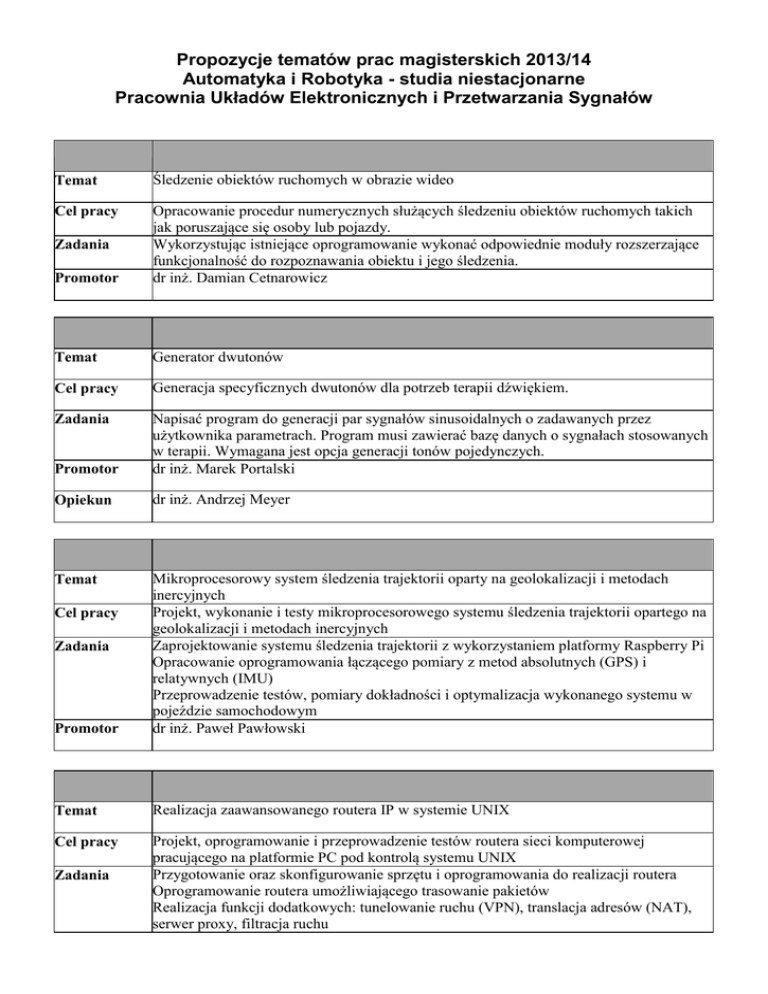 Propozycje tematów prac magisterskich 2013/14 Automatyka i Robotyka - studia niestacjonarne Pracownia Układów Elektronicznych i Przetwarzania Sygnałów Temat Śledzenie obiektów ruchomych w obrazie wideo Cel pracy Promotor Opracowanie procedur numerycznych służących śledzeniu obiektów ruchomych takich jak poruszające się osoby lub pojazdy. Wykorzystując istniejące oprogramowanie wykonać odpowiednie moduły rozszerzające funkcjonalność do rozpoznawania obiektu i jego śledzenia. dr inż. Damian Cetnarowicz Temat Generator dwutonów Cel pracy Generacja specyficznych dwutonów dla potrzeb terapii dźwiękiem. Zadania Promotor Napisać program do generacji par sygnałów sinusoidalnych o zadawanych przez użytkownika parametrach. Program musi zawierać bazę danych o sygnałach stosowanych w terapii. Wymagana jest opcja generacji tonów pojedynczych. dr inż. Marek Portalski Opiekun dr inż. Andrzej Meyer Temat Promotor Mikroprocesorowy system śledzenia trajektorii oparty na geolokalizacji i metodach inercyjnych Projekt, wykonanie i testy mikroprocesorowego systemu śledzenia trajektorii opartego na geolokalizacji i metodach inercyjnych Zaprojektowanie systemu śledzenia trajektorii z wykorzystaniem platformy Raspberry Pi Opracowanie oprogramowania łączącego pomiary z metod absolutnych (GPS) i relatywnych (IMU) Przeprowadzenie testów, pomiary dokładności i optymalizacja wykonanego systemu w pojeździe samochodowym dr inż. Paweł Pawłowski Temat Realizacja zaawansowanego routera IP w systemie UNIX Cel pracy Projekt, oprogramowanie i przeprowadzenie testów routera sieci komputerowej pracującego na platformie PC pod kontrolą systemu UNIX Przygotowanie oraz skonfigurowanie sprzętu i oprogramowania do realizacji routera Oprogramowanie routera umożliwiającego trasowanie pakietów Realizacja funkcji dodatkowych: tunelowanie ruchu (VPN), translacja adresów (NAT), serwer proxy, filtracja ruchu Zadania Cel pracy Zadania Zadania Promotor Przeprowadzenie testów, pomiary wydajności Opracowanie dokumentacji projektowej i ćwiczenia laboratoryjnego dr inż. Paweł Pawłowski