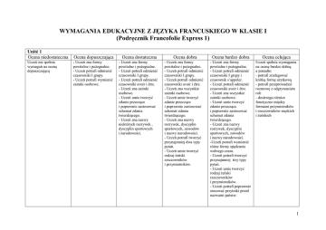 WYMAGANIA EDUKACYJNE Z J ZYKA FRANCUSKIEGO W KLASIE I (Podr cznik Francofolie Express 1) Unité 1 Ocena niedostateczna Ucze nie spełnia wymaga na ocen dopuszczaj c Ocena dopuszczaj ca - Ucze zna formy powitalne i po egnalne. - Ucze potrafi odmienić czasowniki I grupy. - Ucze potrafi wymienić zaimki osobowe. Ocena dostateczna - Ucze zna formy powitalne i po egnalne. - Ucze potrafi odmienić czasowniki I grupy. - Ucze potrafi odmienić czasowniki avoir i être. - Ucze zna zaimki osobowe. - Ucze umie tworzyć zdanie przecz ce i poprawnie zastosować schemat zdania twierdz cego. - Ucze zna nazwy niektórych rozrywek , dyscyplin sportowych i narodowo ci. Ocena dobra - Ucze zna formy powitalne i po egnalne. - Ucze potrafi odmienić czasowniki I grupy. - Ucze potrafi odmienić czasowniki avoir i être. - Ucze zna wszystkie zaimki osobowe. - Ucze umie tworzyć zdanie przecz ce i poprawnie zastosować schemat zdania twierdz cego. - Ucze zna nazwy rozrywek, dyscyplin sportowych, zawodów i nazwy narodowo ci. - Ucze potrafi tworzyć przynajmniej dwa typy pyta . - Ucze umie tworzyć rodzaj e ski rzeczowników i przymiotników. Ocena bardzo dobra - Ucze zna formy powitalne i po egnalne. - Ucze potrafi odmienić czasowniki I grupy i czasownik s’appeler. - Ucze potrafi odmienić czasowniki avoir i être. - Ucze zna wszystkie zaimki osobowe. - Ucze umie tworzyć zdanie przecz ce i poprawnie zastosować schemat zdania twierdz cego. - Ucze zna nazwy rozrywek, dyscyplin sportowych, zawodów i nazwy narodowo ci. -Ucze potrafi wymienić ró ne formy sp dzania wolnego czasu. - Ucze potrafi tworzyć przynajmniej trzy typy pyta . - Ucze umie tworzyć rodzaj e ski rzeczowników i przymiotników. - Ucze potrafi poprawnie stosować przyimki przed nazwami pa stw. Ocena celuj ca Ucze spełnia wymagania na ocen bardzo dobr , a ponadto: - potrafi zredagować krótk form u ytkow - potrafi przeprowadzić rozmow z odgrywaniem roli - dostrzega ró nice fonetyczne mi dzy formami przymiotników i rzeczowników m skich i e skich 1 Unité 2 Ocena niedostateczna Ucze nie spełnia wymaga na ocen dopuszczaj c Ocena dopuszczaj ca - Ucze zna rodzajniki okre lone i nieokre lone. - Ucze zna alfabet. - Ucze potrafi przedstawić si i zadawać pytania. - Ucze umie liczyć do 100. Ocena dostateczna - Ucze zna rodzajniki okre lone i nieokre lone. - Ucze zna alfabet. - Ucze zna formy ci gni te rodzajników. - Ucze potrafi przedstawić si i zadawać pytania. - Ucze zna nazwy dni tygodnia i miesi cy roku. - Ucze zna funkcje przyimków de i à. - Ucze umie liczyć do 100. Ocena dobra - Ucze zna rodzajniki okre lone i nieokre lone. - Ucze zna alfabet, umie literować wyrazy. - Ucze zna formy ci gni te rodzajników. - Ucze potrafi przedstawić si i zadawać pytania. - Ucze zna nazwy dni tygodnia, miesi cy o pór roku. - Ucze zna funkcje przyimków de i à. - Ucze zna wyra enie est-ce que. - Ucze umie liczyć do 100. - Ucze zna nazwy niektórych sprz tów w mieszkaniu i sali lekcyjnej. Ocena bardzo dobra - Ucze zna rodzajniki okre lone i nieokre lone. - Ucze zna alfabet, umie literować wyrazy. - Ucze zna formy ci gni te rodzajników. - Ucze potrafi przedstawić si i zadawać pytania. - Ucze zna nazwy dni tygodnia, miesi cy o pór roku. - Ucze zna funkcje przyimków de i à. - Ucze zna wyra enie est-ce que. - Ucze potrafi tworzyć liczb mnog rzeczowników i przymiotników. - Ucze umie liczyć do 100. - Ucze zna nazwy sprz tów znajduj cych si w domu, mieszkaniu i sali lekcyjnej. - Ucze umie podawać swoje dane osobowe i uzyskiwać informacje na temat danych rozmówcy. - Ucze umie okre lać dat . Ocena celuj ca Ucze spełnia wymagania na ocen bardzo dobr , a ponadto: - zna zasady savoirvivre’u - posiada wiedz na temat szkolnictwa ponadgimnazjalnego we Francji oraz zainteresowa francuskich nastolatków - potrafi zredagować krótk form u ytkow - dostrzega ró nice fonetyczne mi dzy formami liczby pojedynczej i mnogiej niektórych przymiotników i rzeczowników 2 Unité 3 Ocena niedostateczna Ucze nie spełnia wymaga na ocen dopuszczaj c Ocena dopuszczaj ca - Ucze zna niektóre zaimki przymiotne dzier awcze i czasowniki nieregularne. - Ucze zna niektóre czasowniki zwrotne. - Ucze zna niektóre słowa słu ce do opisu wygl du i cech charakteru. - Ucze zna nazwy członków rodziny. Ocena dostateczna - Ucze zna niektóre zaimki przymiotne dzier awcze. - Ucze zna niektóre czasowniki nieregularne. - Ucze zna tryb rozkazuj cy. - Ucze zna czas futur proche. - Ucze zna niektóre czasowniki zwrotne. - Ucze zna niektóre słowa słu ce do opisu wygl du i cech charakteru. - Ucze umie okre lać godziny. - Ucze zna nazwy członków rodziny. Ocena dobra - Ucze zna zaimki przymiotne dzier awcze. - Ucze umie odmienić niektóre czasowniki nieregularne. - Ucze zna przyimki de, en, avec, chez. - Ucze zna tryb rozkazuj cy. - Ucze zna czas futur proche. - Ucze zna niektóre czasowniki zwrotne. - Ucze zna słownictwo słu ce do opisu wygl du i cech charakteru. - Ucze umie okre lać godziny. - Ucze zna nazwy członków rodziny. - Ucze potrafi opowiadać o codziennych czynno ciach. Ocena bardzo dobra - Ucze zna zaimki przymiotne dzier awcze. - Ucze umie odmienić niektóre czasowniki nieregularne w czasie tera niejszym. - Ucze zna zasady u ycia przyimków de, en, avec, chez. - Ucze zna tryb rozkazuj cy. - Ucze potrafi stosować wyra enie Il faut. - Ucze zna czas futur proche. - Ucze zna czasowniki zwrotne. - Ucze zna słownictwo słu ce do opisu wygl du i cech charakteru. - Ucze umie okre lać godziny. - Ucze zna nazwy członków rodziny. - Ucze potrafi opowiadać o codziennych czynno ciach. Ocena celuj ca Ucze spełnia wymagania na ocen bardzo dobr , a ponadto: - potrafi zredagować krótk form u ytkow - zna ró ne modele francuskiej rodziny - zna najwa niejsze wi ta pa stwowe i religijne we Francji - zna zasady ł czenia mi dzywyrazowego (liaison) 3 Unité 4 Ocena niedostateczna Ucze nie spełnia wymaga na ocen dopuszczaj c Ocena dopuszczaj ca - Ucze zna niek
