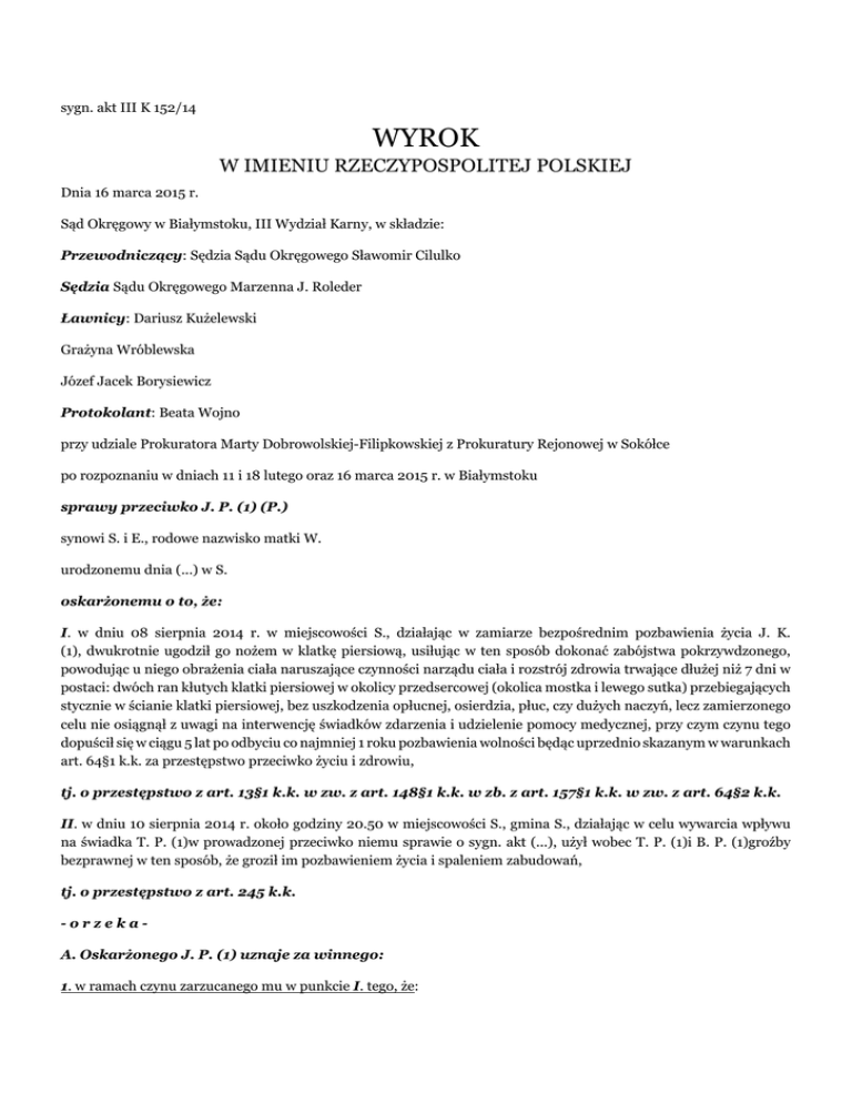 sygn. akt III K 152/14 WYROK W IMIENIU RZECZYPOSPOLITEJ POLSKIEJ Dnia 16 marca 2015 r. Sąd Okręgowy w Białymstoku, III Wydział Karny, w składzie: Przewodniczący: Sędzia Sądu Okręgowego Sławomir Cilulko Sędzia Sądu Okręgowego Marzenna J. Roleder Ławnicy: Dariusz Kużelewski Grażyna Wróblewska Józef Jacek Borysiewicz Protokolant: Beata Wojno przy udziale Prokuratora Marty Dobrowolskiej-Filipkowskiej z Prokuratury Rejonowej w Sokółce po rozpoznaniu w dniach 11 i 18 lutego oraz 16 marca 2015 r. w Białymstoku sprawy przeciwko J. P. (1) (P.) synowi S. i E., rodowe nazwisko matki W. urodzonemu dnia (...) w S. oskarżonemu o to, że: I. w dniu 08 sierpnia 2014 r. w miejscowości S., działając w zamiarze bezpośrednim pozbawienia życia J. K. (1), dwukrotnie ugodził go nożem w klatkę piersiową, usiłując w ten sposób dokonać zabójstwa pokrzywdzonego, powodując u niego obrażenia ciała naruszające czynności narządu ciała i rozstrój zdrowia trwające dłużej niż 7 dni w postaci: dwóch ran kłutych klatki piersiowej w okolicy przedsercowej (okolica mostka i lewego sutka) przebiegających stycznie w ścianie klatki piersiowej, bez uszkodzenia opłucnej, osierdzia, płuc, czy dużych naczyń, lecz zamierzonego celu nie osiągnął z uwagi na interwencję świadków zdarzenia i udzielenie pomocy medycznej, przy czym czynu tego dopuścił się w ciągu 5 lat po odbyciu co najmniej 1 roku pozbawienia wolności będąc uprzednio skazanym w warunkach art. 64§1 k.k. za przestępstwo przeciwko życiu i zdrowiu, tj. o przestępstwo z art. 13§1 k.k. w zw. z art. 148§1 k.k. w zb. z art. 157§1 k.k. w zw. z art. 64§2 k.k. II. w dniu 10 sierpnia 2014 r. około godziny 20.50 w miejscowości S., gmina S., działając w celu wywarcia wpływu na świadka T. P. (1)w prowadzonej przeciwko niemu sprawie o sygn. akt (...), użył wobec T. P. (1)i B. P. (1)groźby bezprawnej w ten sposób, że groził im pozbawieniem życia i spaleniem zabudowań, tj. o przestępstwo z art. 245 k.k. -orzekaA. Oskarżonego J. P. (1) uznaje za winnego: 1. w ramach czynu zarzucanego mu w punkcie I. tego, że: ósmego sierpnia 2014 r. w miejscowości S., w części mieszkalnej budynku znajdującego się na posesji oznaczonej numerem (...), działając z zamiarem bezpośrednim pozbawienia życia J. K. (1), usiłował dokonać jego zabójstwa w ten sposób, że dwukrotnie ugodził go nożem w klatkę piersiową, czym spowodował u niego obrażenia naruszające czynności narządu ciała i rozstrój zdrowia trwające dłużej niż 7 dni w postaci: dwóch ran kłutych klatki piersiowej w okolicy przedsercowej (tj. mostka i lewego sutka) przebiegających stycznie w ścianie klatki piersiowej, bez uszkodzenia opłucnej, osierdzia, płuc, czy dużych naczyń, jednak zamierzonego celu nie osiągnął z uwagi na interwencję świadka i udzieloną pokrzywdzonemu pomoc medyczną, przy czym czynu tego dopuścił się w ciągu 5 lat po odbyciu co najmniej roku kary pozbawienia wolności, będąc uprzednio skazanym w warunkach art. 64§1 k.k. za przestępstwo przeciwko życiu i zdrowiu; tj. czynu z art. 13§1 k.k. w zw. z art. 148§1 k.k. w zb. z art. 157§1 k.k. w zw. z art. 64§2 k.k. i za czyn ten na podstawie art. 13§1 k.k. w zw. z art. 148§1 k.k. w zb. z art. 157§1 k.k. w zw. z art. 64§2 k.k. w zw. z art. 11§2 k.k. skazuje go, zaś na podstawie art. 14§1 k.k. w zw. z art. 148§1 k.k. w zw. z art. 64§2 k.k. w zw. z art. 11§3 k.k. wymierza mu karę 9 (dziewięciu) lat pozbawienia wolności. 2. w ramach czynu zarzucanego mu w punkcie II. tego, że: dziesiątego sierpnia 2014 r. w miejscowości S. groził T. P. (1) i B. P. (1) pozbawieniem życia i spaleniem zabudowań, a groźby te wzbudziły w pokrzywdzonych uzasadnioną obawę, że zostaną spełnione, przy czym czynu tego dopuścił się w ciągu 5 lat po odbyciu co najmniej 6 miesięcy kary pozbawienia wolności orzeczonej za umyślne przestępstwo podobne; tj. czynu z art. 190§1 k.k. w zw. z art. 64§1 k.k. i za czyn ten na podstawie art. 190§1 k.k. w zw. z art. 64§1 k.k. skazuje go na karę 4 (czterech) miesięcy pozbawienia wolności. B. Na podstawie art. 85 k.k., art. 86§1 k.k. orzeka wobec oskarżonego J. P. (1) karę łączną 9 (dziewięciu) lat pozbawienia wolności. C. Na podstawie art. 63§1 k.k. na poczet orzeczonej kary łącznej pozbawienia wolności zalicza dwa dni zatrzymania oskarżonego, tj. od 8 do 9 sierpnia 2014 r. oraz okres jego tymczasowego aresztowania od dnia 12 sierpnia 2014 r. do dnia 16 marca 2015 r. D. Zwalnia oskarżonego od ponoszenia kosztów sądowych i obciąża nimi Skarb Państwa. …………………………………. …………………………… ……....…………………………… Sędzia Marzenna J. Roleder Sędzia Sławomir Cilulko Ławnik Dariusz Kużelewski ……………………………………. ……………………………………. Ławnik Józef J. Borysiewicz Ławnik Grażyna Wróblewska sygn. akt III K 152/14 UZASADNIENIE zawiera wskazanie , jakie fakty sąd uznał za udowodnione ( A .), na jakich w tej mierze oparł się dowodach i dlaczego nie uznał dowodów przeciwnych ( B .), wyjaśnienie podstawy prawnej wyroku ( C .) oraz okoliczności , które miał na względzie przy wymiarze kary oraz przy innych rozstrzygnięciach zawartych w wyroku ( D .) – art. 424§1 i 2 k.p.k. Część A. Ósmego sierpnia 2014 r., około południa, do mieszkania wynajmowanego przez pięćdziesięciopięcioletniego J. K. (1) w miejscowości S. 3a przyszedł znajomy gospodarza – dziewiętnastoletni T. P. (1). Mężczyźni zaczęli pić przyniesione przez tego drugiego wino. Po pewnym czasie do spożywających alkohol dołączyli jeszcze: siostra J. K. (1), J. B. (2) i jej konkubent J. P. (1). W pewnym momencie J. P. (1) wyszedł się na zewnątrz, aby załatwić potrzebę fizjologiczną. Gry wrócił, zgromadzone w pomieszczeniu osoby zauważyły, że trzyma w rękach dwa noże kuchenne. Mę