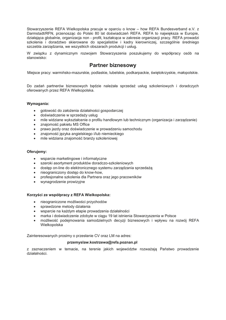 Stowarzyszenie REFA Wielkopolska pracuje w oparciu o know – how REFA Bundesverband e.V. z Darmstadt/RFN, przenosząc do Polski 80 lat doświadczeń REFA. REFA to największa w Europie, działająca globalnie, organizacja non - profit, kształcąca w zakresie organizacji pracy. REFA prowadzi szkolenia i doradztwo skierowane do specjalistów i kadry kierowniczej, szczególnie średniego szczebla zarządzania, we wszystkich obszarach produkcji i usług. W związku z dynamicznym rozwojem Stowarzyszenia poszukujemy do współpracy osób na stanowisko: Partner biznesowy Miejsce pracy: warmińsko-mazurskie, podlaskie, lubelskie, podkarpackie, świętokrzyskie, małopolskie. Do zadań partnerów biznesowych będzie należała sprzedaż usług szkoleniowych i doradczych oferowanych przez REFA Wielkopolska. Wymagania: gotowość do założenia działalności gospodarczej doświadczenie w sprzedaży usług mile widziane wykształcenie o profilu handlowym lub technicznym (organizacja i zarządzanie) znajomość pakietu MS Office prawo jazdy oraz doświadczenie w prowadzeniu samochodu znajomość języka angielskiego i/lub niemieckiego mile widziana znajomość branży szkoleniowej Oferujemy: wsparcie marketingowe i informatyczne szeroki asortyment produktów doradczo-szkoleniowych dostęp on-line do elektronicznego systemu zarządzania sprzedażą nieograniczony dostęp do know-how, profesjonalne szkolenia dla Partnera oraz jego pracowników wynagrodzenie prowizyjne Korzyści ze współpracy z REFA Wielkopolska: nieograniczone możliwości przychodów sprawdzone metody działania wsparcie na każdym etapie prowadzenia działalności marka i doświadczenie zdobyte w ciągu 19 lat istnienia Stowarzyszenia w Polsce możliwość podejmowania samodzielnych decyzji biznesowych i wpływu na rozwój REFA Wielkopolska Zainteresowanych prosimy o przesłanie CV oraz LM na adres: [email protected] z zaznaczeniem w temacie, na terenie jakich województw rozważają Państwo prowadzenie działalności.