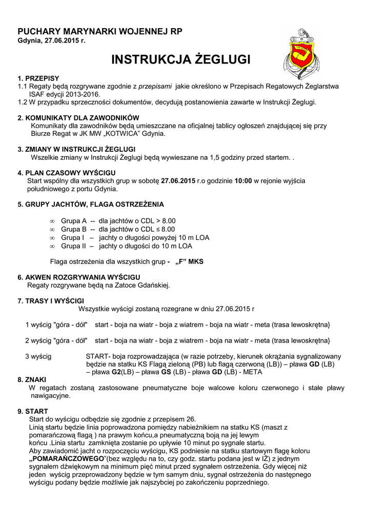 Instrukcja Żeglugi Regaty Puchar MW 2015