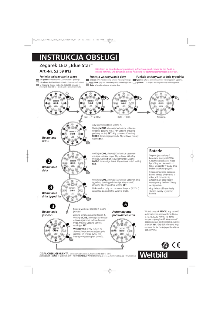 BA_0212_5259812_LED_Uhr_BlueStar_P 06.10.2011 17:21 Uhr Seite 1 INSTRUKCJA OBSŁUGI Zegarek LED „Blue Star” Bitte lesen sie diese Bedienungsanleitung aufmerksam durch, bevor Sie das Gerät in Betrieb nehmen, und bewahren Sie die Anleitung für späteres Nachschlagen sicher auf. Art.-Nr. 52 59 812 Funkcja wskazywania czasu x 1 godzina (każda dioda LED oznacza 1 godzinę). x 5 minut (każda niebieska dioda LED oznacza 5 minut) x 1 minuta (każda niebieska dioda LED oznacza 1 minutę) 5 diod LED + 1 dioda LED = aktualna minuta Funkcja wskazywania daty Miesiąc: cyfra na czerwonej lampce wskazuje miesiąc + data: cyfry na niebieskiej lampce wskazują dzień Data: ta lampka pokazuje aktualną datę Czas – 11:23 PM Funkcja wskazywania dnia tygodnia Tydzień: cyfry na czerwonej lampce wskazują dzień tygodnia. Tydzień : Ta lampka wskazuje aktualny dzień tygodnia. Data – 19.08. Niedziela Aby ustawić godzinę, wciśnij A. Ustawiane czasu Wciśnij MODE, aby wejść w funkcję ustawień godziny, godzina miga. Aby ustawić aktualną godzinę, wciśnij SET. Aby potwierdzić wciśnij MODE, teraz migają minuty. Aby ustawić minuty wciśnij SET. Wciśnij MODE, aby wejść w funkcję ustawień miesiąca, miesiąc miga. Aby ustawić aktualny miesiąc, wciśnij SET. Aby potwierdzić wciśnij MODE, teraz miga dzień. Aby ustawić dzień wciśnij SET. Ustawianie daty Wciśnij MODE, aby wejść w funkcję ustawień dnia tygodnia, dzień tygodnia miga. Aby ustawić aktualny dzień tygodnia, wciśnij SET. Ustawianie dnia tygodnia Ustawianie jasności Wskazówka: cyfry na czerwonej lampce (1,2,3...) oznaczają poniedziałek, wtorek, środa.. Możesz wybierać spośród 4 stopni jasności. Zielona lampka oznacza stopień 1. Wciśnij MODE, aby wejść w funkcję ustawień jasności, zielona lampka miga. Możesz ustawić jasność, wciskając SET. Automatyczne podświetlenie tła Wskazówka: Cyfry 1,2,3,4 na zielonej lampce oznaczają stopnie jasności. Im wyższa cyfra, tym intensywniejszy stopień jasności. DZIAŁ OBSŁUGI KLIENTA E-mail: [email protected], Telefon: (+48) 22 517 50 17 poniedziałek - piątek w godzinach 8:00 – 18:00 Weltbild.pl Weltbild Polska Sp. z o. o., ul. Hankiewicza 2, 02-103 Warszawa Baterie Zegarek jest zasilany 2 bateriami litowymi R2016. Czas trwałości baterii może być różny, w zależności od tego, jak często w ciągu dnia będzie wciskany przycisk. Czas poprawnego działania baterii wynosi średnio ok. 1 roku, jeśli przyjmie się założenie, że czas będzie wskazywany średnio 15 razy w ciągu dnia. Gdy światło LED stanie się słabsze, należy wymienić baterie. Wciśnij przycisk MODE, aby ustawić automatyczne podświetlenie tła na 5,10,15,20,30 minut. Na żółtej lampce miga cyfra 60. Aby ustawić pożądany czas podświetlenia, wciśnij przycisk SET. Gdy żółta lampka miga oznacza to, że funkcja podświetlenia jest aktywna.