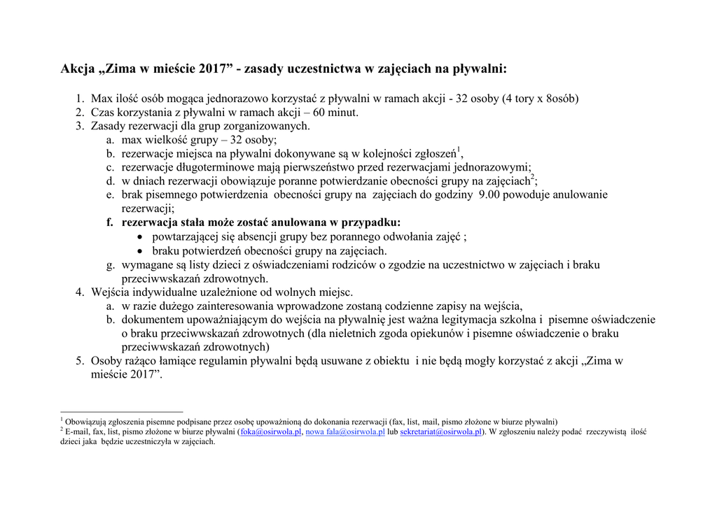 Akcja „Zima w mieście 2017” - zasady uczestnictwa w zajęciach na pływalni: 1. Max ilość osób mogąca jednorazowo korzystać z pływalni w ramach akcji - 32 osoby (4 tory x 8osób) 2. Czas korzystania z pływalni w ramach akcji – 60 minut. 3. Zasady rezerwacji dla grup zorganizowanych. a. max wielkość grupy – 32 osoby; b. rezerwacje miejsca na pływalni dokonywane są w kolejności zgłoszeń1, c. rezerwacje długoterminowe mają pierwszeństwo przed rezerwacjami jednorazowymi; d. w dniach rezerwacji obowiązuje poranne potwierdzanie obecności grupy na zajęciach2; e. brak pisemnego potwierdzenia obecności grupy na zajęciach do godziny 9.00 powoduje anulowanie rezerwacji; f. rezerwacja stała może zostać anulowana w przypadku: powtarzającej się absencji grupy bez porannego odwołania zajęć ; braku potwierdzeń obecności grupy na zajęciach. g. wymagane są listy dzieci z oświadczeniami rodziców o zgodzie na uczestnictwo w zajęciach i braku przeciwwskazań zdrowotnych. 4. Wejścia indywidualne uzależnione od wolnych miejsc. a. w razie dużego zainteresowania wprowadzone zostaną codzienne zapisy na wejścia, b. dokumentem upoważniającym do wejścia na pływalnię jest ważna legitymacja szkolna i pisemne oświadczenie o braku przeciwwskazań zdrowotnych (dla nieletnich zgoda opiekunów i pisemne oświadczenie o braku przeciwwskazań zdrowotnych) 5. Osoby rażąco łamiące regulamin pływalni będą usuwane z obiektu i nie będą mogły korzystać z akcji „Zima w mieście 2017”. 1 Obowiązują zgłoszenia pisemne podpisane przez osobę upoważnioną do dokonania rezerwacji (fax, list, mail, pismo złożone w biurze pływalni) E-mail, fax, list, pismo złożone w biurze pływalni ([email protected], nowa [email protected] lub [email protected]). W zgłoszeniu należy podać rzeczywistą ilość dzieci jaka będzie uczestniczyła w zajęciach. 2