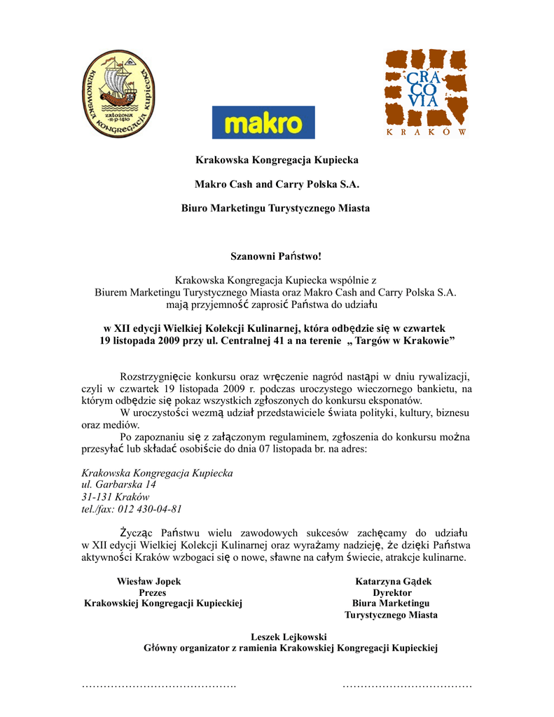 Krakowska Kongregacja Kupiecka Makro Cash and Carry Polska S.A. Biuro Marketingu Turystycznego Miasta Szanowni Państwo! Krakowska Kongregacja Kupiecka wspólnie z Biurem Marketingu Turystycznego Miasta oraz Makro Cash and Carry Polska S.A. mają przyjemność zaprosić Państwa do udziału w XII edycji Wielkiej Kolekcji Kulinarnej, która odbędzie się w czwartek 19 listopada 2009 przy ul. Centralnej 41 a na terenie „ Targów w Krakowie” Rozstrzygnięcie konkursu oraz wręczenie nagród nastąpi w dniu rywalizacji, czyli w czwartek 19 listopada 2009 r. podczas uroczystego wieczornego bankietu, na którym odbędzie się pokaz wszystkich zgłoszonych do konkursu eksponatów. W uroczystości wezmą udział przedstawiciele świata polityki, kultury, biznesu oraz mediów. Po zapoznaniu si ę z załączonym regulaminem, zgłoszenia do konkursu można przesyłać lub składać osobiście do dnia 07 listopada br. na adres: Krakowska Kongregacja Kupiecka ul. Garbarska 14 31-131 Kraków tel./fax: 012 430-04-81 Życząc Państwu wielu zawodowych sukcesów zachęcamy do udziału w XII edycji Wielkiej Kolekcji Kulinarnej oraz wyrażamy nadzieję, że dzięki Państwa aktywności Kraków wzbogaci się o nowe, sławne na całym świecie, atrakcje kulinarne. Wies ław Jopek Prezes Krakowskiej Kongregacji Kupieckiej Katarzyna Gądek Dyrektor Biura Marketingu Turystycznego Miasta Leszek Lejkowski Główny organizator z ramienia Krakowskiej Kongregacji Kupieckiej ……………………………………. ……………………………… (pieczęć zakładu, adres i nr telefonu) (miejscowość i data) IMIENNE ZGŁOSZENIE* DO XII EDYCJI WIELKIEJ KOLEKCJI KULINARNEJ W Wielkiej Kolekcji Kulinarnej weźmie udział p. …………………………………………………………….. stopień zawodowy ……………………………………………. Zobowiązujemy się pokryć koszty uczestnictwa w pokazie, zgodnie z regulaminem konkursu. ……………………………………………… (czytelny podpis właściciela) Wypełnia uczestnik pokazu* ……………………………………………….. (imię i nazwisko) Zgłaszam do pokazu następujące prace (eksponaty): Lp. Nazwa Eksponatu Krótka charakterystyka Jednocześnie zaświadczam, że: 1. zapoznałem się z postanowieniami regulaminu pokazu; 2. zgłoszony eksponat będzie moją oryginalną, własnoręcznie wykonaną pracą; 3. eksponat dostarczę do Targów w Krakowie ul. Centralna 41 a 4. wyrażam zgodę na przekazanie organizatorom receptur zgłoszonych produktów i na ich publikację we wszelkich materiałach promujących XII edycję Wielkiej Kolekcji Kulinarnej. *wypełnić drukowanymi literami ……………………………………… (podpis uczestnika) Regulamin „WIELKIEJ KOLEKCJI KULINARNEJ” Krakowskiej Kongregacji Kupieckiej 1. ORGANIZATORZY POKAZU Organizatorem pokazu jest Krakowska Kongregacja Kupiecka. 2. CEL POKAZU Celem pokazu jest: 2.1. Zainteresowanie kucharzy, cukierników, kelnerów doskonaleniem swoich umiejętności, rozbudzenie pomysłowości i inicjatywy, udokumentowanie ich talentów i możliwości pod względem: - w produkcji kuchennej – nowatorstwa, technologii produkcji potraw smacznych i estetycznie wydanych; - w produkcji cukierniczej – nowatorstwa, zaproponowania asortymentu wyrobów ciastkarskich o wysokich wartościach smakowych i dekoracyjnych, z uwzględnieniem możliwości produkcyjnych własnej pracowni cukierniczej; 2.2. Wzbogacenie kart menu, zarówno w pozycjach produkcji kuchennej jak i cukierniczej o pozycje nowe, które wejdą – w wyniku pokazu – na stałe do oferty handlowej restauracji uczestniczących w pokazie. 2.3. Prezentacja stołów z eksponatami kulinarnymi; 2.4. Każdorazowo Wielka Kolekcja Kulinarna będzie posiadała temat wiodący określony w załączniku. 3. TERMIN I MIEJSCE POKAZU 3.1. Termin i miejsce Wielkiej Kolekcji Kulinarnej będzie podawany przez organizatorów każdorazowo poprzez ogłoszenie załącznika do niniejszego regulaminu. CZĘŚĆ KONKURSOWA 4. WARUNKI UCZESTNICTWA W POKAZIE 4.1. W pokazie uczestniczą dobrowolnie zakł ady i szkoły gastronomiczne zgłaszając swoje uczestnictwo. 4.2. Warunki pokazu nie eliminują udziału w nim firm, które zdobyły w poprzednich latach medale, dyplomy i wyróż nienia w konkursach krajowych i zagranicznych. 4.3. Potwierdzenie zgłoszenia do pokazu powinno być dokonane w Krakowskiej Kongregacji Kupieckiej – Kraków ul. Garbarska 14, na formularzu zgłoszeniowym, w terminie 30 dni przed terminem Wielkiej Kolekcji Kulinarnej. 4.4. Każdy eksponat kulinarny wykonany przez uczestnika pokazu, uważ any będzie jako oryginalna, własnoręcznie wykonana praca, opracowana specjalnie na pokaz w zakładzie. 4.5. Wszystkie eksponaty musza składać się wyłącznie z jadalnych produktów. 4.6. Koszty surowców potrzebnych do wykonania eksponatów na pokaz pokrywają firmy zgłaszają ce swoich pracowników. 4.7. Sprzęt wystawienniczy zabezpiecza uczestniczący w pokazie. 4.8. Uczestnik powinien posiadać przy sobie w czasie trwania pokazu aktualna książeczkę zdrowia oraz narzędzia pracy. 5. ZASADY PRZEPROWADZENIA POKAZU Ekspozycji nie ograniczają ścis łe bariery regulaminowe w celu wykazania pełnej inwencji osób uczestniczących w Wielkiej Kolekcji Kulinarnej. 5.1. Za całokształt pokazu odpowiedzialny jest Komitet Organizacyjny Pokazu powołany przez Organizatorów Pokazu. 5.2. Ocenie podlegać będzie: a) produkty związane z tematem Wielkiej Kolekcji Kulinarnej w trzech kategoriach b) wygląd ekspozycji. 5.3. Ocena eksponatów oraz stołów będzie w gestii powołanej przez organizatorów komisji 5.4. Ocena ekspozycji przez publiczność. 5.5. Przy ocenie eksponatów będzie brana pod uwagę jakość produkcji, estetyka wydania i pomysłowość. 5.6. Wszyscy uczestnicy pokazu otrzymują dyplom uczestnictwa. 5.7. Wszystkie eksponaty zostaną wystawione przez uczestników pokazu w miejscu i godz