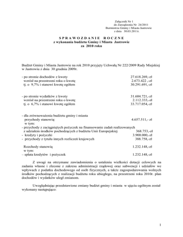 Załącznik Nr 1 do Zarządzenia Nr 24/2011 Burmistrza Gminy i Miasta Jastrowie z dnia 30.03.2011r. SPRAWOZDANIE ROCZNE z wykonania budŜetu Gminy i Miasta Jastrowie za 2010 roku BudŜet Gminy i Miasta Jastrowie na rok 2010 przyjęty Uchwałą Nr 222/2009 Rady Miejskiej w Jastrowiu z dnia 30 grudnia 2009r. - po stronie dochodów z kwoty wzrósł na przestrzeni roku o kwotę tj. o 9,7% i stanowi kwotę ogółem 27.618.269,-zł 2.673.422 ,-zł 30.291.691,-zł - po stronie wydatków z kwoty wzrósł na przestrzeni roku o kwotę tj. o 6,7% i stanowi kwotę ogółem 31.604.721,-zł 2.112.333,-zł 33.717.054,-zł - dla zrównowaŜenia budŜetu gminy i miasta 4.657.511,- zł przychody stanowią: w tym: - przychody z zaciągniętych poŜyczek na finansowanie zadań realizowanych z udziałem środków pochodzących z budŜetu Unii Europejskiej 368.753,-zł - kredyty i poŜyczki 3.900.000,-zł 388.758,-zł - przychody z tytułu innych rozliczeń krajowych Rozchody stanowią w tym: – spłata kredytów i poŜyczek 1.232.148,-zł 1.232.148,-zł Z uwagi na otrzymane zawiadomienia o ustaleniu wielkości dotacji celowych na zadania własne i zlecone z zakresu administracji rządowej oraz subwencji i udziałów we wpływach z podatku dochodowego od osób fizycznych, a takŜe zagospodarowania wolnych środków pochodzących z realizacji budŜetu roku ubiegłego, na przestrzeni roku 2010r. plan dochodów i wydatków uległ zmianom. Uwzględniając przedstawione zmiany budŜet gminy i miasta w ujęciu ogólnym został wykonany następująco: 1 ZESTAWIENIE ZMIAN BUDśETU GMINY ZA 2010 ROKU Lp. Wyszczególnienie 1 DOCHODY OGÓŁEM I 1. Dochody bieŜące BudŜet uchwalony na 01.01.2010 r. 2 Zmiany + zwiększenie - zmniejszenie 3 BudŜet po zmianach Wykonanie 31.12.2010 r. % /5:4/ Dochody/ wydatki na 1 mieszkańca 4 5 6 7 27.618.269 + 2.673.422 30.291.691 30.482.127 100,6 2.638,00 27.077.569 + 1.381.859 28.459.428 28.617.044 100,6 2.476,59 10.051.889 - 403.454 9.648.435 9.982.125 103,5 863,88 175.000 + 2.000 177.000 176.924 100,0 15,31 11.305.696 - 183.996 11.121.700 11.121.700 100,0 962,50 6.780.016 -183.996 6.596.020 6.596.020 100,0 570,84 565.621 -- 565.261 565.621 100,0 48,95 3.960.059 -- 3.960.059 3.960.059 100,0 342,71 5.063.872 + 420.135 5.484.007 5.472.899 99,8 w tym: a. b. c. dochody własne z tego: dochody z tyt. wydawania zezwoleń na sprzedaŜ napojów alkoholowych Subwencja ogólna w tym: część oświatowa subwencji ogólnej część równowaŜąca subwencji ogólnej część wyrównawcza subwencji ogólnej Dotacje celowe otrzymane z budŜetu państwa na finansowanie zadań z zakresu administracji rządowej – zadania zlecone 473,64 2 d. e. f. 2. Dotacje celowe otrzymane z budŜetu państwa na realizację własnych zadań bieŜących Dotacje celowe otrzymane z powiatu na zadania bieŜące realizowane na podstawie porozumień (umów) między jst Dotacje celowe w ramach programów finansowanych z udziałem środków europejskich oraz środków o których mowa w art.5 ust. 1 pkt 3 oraz ust. 3 pkt 5 i 6 ustawy, lub płatności w ramach budŜetu środków europejskich Dochody majątkowe 606.792 + 1.323.554 1.930.346 1.772.633 91,8 153,41 49.320 + 5.000 54.320 54.302 100,0 4,70 -- + 220.620 220.620 213.385 96,7 18,47 540.700 + 1.291.563 1.832.263 1.865.083 101,8 161,41 540.000 + 666.676 1.206.676 1.238.853 102,7 107,21 --- + 308.297 308.297 308.297 100,0 26,68 --- + 306.000 306.000 306.000 100,0 26,48 w tym: a. b. c. dochody ze sprzedaŜy majątku wpływy z tytułu pomocy finansowej udzielanej między jst na dofinansowanie własnych zadań inwestycyjnych i zakupów inwestycyjnych dotacje celowe otrzymane z budŜetu państwa na realizację inwestycji i zakupów inwest. własnych gmin Liczbę mieszkańców gminy i miasta Jastrowie przyjęto wg stanu na 30.09.2010r. (miasto 8.483 + gmina 3.072) = 11.555 osób (dane z Urzędu Statystycznego) 3 ZESTAWIENIE ZMIAN BUDśETU GMINY I MIASTA ZA 2010 ROKU II 1. a) b) Wyszczególnienie BudŜet uchwalony na 01.01.2010 r. Zmiany + zwiększenie - zmniejszenie BudŜet po zmianach Wykonanie 31.12.2010 r. % /5:4/ Dochody/ wydatki na 1 mieszkańca 1 2 3 4 5 6 7 31.604.721 + 2.112.333 33.717.054 31.737.132 94,1 2.746,61 27.683.631 + 2.412.695 30.096.326 28.731.686 95,5 2.486,52 WYDATKI BUDśETOWE OGÓŁEM wydatki bieŜące Wydatki jednostek budŜetowych w tym: - wynagrodzenia i składki od nich naliczane - wydatki związane z realizacją ich statutowych zadań 18.841.206 + 486.826 19.328.032 18.342.932 94,9 1.587,45 12.238.346 + 208.690 12.447.036 12.109.774 97,3 1.048,01 6.602.860 + 278.136 6.880.996 6.233.158 90,6 539,43 dotacje na zadania bieŜące 1.726.240 + 68.640 1.794.880 1.784.865 99,4 154,47 w tym: - dotacja przedmiotowa dla zakładu budŜetowego § 2650 320.420 -- 320.420 311.575 97,2 26,96 - dotacja podmiotowa z budŜetu dla niepublicznej jednostki systemu oświaty § 2540 420.000 + 17.000 437.000 436.539 99,9 37,78 4 - dotacje celowe przekazane gminie na zad. bieŜące realizowane na podstawie porozumień między jst - dotacja podmiotowa dla samorządowej instytucji kultury § 2480 - dotacja celowa na pomoc finansową udzielaną między jst na dofinansow. własnych zadań bieŜących § 2710 -dotacje celowe na dofinans prac remontowych i konserwator obiektów zabytkowych § 2720 -dotacja celowa z budŜetu na dofinans zadań zlecon do realizacji pozostałym jednostkom niezaliczanym do sektora finansów publicznych § 2830 - zwrot dotacji oraz płatności, w tym wykorzystywanych niezgodnie z przeznaczeniem lub wykorzystanych z naruszeniem procedur, o których mowa w art. 184 ustawy, pobranych nienaleŜnie lub w nadmiernej wysokości § 2910 -- --- --- --- --- --- 925.820 + 29.990 955.810 955.810 100,0 82,72 -- + 15.850 15.850 15.850 100,0 1,37 60.000 -- 60.000 60.000 100,0 5,19 -- + 5.000 5.000 5.000 100,0 0,43 -- + 800 800 91 11,4 0,01 5 c) d) e) f) g) 2. Świadczenia na rzecz osób fizycznych Wydatki na programy finansowane z udziałem środków, o których