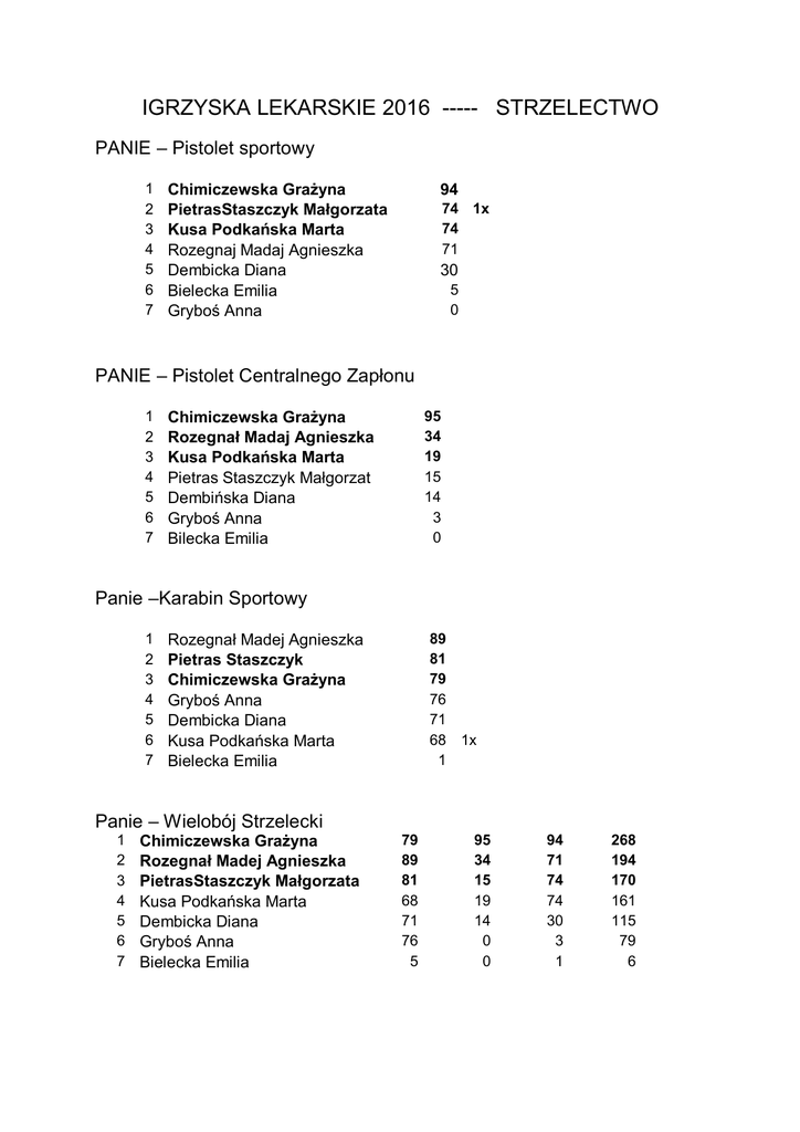 IGRZYSKA LEKARSKIE 2016 ----- STRZELECTWO PANIE – Pistolet sportowy 1 2 3 4 5 6 7 Chimiczewska Grażyna PietrasStaszczyk Małgorzata Kusa Podkańska Marta Rozegnaj Madaj Agnieszka Dembicka Diana Bielecka Emilia Gryboś Anna 94 74 1x 74 71 30 5 0 PANIE – Pistolet Centralnego Zapłonu 1 2 3 4 5 6 7 95 34 19 15 14 3 0 Chimiczewska Grażyna Rozegnał Madaj Agnieszka Kusa Podkańska Marta Pietras Staszczyk Małgorzat Dembińska Diana Gryboś Anna Bilecka Emilia Panie –Karabin Sportowy 1 2 3 4 5 6 7 89 81 79 76 71 68 1x 1 Rozegnał Madej Agnieszka Pietras Staszczyk Chimiczewska Grażyna Gryboś Anna Dembicka Diana Kusa Podkańska Marta Bielecka Emilia Panie – Wielobój Strzelecki 1 2 3 4 5 6 7 Chimiczewska Grażyna Rozegnał Madej Agnieszka PietrasStaszczyk Małgorzata Kusa Podkańska Marta Dembicka Diana Gryboś Anna Bielecka Emilia 79 89 81 68 71 76 5 95 34 15 19 14 0 0 94 71 74 74 30 3 1 268 194 170 161 115 79 6 Mężczyźni -- Pistolet Sportowy 1 2 3 4 5 6 7 8 9 10 11 Chimiczewski Przemysław Paściak Marek Pędich Paweł Kazimierz Klecz Borejsza Maciej Jasiński Miłosz Pędich Witold Machiński Marek Wojciechowski Przemysław Duda Maciej Rosak Przemysław 93 1x 91 1x 91 90 89 86 85 84 83 75 1x 56 Mężczyźni -- Pistolet Centralnego Zapłonu 1 2 3 4 5 6 7 8 9 10 11 Chimiczewski Przemysław Paściak Marek Borejsza Maciej Kazimierz Klecz Wojciechowski Przemysław Pędich Witold Jasiński Miłosz Pędich Paweł Duda Maciej Machiński Marek Rosak Przemysław 95 1x 93 1x 93 83 80 72 66 63 38 15 6 Mężczyźni -- Karabin Sportowy 1 2 3 4 5 6 7 8 9 10 11 Chimiczewski Przemysław Pedich Witold Wojciechowski Przemysław Paściak Marek Pedich Paweł Kazimierz Klecz Duda Maciej Machiński Marek Rosak Przemysław Jasiński Miłosz Borejsza Maciej 98 93 92 88 87 87 82 78 77 71 50 1x 1x 2x 1x Mężczyźni – Wielobój strzelecki 1 2 3 4 5 6 7 8 9 10 11 Chimiczewski Przemysław Paściak Marek Kazimierz Klecz Wojciechowski Przemysław Pędich Witold Pędich Paweł Borejsza Maciej Jasiński Miłosz Duda Maciej Machiński Marek Rosak Przemysław 93 91 90 83 85 85 89 86 75 84 56 95 93 83 80 72 63 93 66 38 15 6 98 88 87 92 93 87 50 71 82 78 77 286 272 260 255 250 241 232 223 195 177 139 2x 2x 1x 2x 1x Osoby Towarzyszące – Pistolet Sportowy 1 Siuchnicka Katarzyna 66 Osoby Towarzyszące – Pistolet Centralnego Zapłonu 1 Siuchnicka Katarzyna 73 Osoby Towarzyszące – Karabin Sportowy 1 Siuchnicka Katarzyna 2 Podkański Antoś 3 Podkańska Zuzanna 77 58 31 Osoby Towarzyszące – Wielobój Strzelecki 1 Siuchniewicz Katarzyna 73 66 77 216