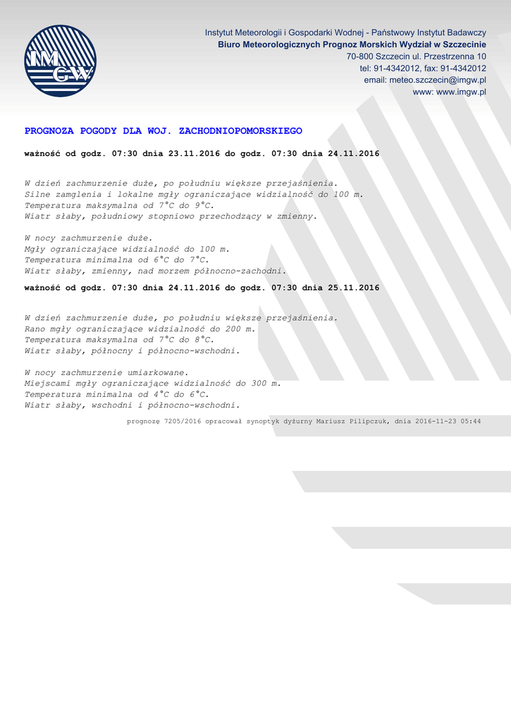 Instytut Meteorologii i Gospodarki Wodnej - Państwowy Instytut Badawczy Biuro Meteorologicznych Prognoz Morskich Wydział w Szczecinie 70-800 Szczecin ul. Przestrzenna 10 tel: 91-4342012, fax: 91-4342012 email: [email protected] www: www.imgw.pl PROGNOZA POGODY DLA WOJ. ZACHODNIOPOMORSKIEGO ważność od godz. 07:30 dnia 23.11.2016 do godz. 07:30 dnia 24.11.2016 W dzień zachmurzenie duże, po południu większe przejaśnienia. Silne zamglenia i lokalne mgły ograniczające widzialność do 100 m. Temperatura maksymalna od 7°C do 9°C. Wiatr słaby, południowy stopniowo przechodzący w zmienny. W nocy zachmurzenie duże. Mgły ograniczające widzialność do 100 m. Temperatura minimalna od 6°C do 7°C. Wiatr słaby, zmienny, nad morzem północno-zachodni. ważność od godz. 07:30 dnia 24.11.2016 do godz. 07:30 dnia 25.11.2016 W dzień zachmurzenie duże, po południu większe przejaśnienia. Rano mgły ograniczające widzialność do 200 m. Temperatura maksymalna od 7°C do 8°C. Wiatr słaby, północny i północno-wschodni. W nocy zachmurzenie umiarkowane. Miejscami mgły ograniczające widzialność do 300 m. Temperatura minimalna od 4°C do 6°C. Wiatr słaby, wschodni i północno-wschodni. prognozę 7205/2016 opracował synoptyk dyżurny Mariusz Pilipczuk, dnia 2016-11-23 05:44
