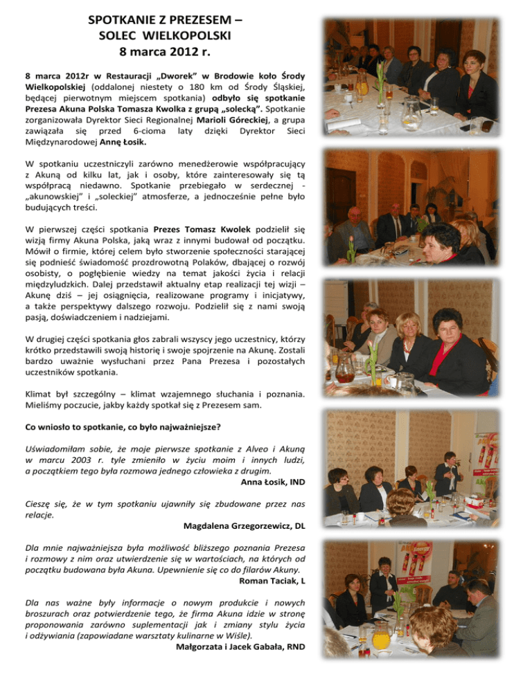 SPOTKANIE Z PREZESEM – SOLEC WIELKOPOLSKI 8 marca 2012 r. 8 marca 2012r w Restauracji „Dworek” w Brodowie koło Środy Wielkopolskiej (oddalonej niestety o 180 km od Środy Śląskiej, będącej pierwotnym miejscem spotkania) odbyło się spotkanie Prezesa Akuna Polska Tomasza Kwolka z grupą „solecką”. Spotkanie zorganizowała Dyrektor Sieci Regionalnej Marioli Góreckiej, a grupa zawiązała się przed 6-cioma laty dzięki Dyrektor Sieci Międzynarodowej Annę Łosik. W spotkaniu uczestniczyli zarówno menedżerowie współpracujący z Akuną od kilku lat, jak i osoby, które zainteresowały się tą współpracą niedawno. Spotkanie przebiegało w serdecznej „akunowskiej” i „soleckiej” atmosferze, a jednocześnie pełne było budujących treści. W pierwszej części spotkania Prezes Tomasz Kwolek podzielił się wizją firmy Akuna Polska, jaką wraz z innymi budował od początku. Mówił o firmie, której celem było stworzenie społeczności starającej się podnieśd świadomośd prozdrowotną Polaków, dbającej o rozwój osobisty, o pogłębienie wiedzy na temat jakości życia i relacji międzyludzkich. Dalej przedstawił aktualny etap realizacji tej wizji – Akunę dziś – jej osiągnięcia, realizowane programy i inicjatywy, a także perspektywy dalszego rozwoju. Podzielił się z nami swoją pasją, doświadczeniem i nadziejami. W drugiej części spotkania głos zabrali wszyscy jego uczestnicy, którzy krótko przedstawili swoją historię i swoje spojrzenie na Akunę. Zostali bardzo uważnie wysłuchani przez Pana Prezesa i pozostałych uczestników spotkania. Klimat był szczególny – klimat wzajemnego słuchania i poznania. Mieliśmy poczucie, jakby każdy spotkał się z Prezesem sam. Co wniosło to spotkanie, co było najważniejsze? Uświadomiłam sobie, że moje pierwsze spotkanie z Alveo i Akuną w marcu 2003 r. tyle zmieniło w życiu moim i innych ludzi, a początkiem tego była rozmowa jednego człowieka z drugim. Anna Łosik, IND Cieszę się, że w tym spotkaniu ujawniły się zbudowane przez nas relacje. Magdalena Grzegorzewicz, DL Dla mnie najważniejsza była możliwośd bliższego poznania Prezesa i rozmowy z nim oraz utwierdzenie się w wartościach, na których od początku budowana była Akuna. Upewnienie się co do filarów Akuny. Roman Taciak, L Dla nas ważne były informacje o nowym produkcie i nowych broszurach oraz potwierdzenie tego, że firma Akuna idzie w stronę proponowania zarówno suplementacji jak i zmiany stylu życia i odżywiania (zapowiadane warsztaty kulinarne w Wiśle). Małgorzata i Jacek Gabała, RND Mam po tym spotkaniu większą motywację do działania. Słowa i postawa Prezesa utwierdziły moje przekonanie o wiarygodności firmy Akuna i jej dobrych perspektywach na przyszłośd. Z tym większą pewnością mogę polecad firmę i jej produkty innym. Wojciech Ratajczak, RND Byłem ciekawy osobistego spotkania z Prezesem, którego wypowiedzi mogłem wcześniej śledzid w internecie. Stwierdziłem, że w osobistym kontakcie zyskuje, zaś jego sposób prezentowania firmy, jej oferty i wizji był konkretny, rzeczowy i interesujący. Zbigniew Ogrodowicz, L Po raz kolejny utwierdziłam się w przekonaniu, że warto działad w firmie Akuna, chod od początku wiedziałam, że są to produkty najwyższej klasy i że to jest to, czego szukałam, jeśli chodzi nie tylko o suplementację, ale rozwój osobisty i możliwośd dzielenia się z innymi. Alfreda Golioska, L Wszystko było ważne, ale najważniejsze – wypowiedzi Prezesa na temat firmy i jej perspektyw. Krystyna Rosiejka, L To co mnie najbardziej ujęło, to fakt, że jako Akunowicze jesteśmy dodatkowo ubezpieczeni przez program „Ty Fundacji – Fundacja tobie”, a następnie świadomośd tego, że podatki z działalności Akuna Polska zostają w Polsce i służą nam wszystkim. Maria Walkiewicz, RND Dla mnie najważniejsze było samo spotkanie z Prezesem, to że zaszczycił nas swoją obecnością i że chciało mu się do nas tak daleko przyjechad. Ważne było to, że mogliśmy wzajemnie się wysłuchad, uczestniczyd w wymianie doświadczeo – to buduje naszą wiedzę. Kamil Walkiewicz – najmłodszy, 18-letni uczestnik spotkania Materiały: Mariola Górecka Opracowanie: Zespół Akuna