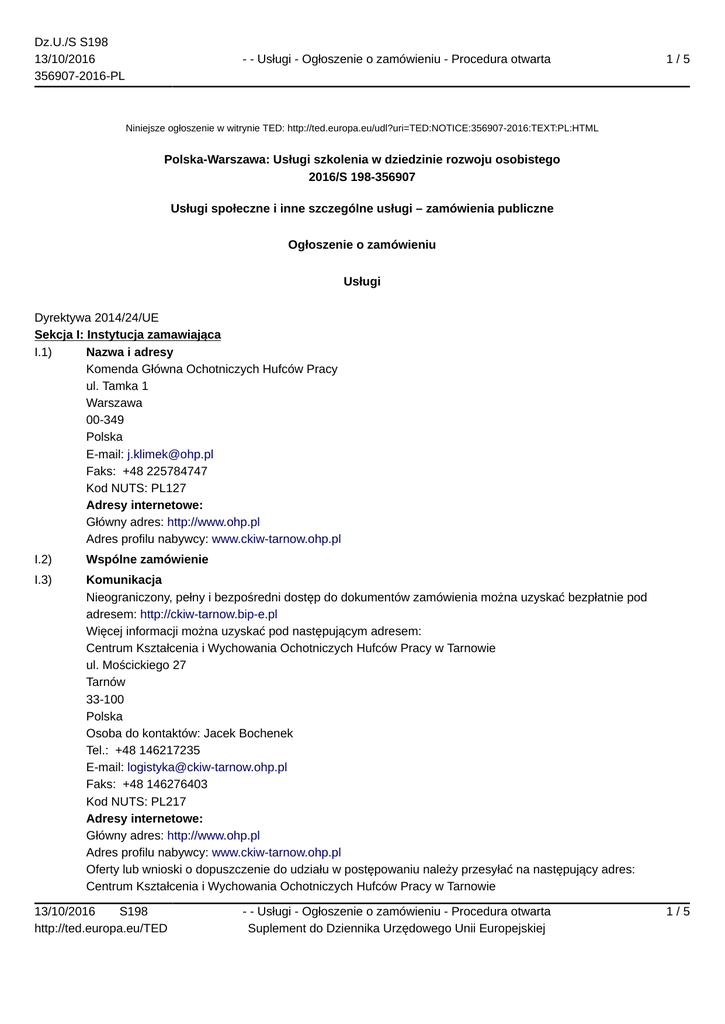 Dz.U./S S198 13/10/2016 356907-2016-PL - - Usługi - Ogłoszenie o zamówieniu - Procedura otwarta 1/5 Niniejsze ogłoszenie w witrynie TED: http://ted.europa.eu/udl?uri=TED:NOTICE:356907-2016:TEXT:PL:HTML Polska-Warszawa: Usługi szkolenia w dziedzinie rozwoju osobistego 2016/S 198-356907 Usługi społeczne i inne szczególne usługi – zamówienia publiczne Ogłoszenie o zamówieniu Usługi Dyrektywa 2014/24/UE Sekcja I: Instytucja zamawiająca I.1) Nazwa i adresy Komenda Główna Ochotniczych Hufców Pracy ul. Tamka 1 Warszawa 00-349 Polska E-mail: [email protected] Faks: +48 225784747 Kod NUTS: PL127 Adresy internetowe: Główny adres: http://www.ohp.pl Adres profilu nabywcy: www.ckiw-tarnow.ohp.pl I.2) Wspólne zamówienie I.3) Komunikacja Nieograniczony, pełny i bezpośredni dostęp do dokumentów zamówienia można uzyskać bezpłatnie pod adresem: http://ckiw-tarnow.bip-e.pl Więcej informacji można uzyskać pod następującym adresem: Centrum Kształcenia i Wychowania Ochotniczych Hufców Pracy w Tarnowie ul. Mościckiego 27 Tarnów 33-100 Polska Osoba do kontaktów: Jacek Bochenek Tel.: +48 146217235 E-mail: [email protected] Faks: +48 146276403 Kod NUTS: PL217 Adresy internetowe: Główny adres: http://www.ohp.pl Adres profilu nabywcy: www.ckiw-tarnow.ohp.pl Oferty lub wnioski o dopuszczenie do udziału w postępowaniu należy przesyłać na następujący adres: Centrum Kształcenia i Wychowania Ochotniczych Hufców Pracy w Tarnowie 13/10/2016 S198 http://ted.europa.eu/TED - - Usługi - Ogłoszenie o zamówieniu - Procedura otwarta Suplement do Dziennika Urzędowego Unii Europejskiej 1/5 Dz.U./S S198 13/10/2016 356907-2016-PL - - Usługi - Ogłoszenie o zamówieniu - Procedura otwarta 2/5 ul. Mościckiego 27 Tarnów 33-100 Polska Osoba do kontaktów: Jacek Bochenek Tel.: +48 146217235 E-mail: [email protected] Faks: +48 146276403 Kod NUTS: PL217 Adresy internetowe: Główny adres: http://www.ohp.pl Adres profilu nabywcy: www.ckiw-tarnow.ohp.pl I.4) Rodzaj instytucji zamawiającej Inny rodzaj: Jednostka budżetowa podległa MRPiPS I.5) Główny przedmiot działalności Edukacja Sekcja II: Przedmiot II.1) Wielkość lub zakres zamówienia II.1.1) Nazwa: Przeprowadzenie grupowego wsparcia psychologicznego – treningów i warsztatów, indywidualnych konsultacji oraz zajęć z zakresu zapobiegania depresji wśród młodzieży. Numer referencyjny: ZP-4/AA/YEI/2016 II.1.2) Główny kod CPV 80570000 II.1.3) Rodzaj zamówienia Usługi II.1.4) Krótki opis: Przedmiotem zamówienia na usługę społeczną będzie zorganizowanie i przeprowadzenie grupowego wsparcia psychologicznego – treningi i warsztaty dla 10 uczestników oraz w kontynuacji grupowych zajęć z psychologiem przeprowadzenie indywidualnych konsultacji psychologicznych dla 5 uczestników projektu, a następnie przeprowadzenie zajęć z zakresu zapobiegania depresji dla 10 uczestników projektu „Akcja Aktywizacja – YEI”. II.1.6) Informacje o częściach To zamówienie podzielone jest na części: tak Oferty można składać w odniesieniu do wszystkich części II.2) Opis II.2.1) Nazwa: Grupowe wsparcie psychologiczne -treningi i warsztaty i indywidualne wsparcie psychologiczne Część nr: 1 II.2.2) Dodatkowy kod lub kody CPV 80570000 II.2.3) Miejsce świadczenia usług Kod NUTS: PL217 II.2.4) Opis zamówienia: 13/10/2016 S198 http://ted.europa.eu/TED - - Usługi - Ogłoszenie o zamówieniu - Procedura otwarta Suplement do Dziennika Urzędowego Unii Europejskiej 2/5 Dz.U./S S198 13/10/2016 356907-2016-PL - - Usługi - Ogłoszenie o zamówieniu - Procedura otwarta 3/5 Przedmiotem zamówienia na usługę społeczną będzie zorganizowanie i przeprowadzenie grupowego wsparcia psychologicznego – treningi i warsztaty dla 10 uczestników oraz w kontynuacji grupowych zajęć z psychologiem przeprowadzenie indywidualnych konsultacji psychologicznych dla 5 uczestników projektu, a następnie przeprowadzenie zajęć z zakresu zapobiegania depresji dla 10 uczestników projektu „Akcja Aktywizacja – YEI” Zajęcia może prowadzić wyłącznie wykwalifikowany psycholog z tytułem magistra psychologii. Cena ofert brutto -60 % Klauzula społeczna – zatrudnienie minimum jednej osoby niepełnosprawnej na podstawie umowy o pracę – 10 % Doświadczenie -30 %. II.2.6) Szacunkowa wartość Wartość bez VAT: 1 897.00 PLN II.2.7) Okres obowiązywania zamówienia lub umowy ramowej Koniec: 15/12/2016 II.2.13) Informacje o funduszach Unii Europejskiej Zamówienie dotyczy projektu/programu finansowanego ze środków Unii Europejskiej: tak Numer identyfikacyjny projektu: POWR.01.03.01-00-0002/16. II.2.14) Informacje dodatkowe II.2) Opis II.2.1) Nazwa: Zajęcia z zakresu zapobiegania depresji wśród młodzieży Część nr: 2 II.2.2) Dodatkowy kod lub kody CPV 80570000 II.2.3) Miejsce świadczenia usług Kod NUTS: PL217 Główne miejsce lub lokalizacja realizacji: Tarnów. II.2.4) Opis zamówienia: Zajęcia z zakresu zapobiegania depresji wśród młodzieży. Zajęcia powinny być kontynuacją zajęć z psychologiem i stanowić odpowiedź na problemy z jakimi zmagają się młodzi ludzie. Potwierdza to odnotowany w ostatnich latach niepokojący wzrost zachorowalności na depresję wśród młodzieży. O ile depresja w okresie dojrzewania zdarza się dosyć często to obecnie problemy z nią związane (np. próby samobójcze, samookaleczenia) stały się na tyle poważne, że zaczęto ją nazywać „chorobą młodego pokolenia”. Ze względu na sytuację życiową, w jakiej znajdują się uczestnicy projektu, są oni szczególnie podatni na przygnębienie, zniechęcenie oraz poczucie braku sensu, a po pogłębieniu tego stanu i zachorowaniu na depresję, znalezienie zatrudnienia staje się niemożliwe, bo osoba która traci wiarę w siebie nie ma szansy zaprezentować się dobrze potencjalnemu pracodawcy. II.2.6) Szacunkowa wartość Wartość bez VAT: 587.00 PLN II.2.7) Okres obowiązywania zamówienia lub umowy ramowej Koniec: