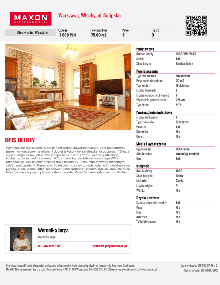 Warszawa, Włochy, ul. Solipska Mieszkanie - Wynajem Czynsz 2 600 PLN Powierzchnia 75.00 m2 Pokoi Piętro 3 0 Podstawowe Numer oferty 9133/MW/MAX Meble Tak Stan lokalu Bardzo dobry Pomieszczenia Typ mieszkania Mieszkanie Powierzchnia salonu 20 m2 Typ kuchni Oddzielna Liczba łazienek 1 Liczba oddzielnych toalet 1 Wysokość pomieszczeń 275 cm Typ okien PCV Powierzchnia dodatkowa OPIS OFERTY Wykończone mieszkanie w cenie mieszkania deweloperskiego. Jest przestronne, jasne i wykończone materiałami dobrej jakości - do zamieszkania od zaraz!!! Składa się z dużego pokoju ok.20m2, 2 sypialni ok. 16m2 i 11m2, sporej wydzielonej kuchni, dużej łazienki z wanną , WC, umywalką , dodatkowo osobnego WC i przedpokoju. Mieszkanie posiada duży balkon ok. 10m2 zabudowany ruchomymi szklanymi panelami. Kameralny 4 piętrowy budynek z cegły,jedynie 2 mieszkania na piętrze, duża ,jasna klatka schodowa.Cicha,zadbana i zielona okolica. Dookoła dużo terenów rekreacyjnych,placów zabaw i sportu ,Park Cietrzewia,Koziorożca, Archer. Liczba balkonów 1 Typ balkonów Klasyczny Piwnica Tak Komórka Nie Ogród Nie Media i wyposażenie Ogrzewanie CO własne Ciepła woda Wodociąg miejski Gaz Tak Budynek Rok budowy 1990 Stan budynku Dobry Materiał Cegła Liczba pięter 4 Winda Nie Czynsz zawiera: Czynsz administracyjny Tak Prąd Nie Gaz Nie Internet Nie TV kablowa/sat. Nie Weronika Jurga Weronika Jurga tel. 746 469 620 [email protected] Niniejsze warunki mają charakter wyłącznie informacyjny i nie stanowią oferty w rozumieniu Kodeksu Cywilnego. MAXON Nieruchomości Sp. z o o. ul. Powązkowska 44C, 01-797 Warszawa Tel: (22) 530 60 00 e-mail: [email protected] www.maxon.pl Data wydruku: 2017-03-07 05:42 Numer oferty: 9133/MW/MAX